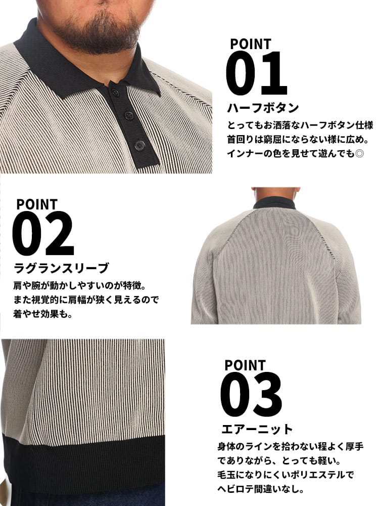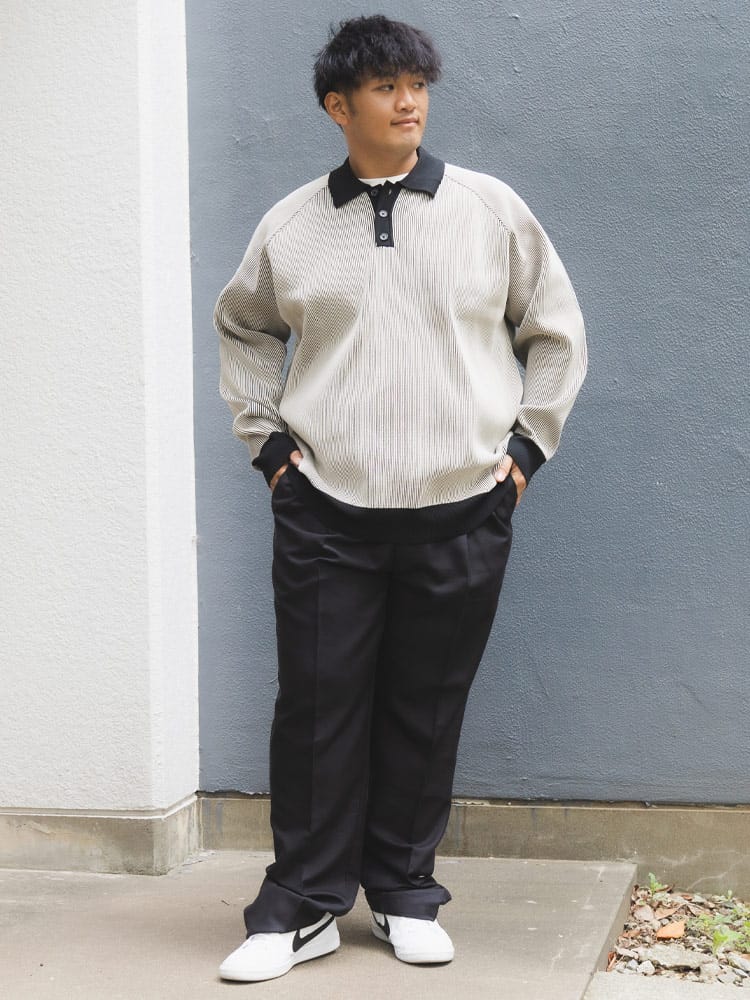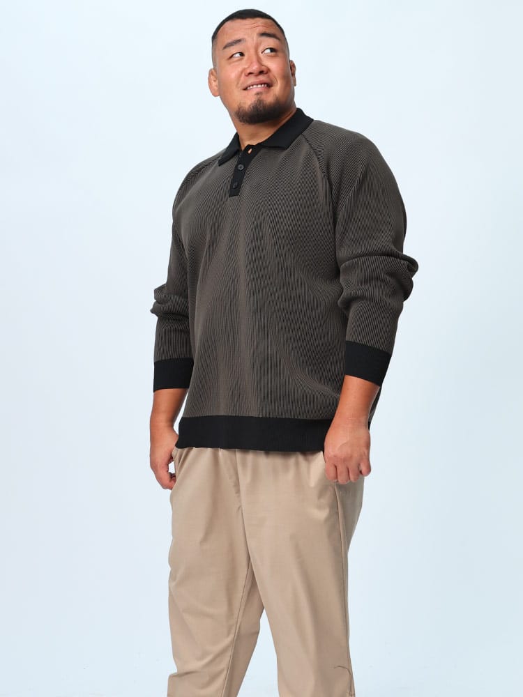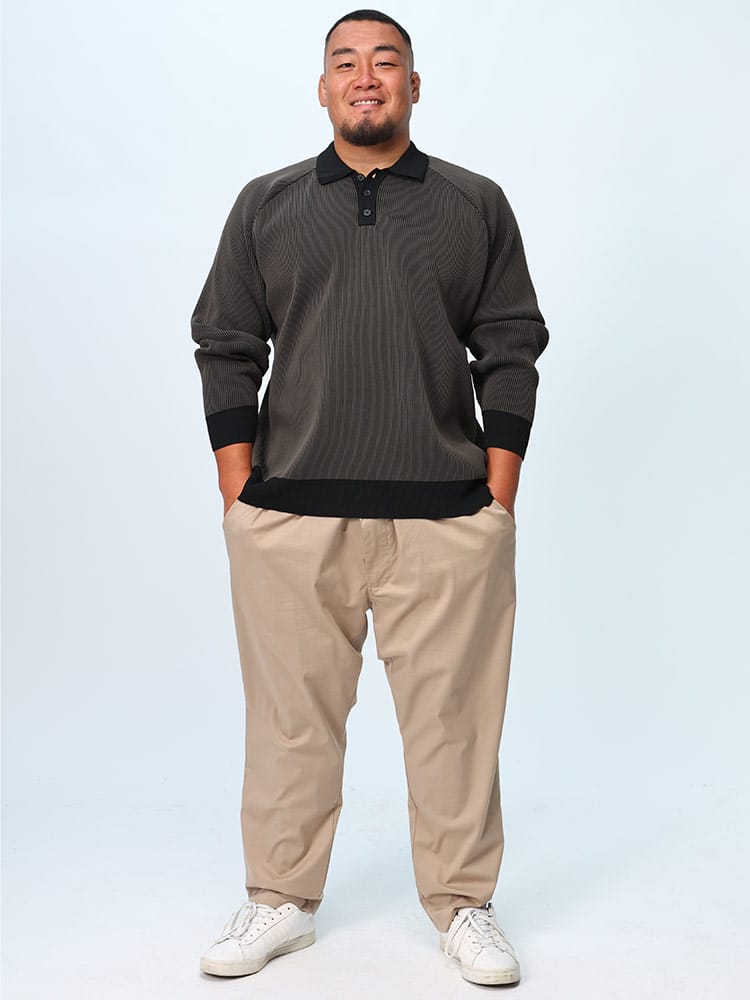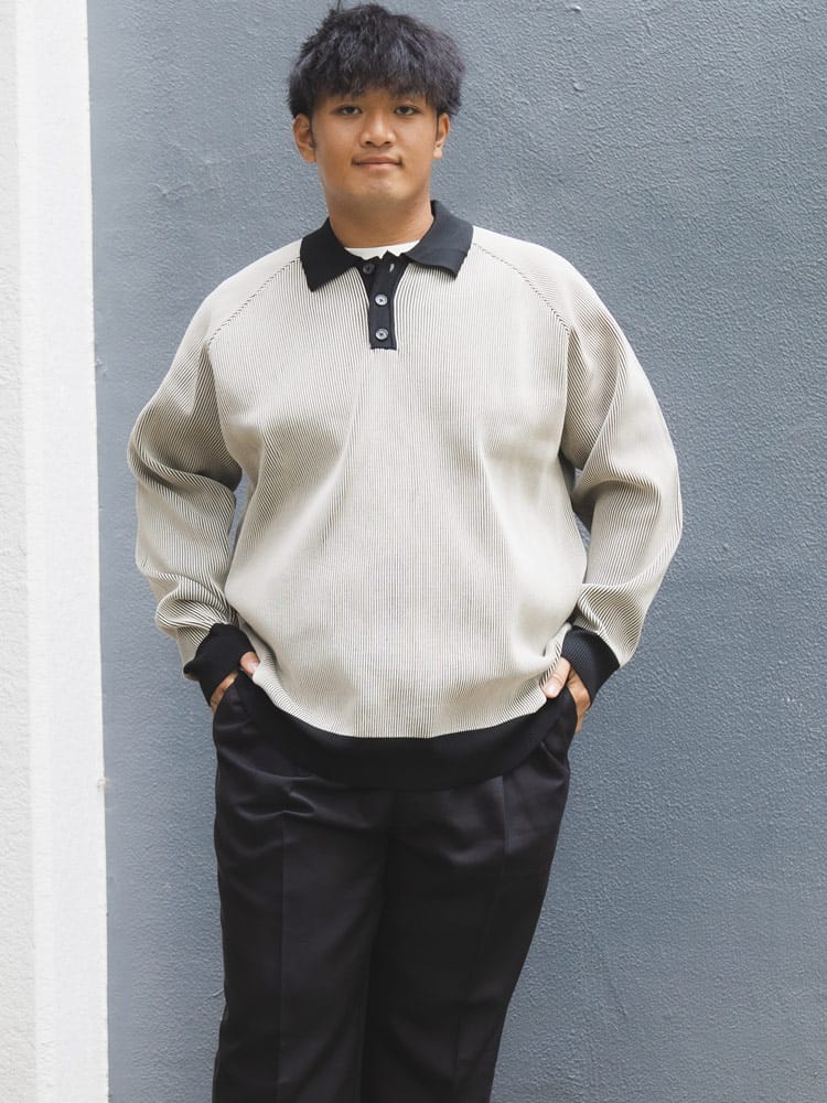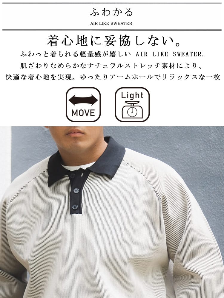 この長袖エアーニットポロは、軽量でストレッチ性に優れた快適なアイテムです。柔らかな素材感が特徴で、長時間の着用でも疲れにくいです。リブ編みのデザインはシンプルでありながらもエレガントで、カジュアルからビジネスカジュアルまで幅広いスタイルに対応します。軽やかな着心地と動きやすさを兼ね備えており、日常の様々なシーンで活躍します。
