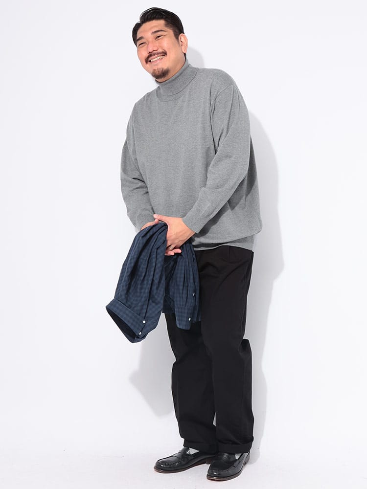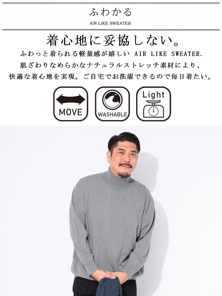 「まるでカシミヤ!」と錯覚するほどの極上の肌触りを追求した、B&T CLUBのタートルネックニットセーター。この天竺編みニットは、驚くほど軽量で、一度着たら手放せなくなる心地よさです。首元を優しく包み込むタートルネックは、暖かさだけでなく上品な印象もプラスします。さらに、嬉しいストレッチ性で動きやすさも抜群です。グレーとブラックのベーシックカラーは、どんなコーディネートにも合わせやすく、幅広いシーンで活躍します。ご自宅で洗濯可能なウォッシャブル仕様なので、お手入れも簡単。大きいサイズもご用意しました。この冬、毎日でも着たくなる「ふわかる」ニットで、快適なおしゃれをお楽しみください。