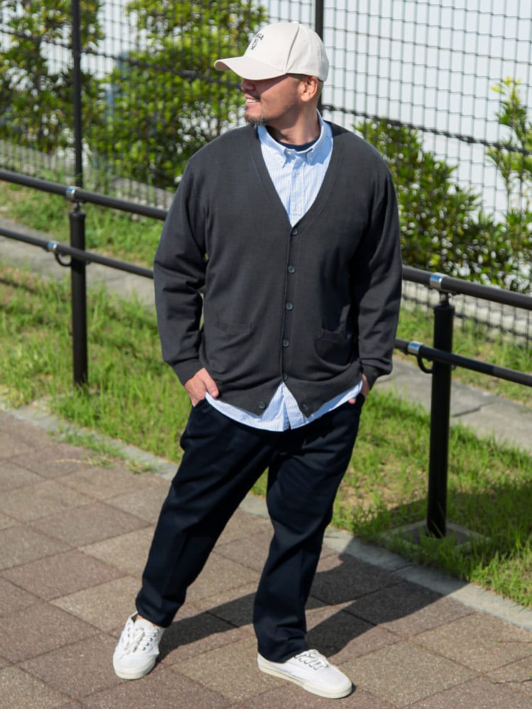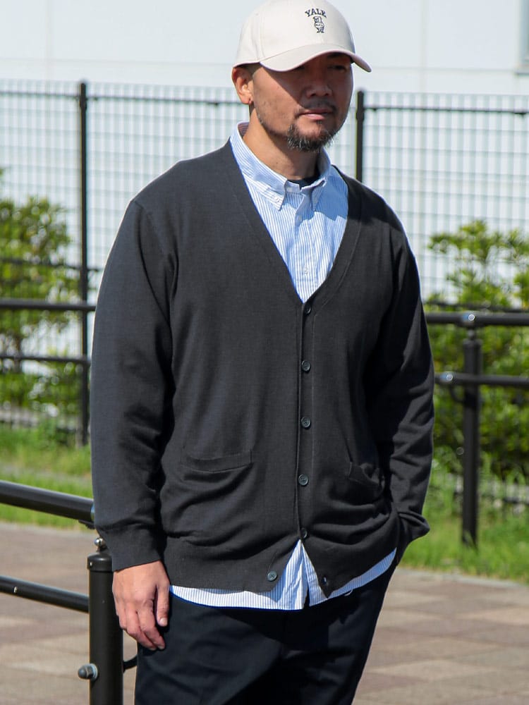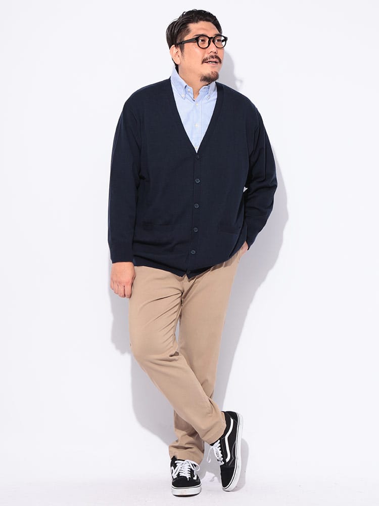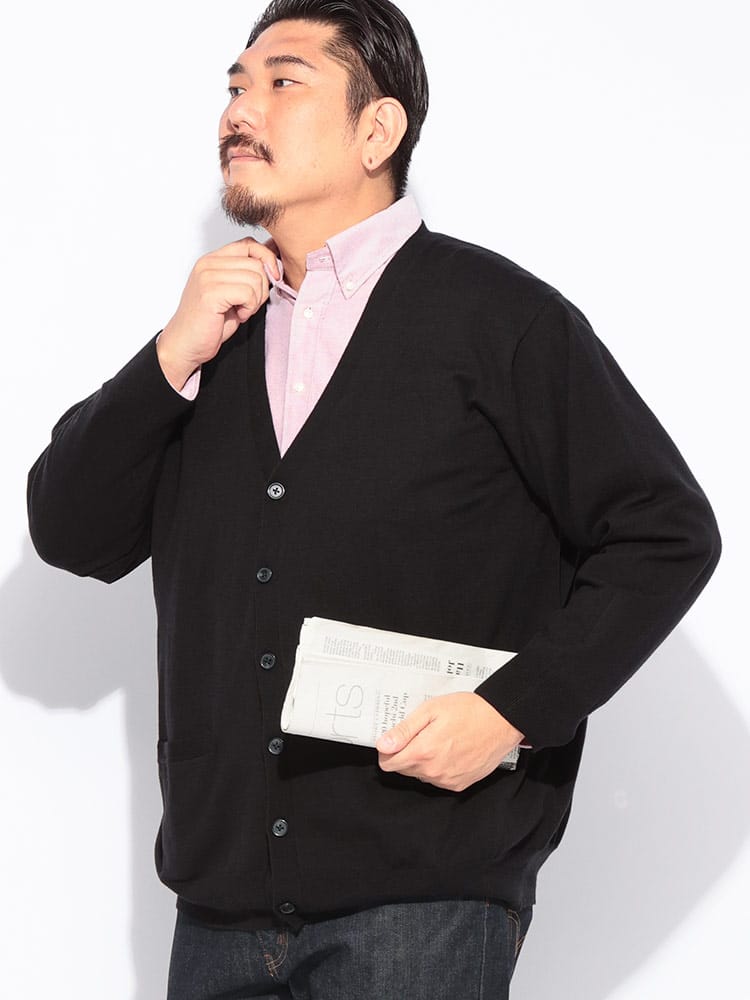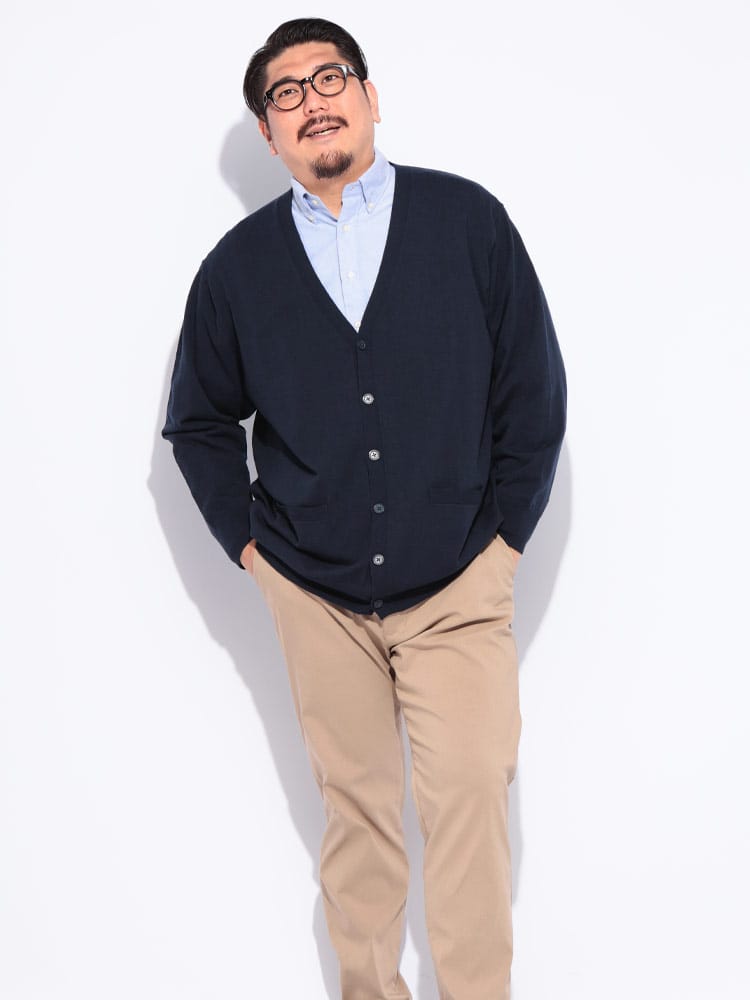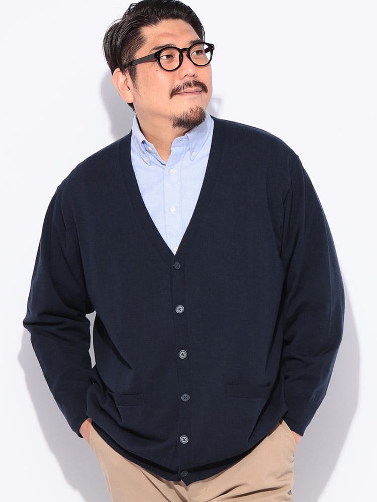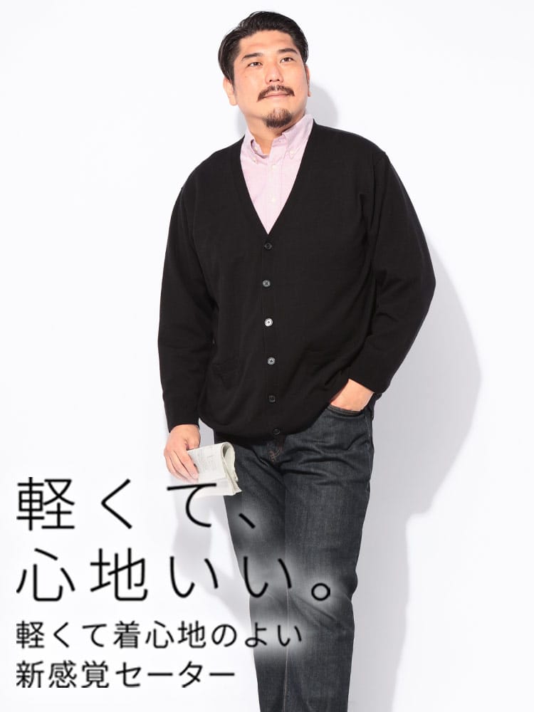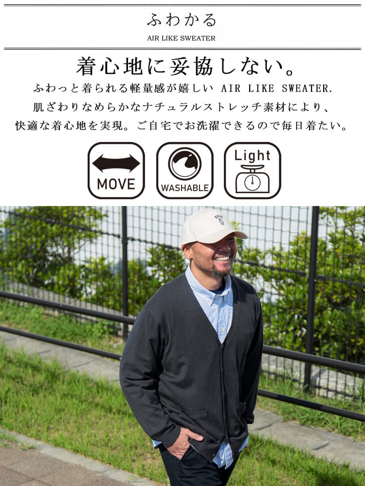 大人の余裕と快適さを纏う一着。季節の変わり目に重宝すること間違いなし! ふわりと軽やかな肌触りと、まるでカシミヤのようななめらかな質感は、各素材を絶妙にブレンドした素材ならでは。袖を通した瞬間に、その心地よさに包まれます。深すぎないVネックは、インナーを選ばず幅広いコーディネートに対応。シャツやTシャツの上に羽織るだけで、上品なスタイルが完成します。さらに、外側ポケットが2つ付いているため、ちょっとした小物を収納するのに便利。そして、ご家庭で手軽に洗濯できるウォッシャブル仕様なのも嬉しいポイントです。忙しい毎日を送る大人にとって、お手入れのしやすさは重要な要素です。大きいサイズまで展開しているので、体格の良い方も安心。