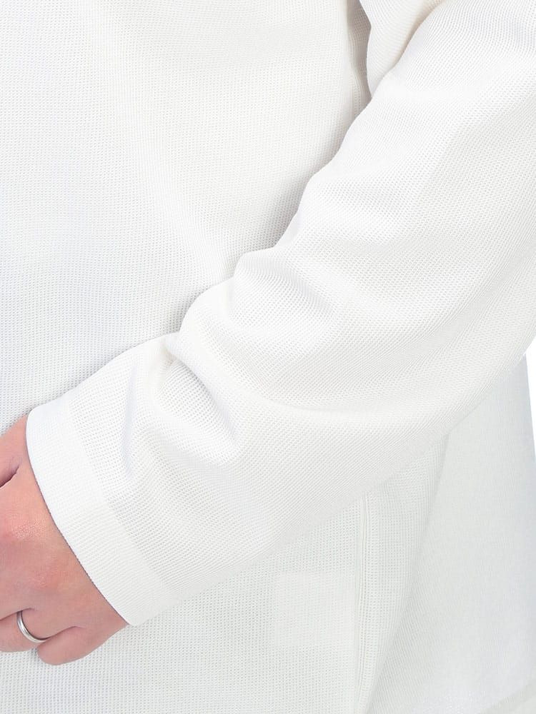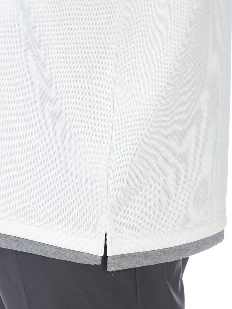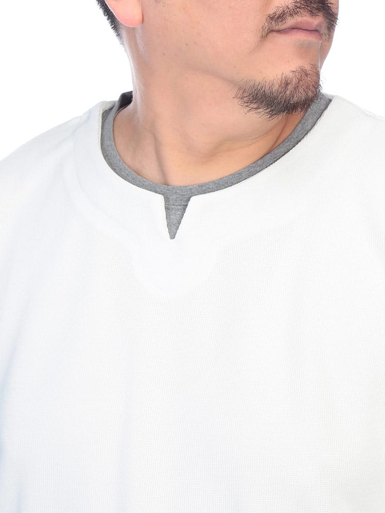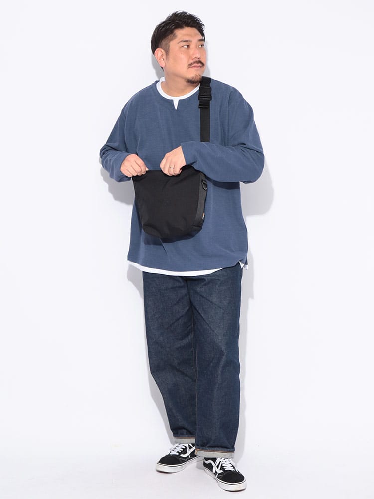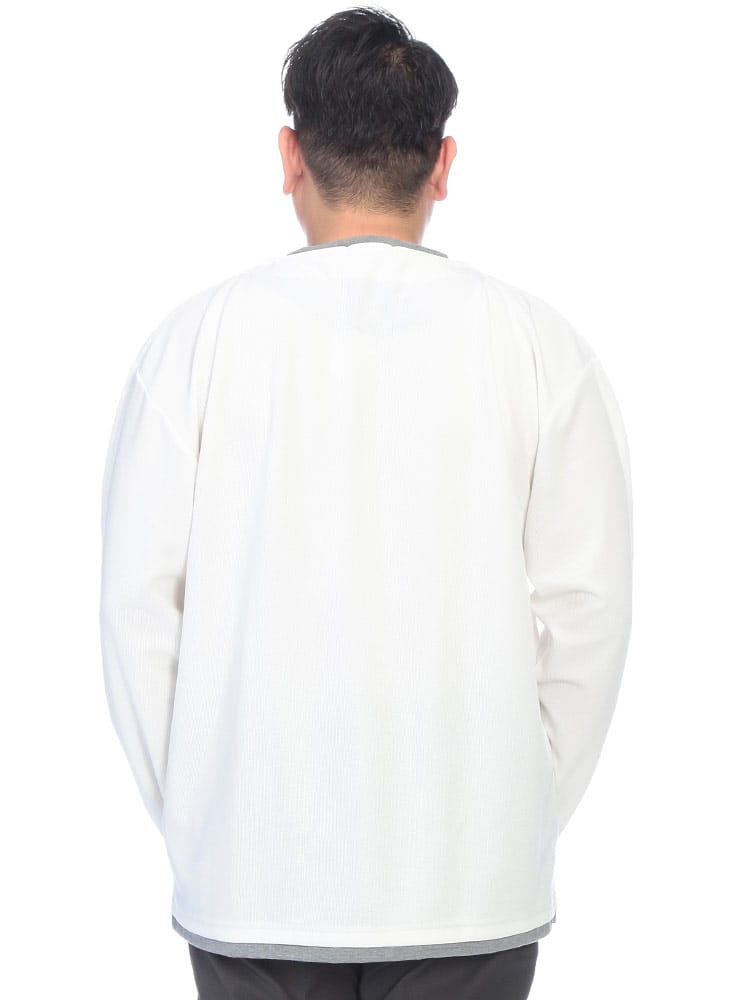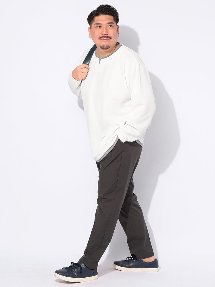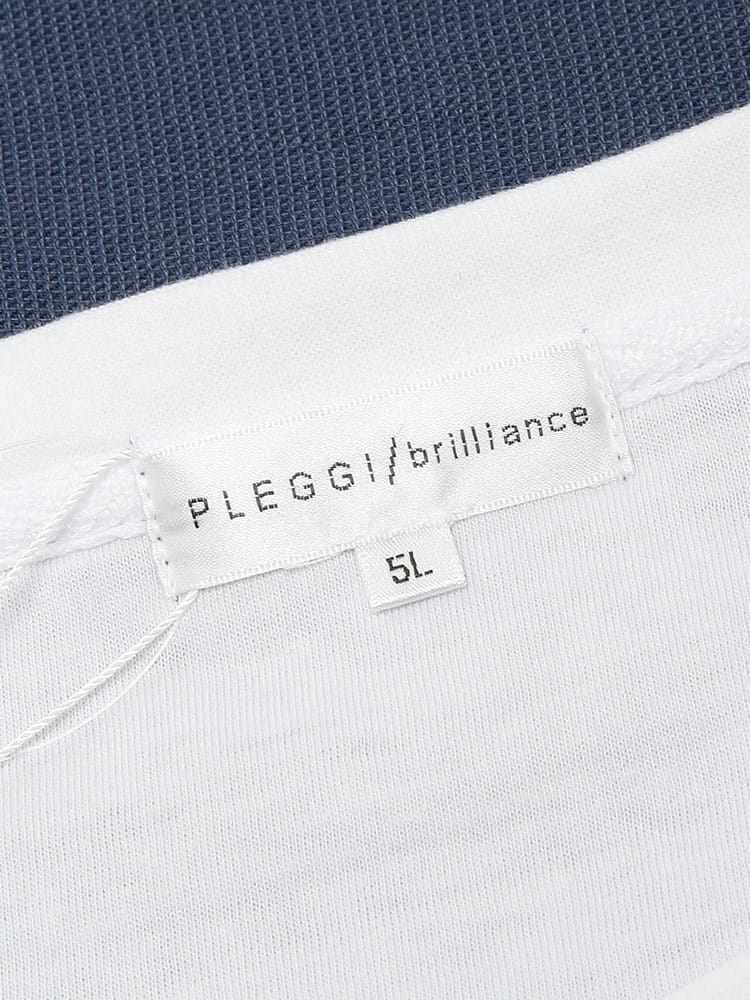 首元に抜け感を演出するキーネックが特徴的な、PLEGGIの長袖Tシャツ。襟元や裾に別布を配したフェイクレイヤード仕様で、一枚着るだけで計算された重ね着スタイルが完成します。立体感のあるジャガード生地が上品な印象を与え、大きいサイズならではのリラックスした着心地も魅力。春夏のメインアイテムからインナー使いまで幅広く活躍します。程よい個性が光るデザインで、大人のカジュアル装いを格上げする一着です。