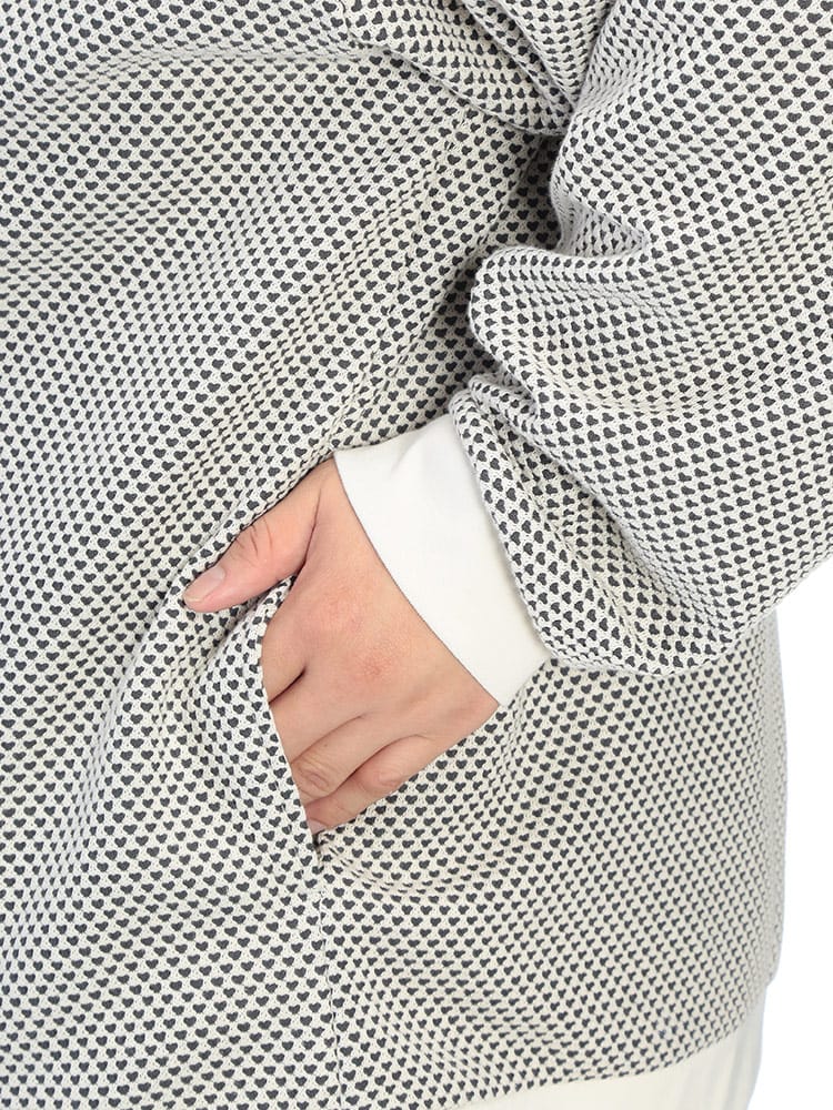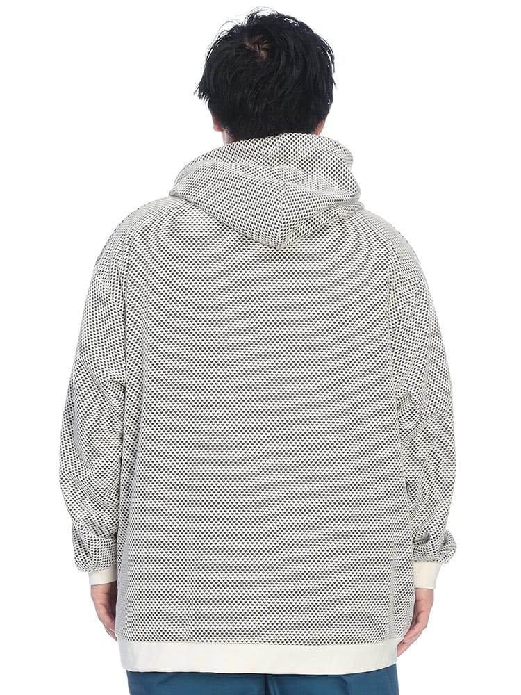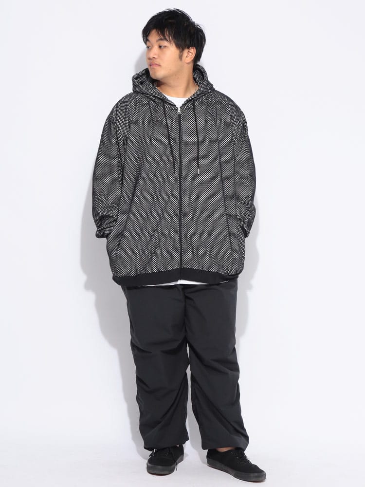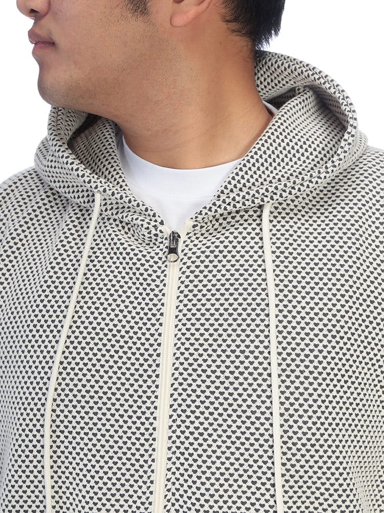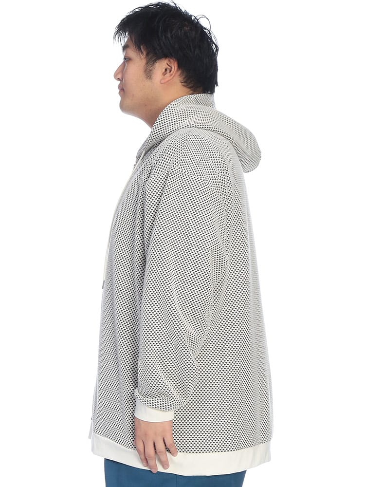 「PLEGGI(プレッジ)」から、表情豊かなバーズアイジャガード生地を使用した、大人のためのフルジップパーカーをご紹介します。鳥の目のような微細な模様が並ぶ「バーズアイ」柄は、無地にはない奥行きと上品な質感を演出し、スウェットとは一線を画す落ち着いた印象を与えてくれます。大きいサイズ設計によるリラックスした着心地ながら、ジャガード織り特有の程よいハリ感がスマートなシルエットをキープ。春や秋の軽めのアウターとして、羽織るだけでこなれたコーディネートが完成します。フルジップ仕様で着脱もスムーズに行え、カジュアルなデニムからきれいめのスラックスまで、幅広いスタイルに馴染む汎用性の高い一着です。
