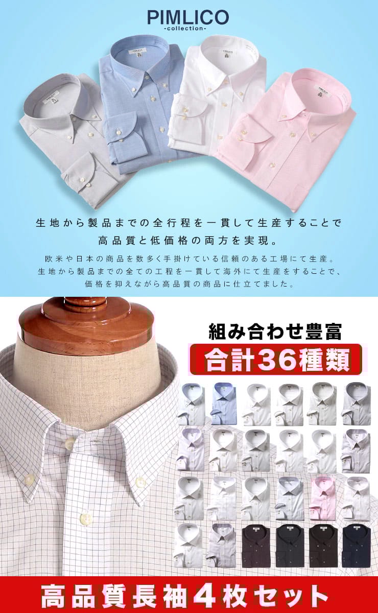 爽やかな無地やストライプ柄で仕上げた4枚セットの長袖ワイシャツです。丈夫でゆったりと着用でき、長く愛用していただけるワイシャツです。毎日スーツを着用するビジネスマンにおすすめの一品。豊富なバリエーションなので違う色、柄で揃えておくと便利です。