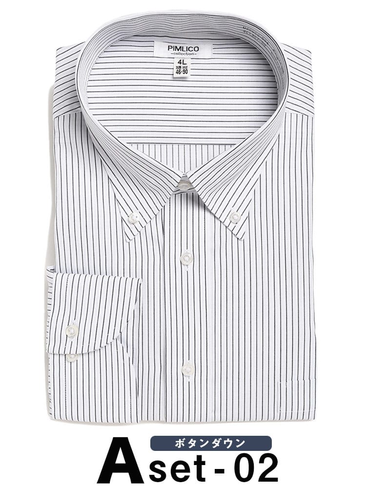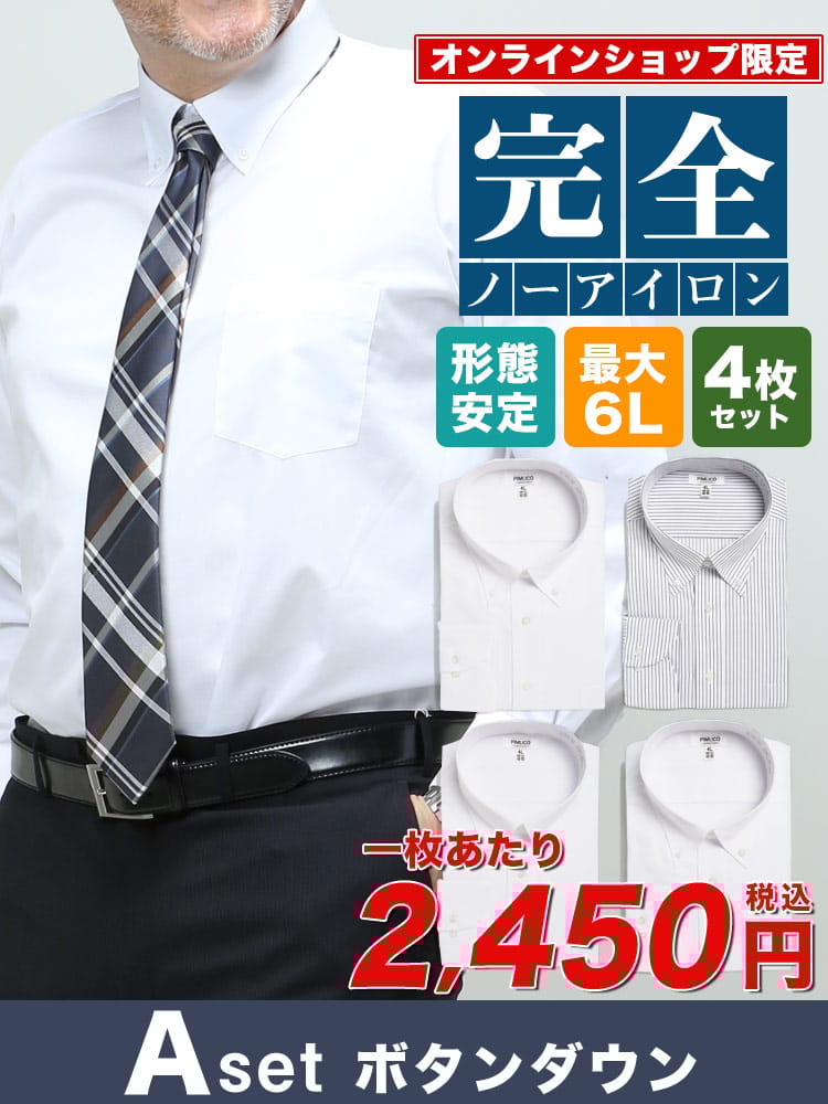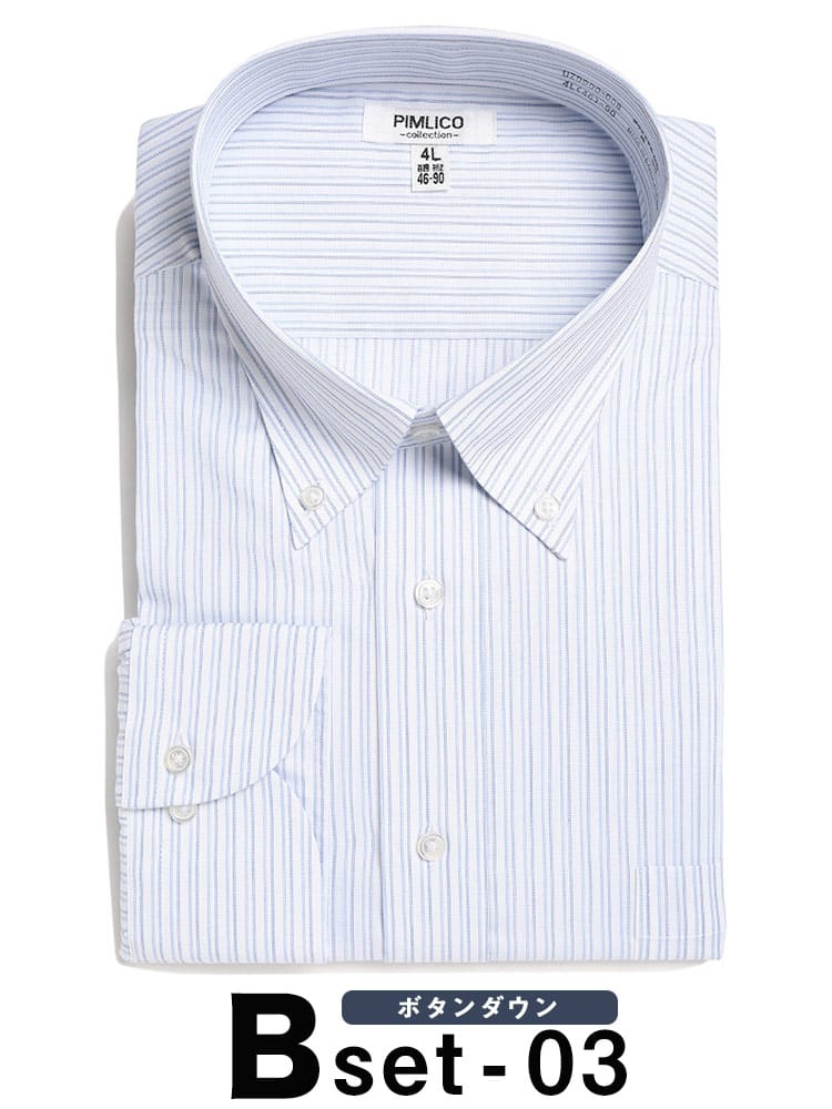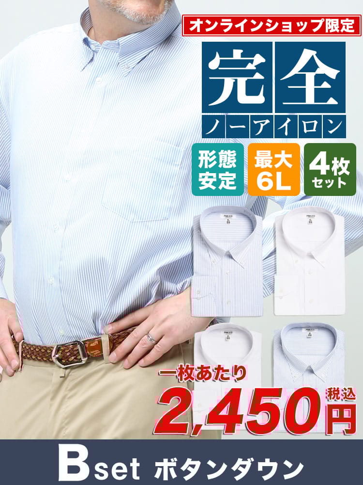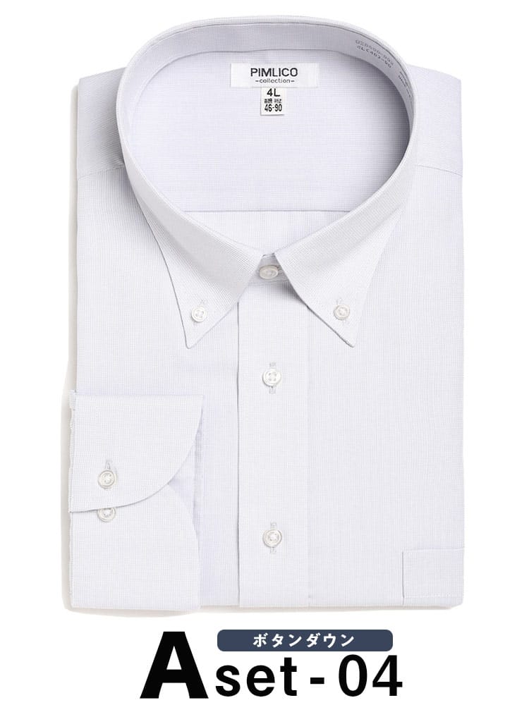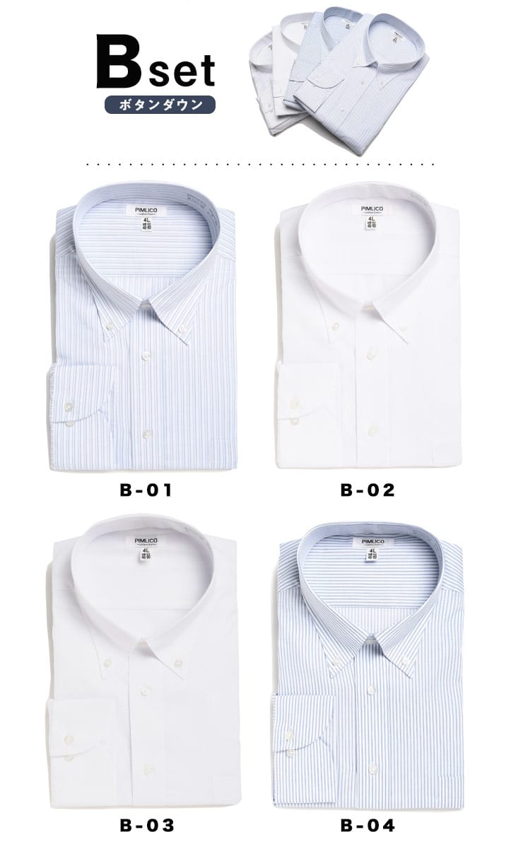 アイロンをかけなくてもシワなしの新鮮な着用感を保てる形態安定の長袖ワイシャツ。ボタンダウンとワイドカラーの2タイプから選べる。定番で使える無地タイプと、オシャレ感を楽しめるストライプタイプを組み合わせた選べる4枚セット。組み合わせパターンは4種類あり、ベーシックなルックスで、ビジネスシーンにはもちろんきれいめなスタイルにも合わせていただけます。毎日着るビジネスマンやアイロン嫌いの方にはおすすめの形態安定加工なので綺麗なフォルムを保ったまま着用することができます。ビジネスにはもちろん、パーティーなどの華やかなオケージョンにもお使いいただけます。スタンダードなBASIC BODY。豊富なバリエーションなので、違う色、柄で揃えておくと便利です。