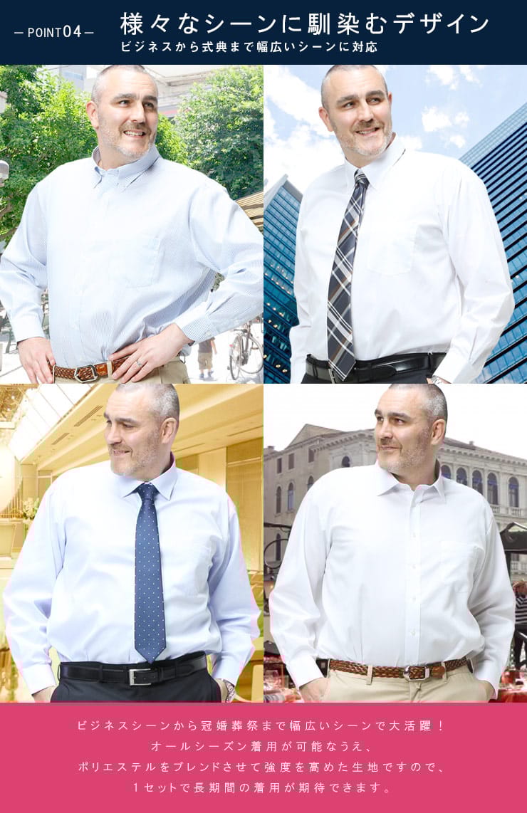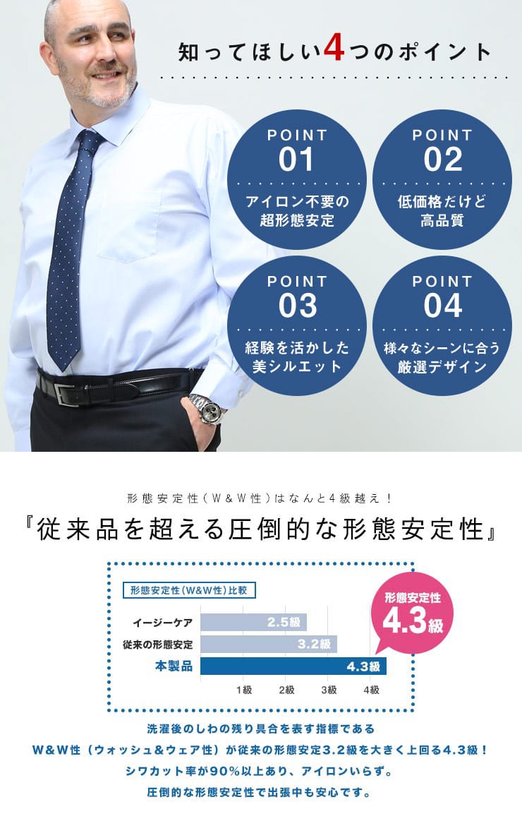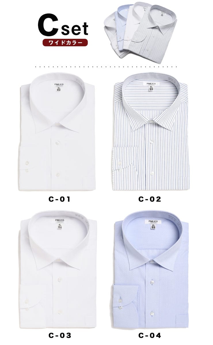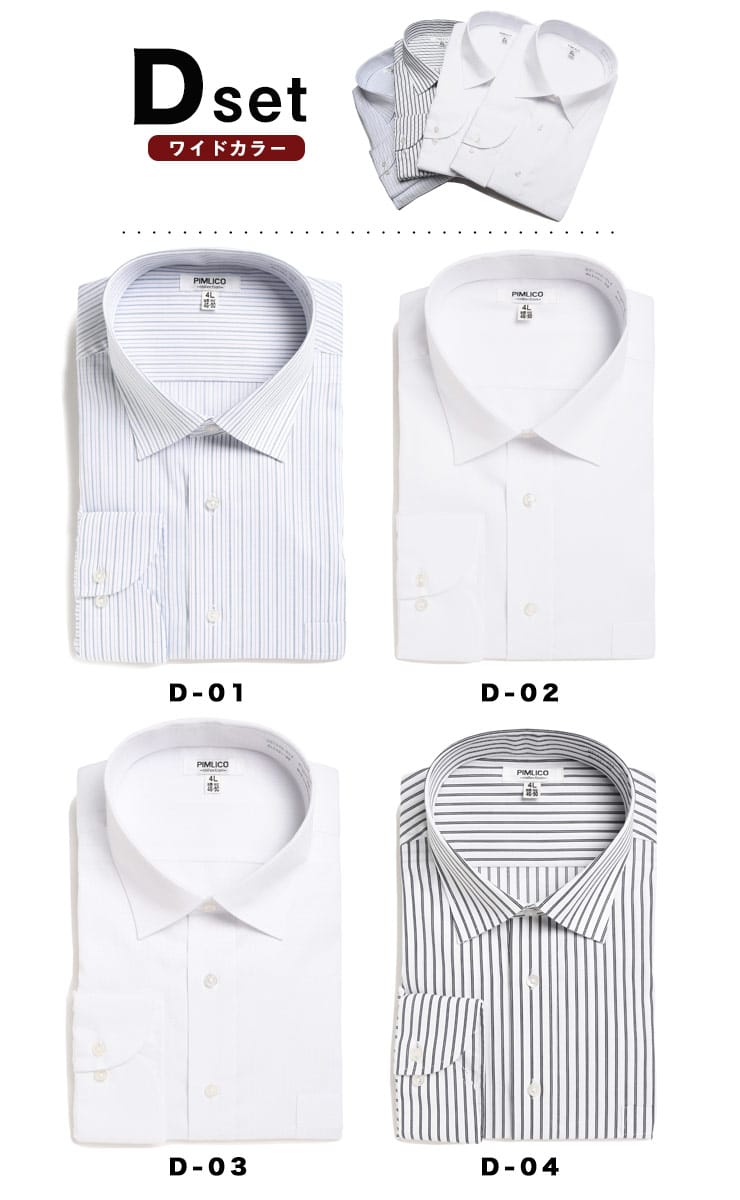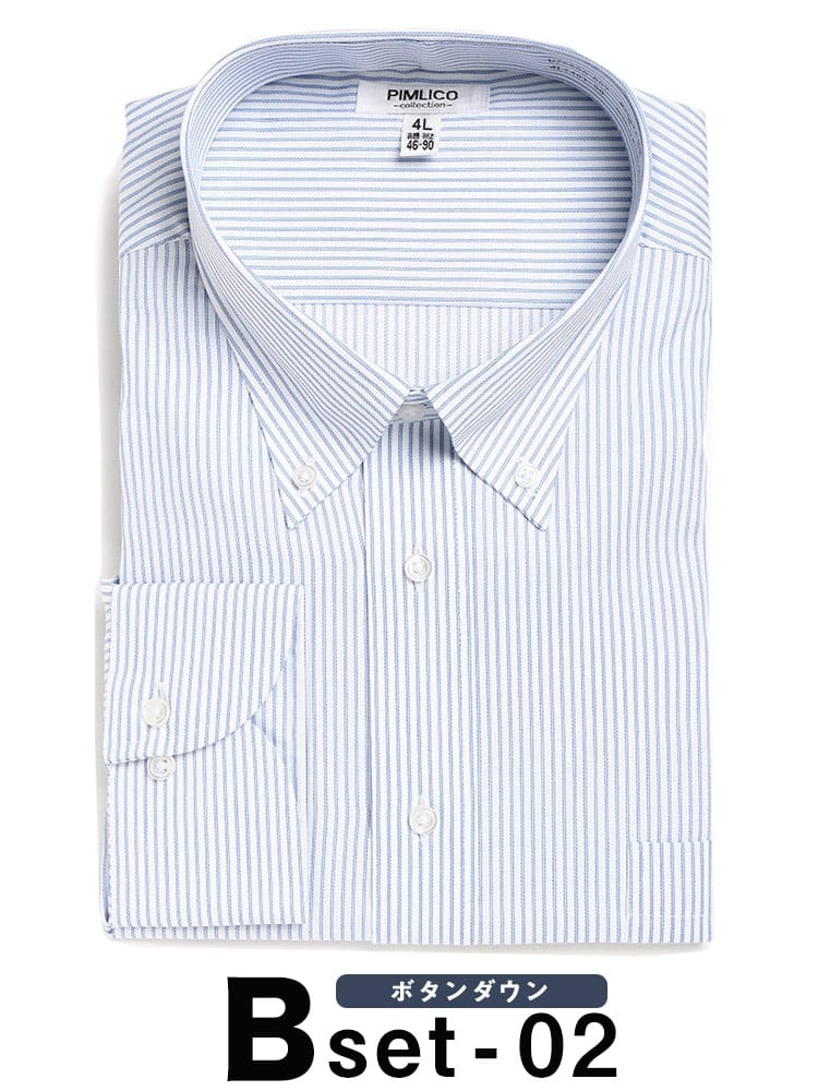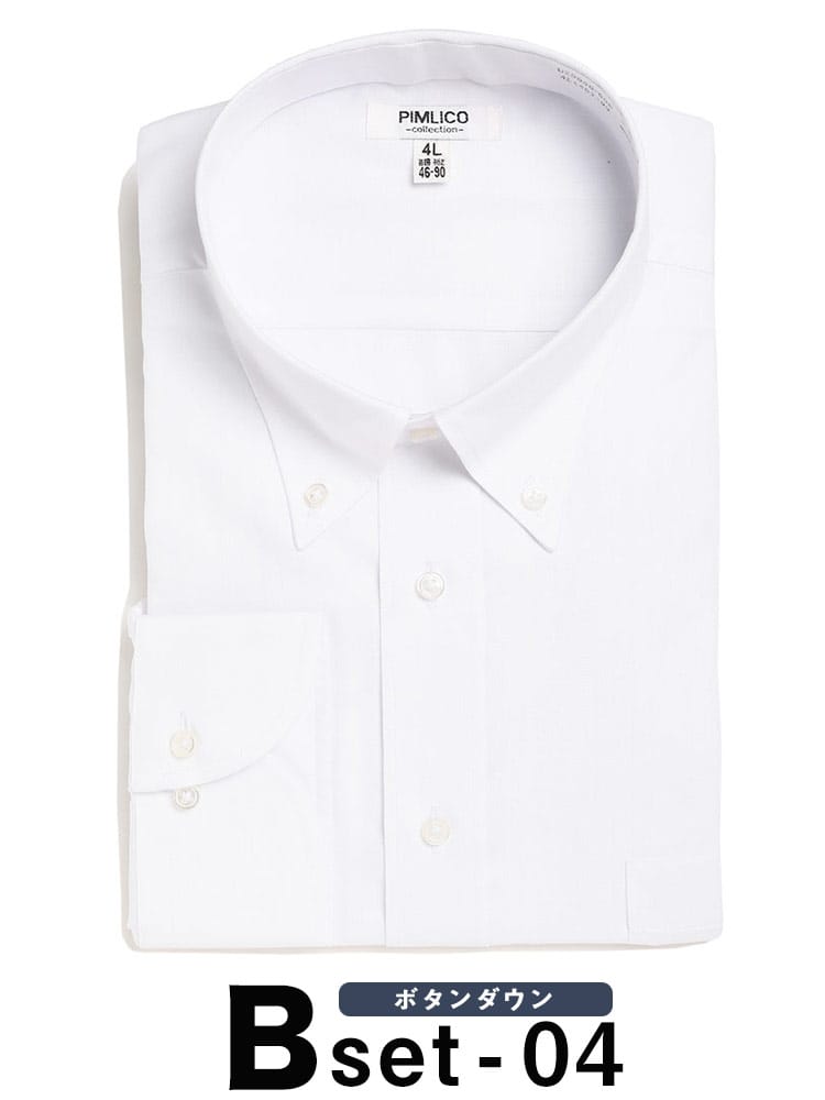 アイロンをかけなくてもシワなしの新鮮な着用感を保てる形態安定の長袖ワイシャツ。ボタンダウンとワイドカラーの2タイプから選べる。定番で使える無地タイプと、オシャレ感を楽しめるストライプタイプを組み合わせた選べる4枚セット。組み合わせパターンは4種類あり、ベーシックなルックスで、ビジネスシーンにはもちろんきれいめなスタイルにも合わせていただけます。毎日着るビジネスマンやアイロン嫌いの方にはおすすめの形態安定加工なので綺麗なフォルムを保ったまま着用することができます。ビジネスにはもちろん、パーティーなどの華やかなオケージョンにもお使いいただけます。スタンダードなBASIC BODY。豊富なバリエーションなので、違う色、柄で揃えておくと便利です。