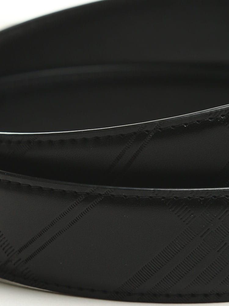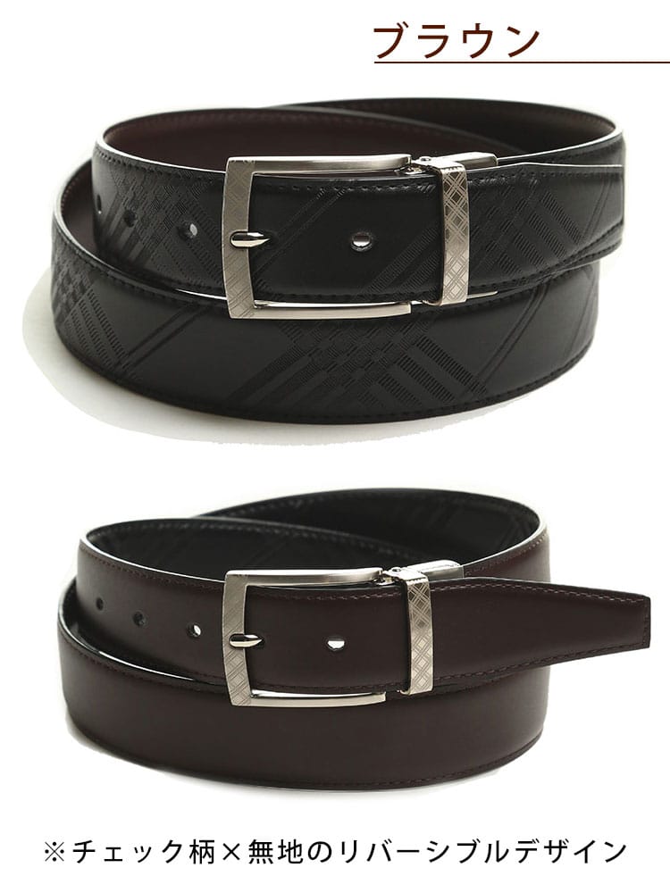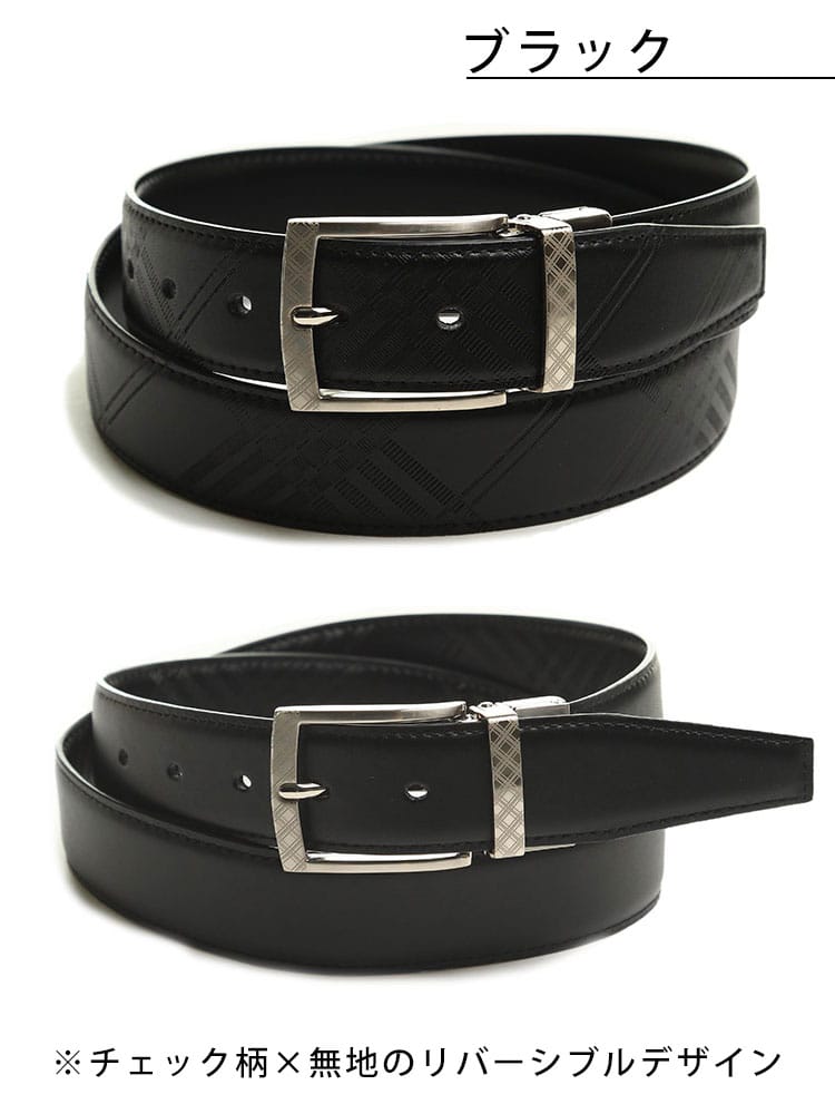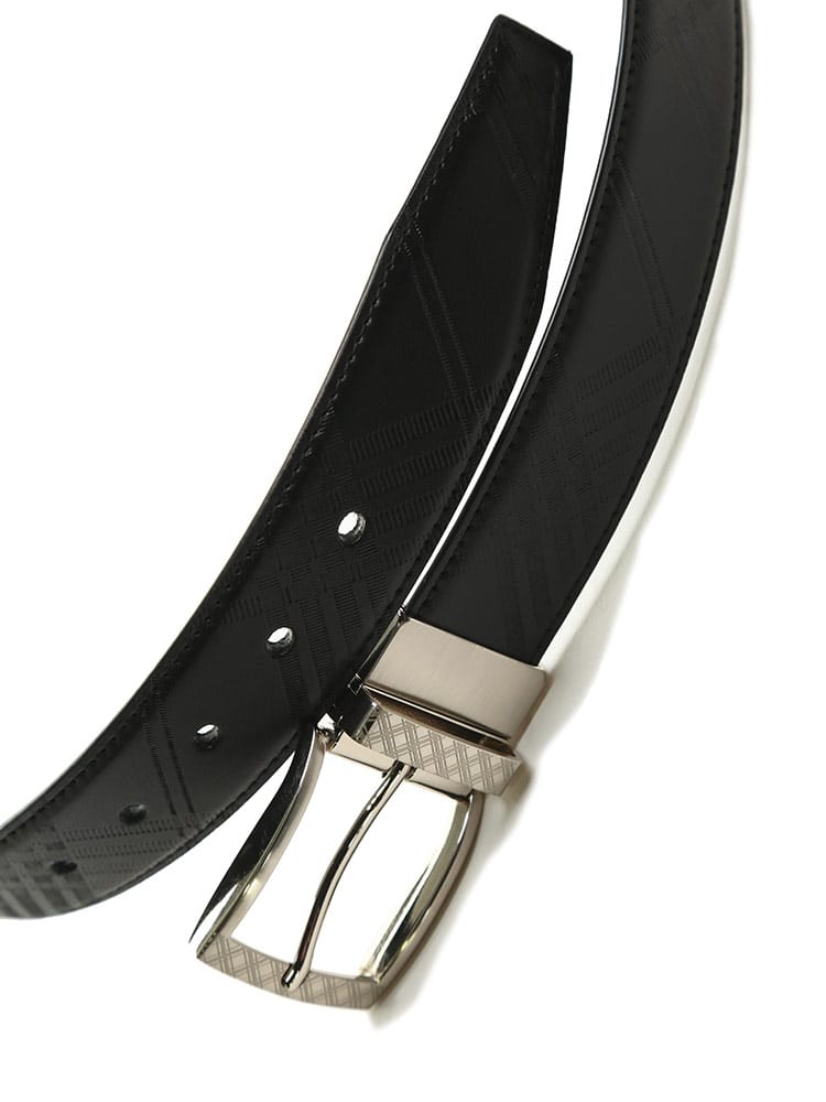 リバーシブルデザインでビジネスにもカジュアルにも使っていただけるベルト。片面はチェック柄でもう片面は無地のデザイン。バックルにはチェック柄デザイン。しなやかなストレッチの効いた牛革を使用しているので、ジャストフィットでご着用いただけます。流行り廃りが無いデザインで長く愛用していただけます。贈り物としもおすすめです。