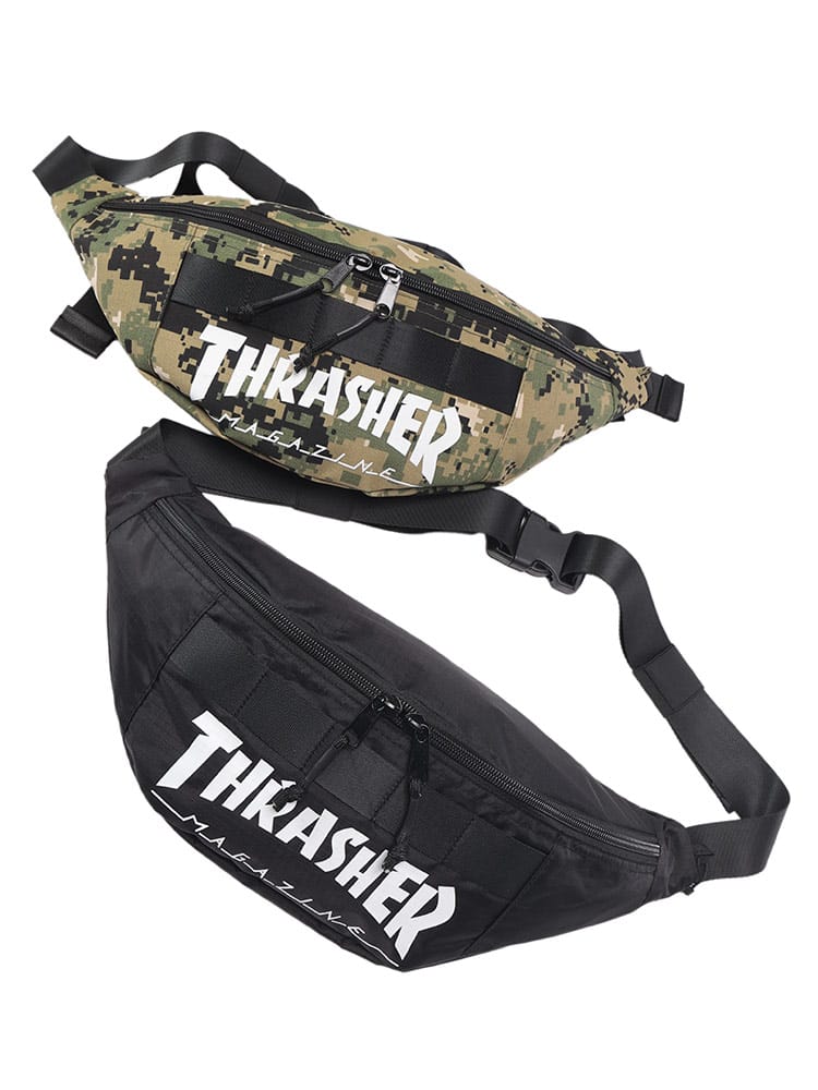 ロゴプリント迷彩柄ウエストバッグは、ストリートスタイルにぴったりのアイテムです。インパクトのある迷彩柄に、THRASHERのロゴプリントがアクセントになっています。コンパクトながらも収納力があり、スマートフォンや財布などの必需品を収納可能。ウエストベルトは長さ調節可能で、体にフィットさせて使用できます。