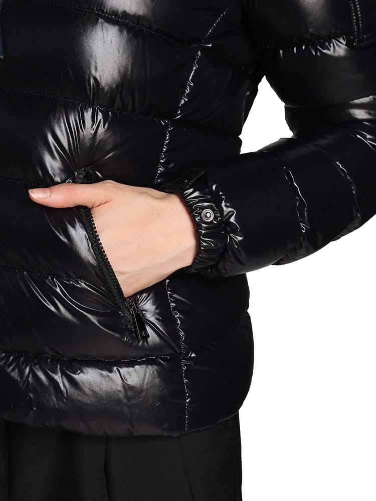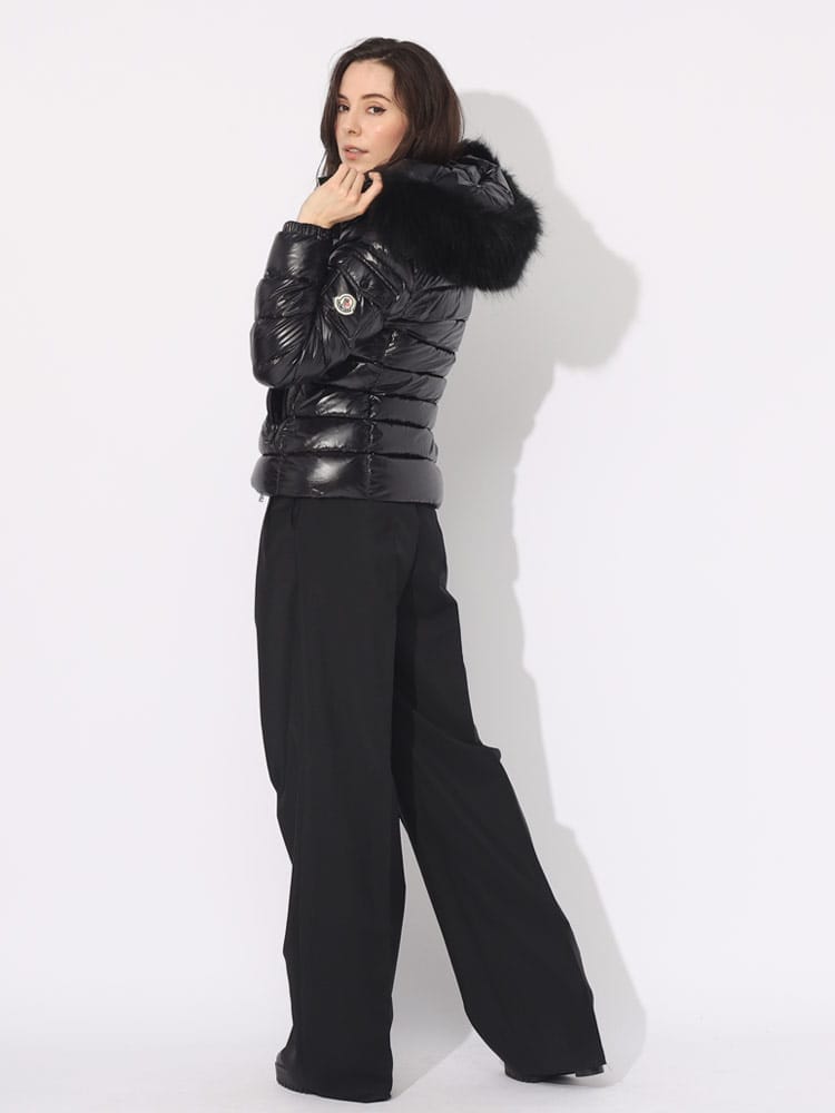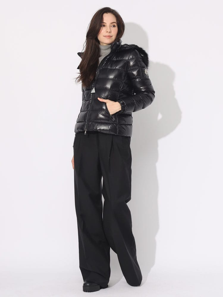 コレクションのクリーンで視覚効果の高い外観に沿うBadyfショートダウンジャケットは、スリムフィットで、ナイロンラケ素材を使用しています。風合いで遊びを見せる艶やかなダウンジャケットは、フードにフェイクファーのトリミングをあしらい、気温や装う方のムードに合わせて簡単に取り外し可能です。