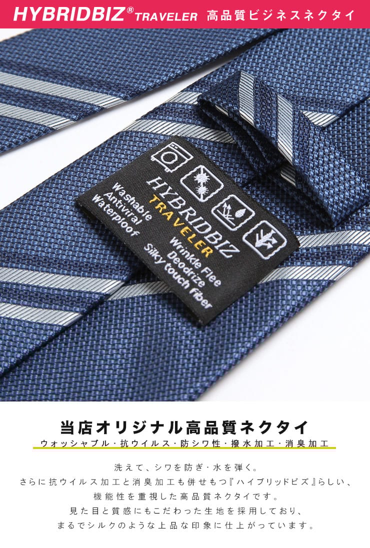 出張や旅行に便利な機能を搭載したHYBRIDBIZのネクタイです。ご家庭でお手入れが簡単に出来る「ウォッシャブル機能」、「抗ウイルス」、「水を弾きやすくする撥水加工」、「ラフに扱ってもシワになりづらい加工」、「消臭加工」と快適機能満載の文句なしの一本。シルクタッチの品のある質感で首元に華やかさをプラスします。