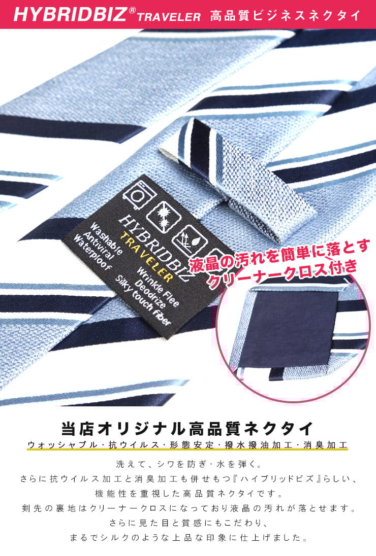 出張や旅行に便利な機能を搭載したHYBRIDBIZのネクタイです。ご家庭でお手入れが簡単に出来る「ウォッシャブル機能」、「抗ウイルス」、「水を弾きやすくする撥水加工」、「ラフに扱ってもシワになりづらい形態安定加工」と快適機能満載の文句なしの一本。ネクタイの剣先裏はスマホクリーナーとしてお使いいただけます。ご自分用にはもちろん贈り物としてもおすすめです。