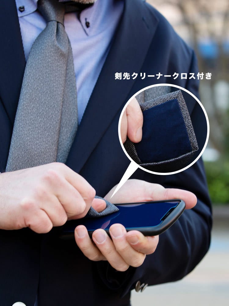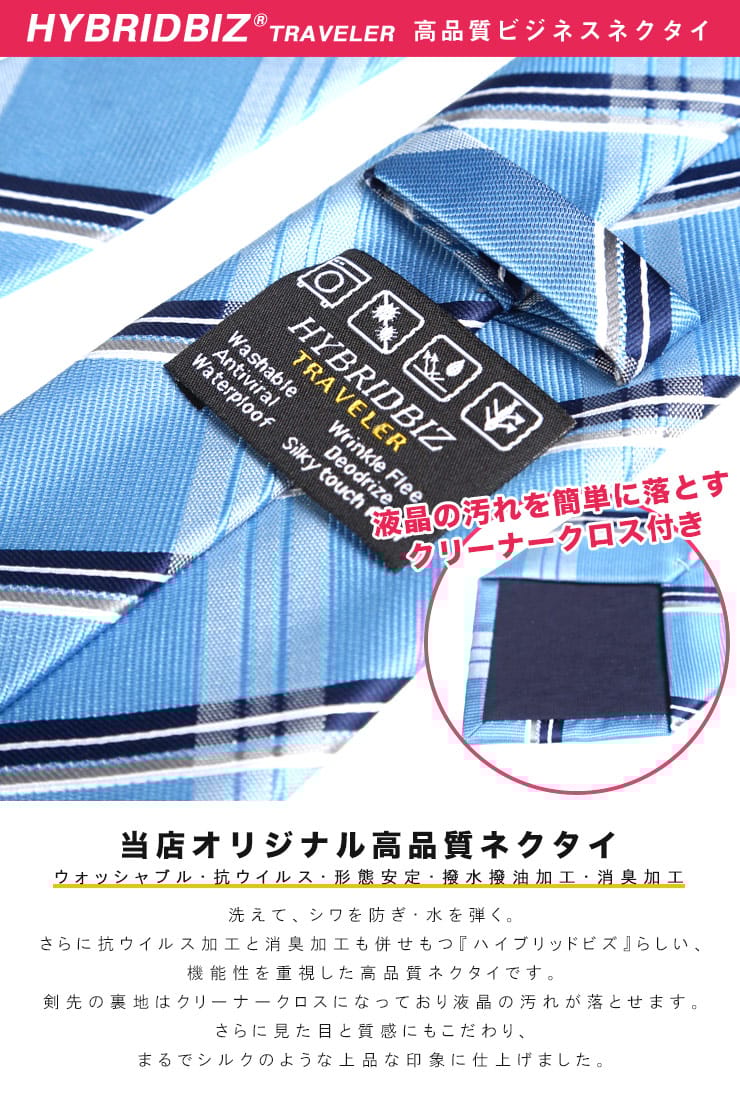 出張や旅行に便利な機能を搭載したHYBRIDBIZのネクタイです。ご家庭でお手入れが簡単に出来る「ウォッシャブル機能」、「抗ウイルス」、「水を弾きやすくする撥水加工」、「ラフに扱ってもシワになりづらい形態安定加工」と快適機能満載の文句なしの一本。ネクタイの剣先裏はスマホクリーナーとしてお使いいただけます。ご自分用にはもちろん贈り物としてもおすすめです。