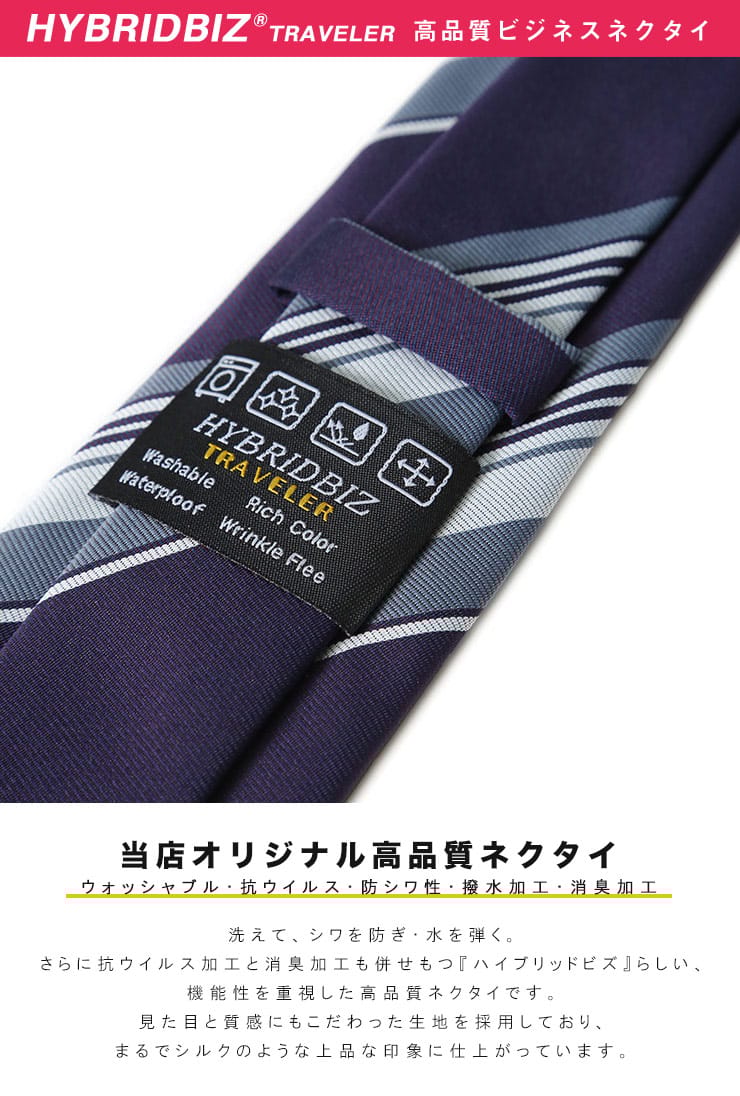 出張や旅行に便利な機能を搭載したHYBRIDBIZのネクタイです。ご家庭でお手入れが簡単に出来る「ウォッシャブル機能」、「抗ウイルス」、「水を弾きやすくする撥水加工」、「ラフに扱ってもシワになりづらい形態安定加工」と快適機能満載の文句なしの一本。