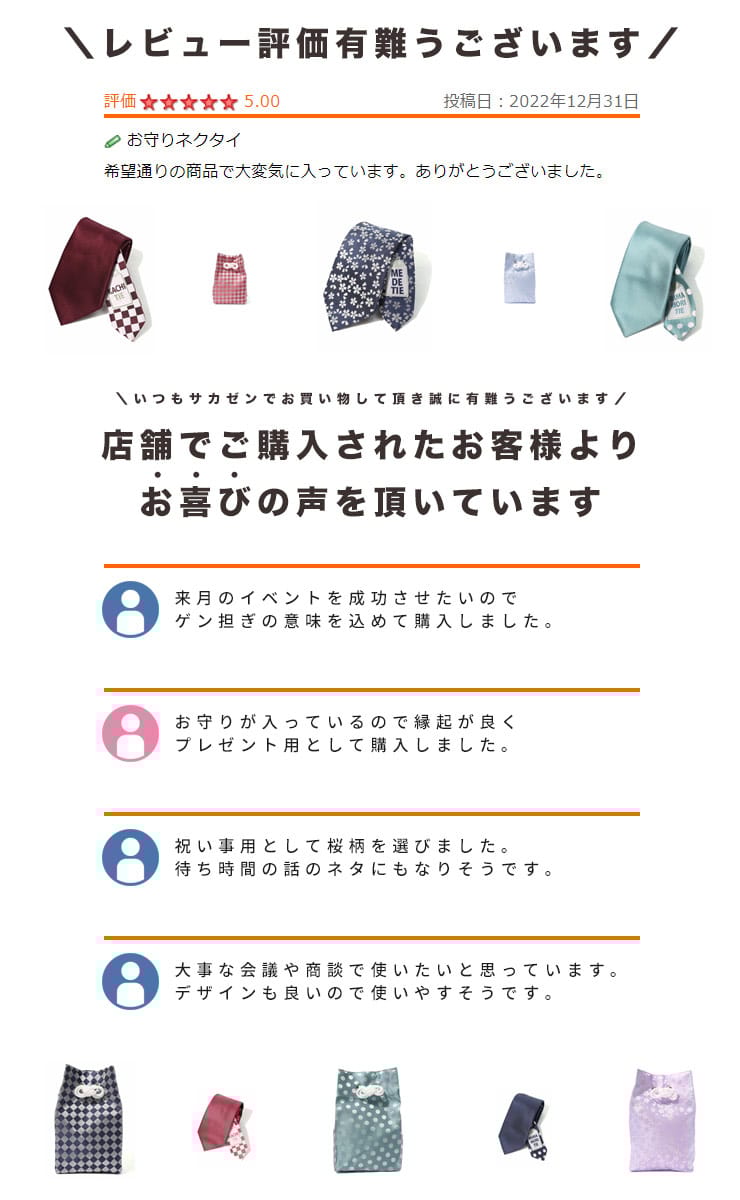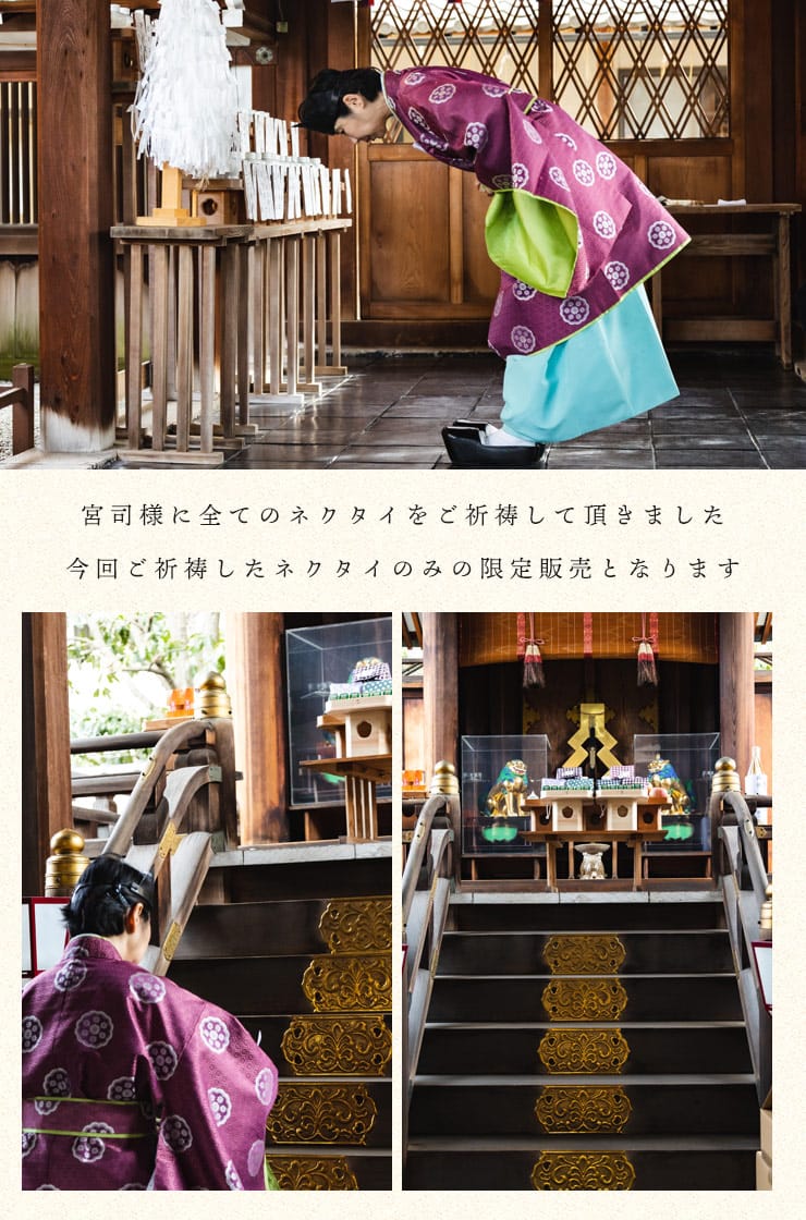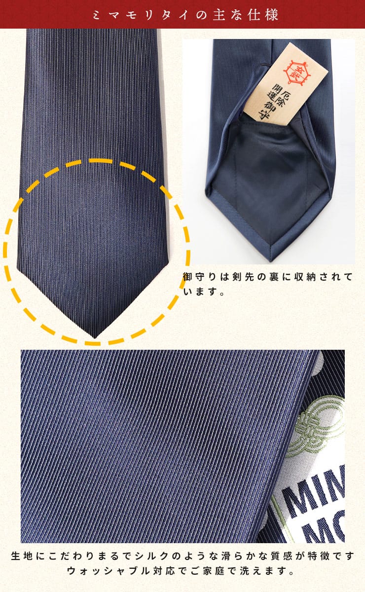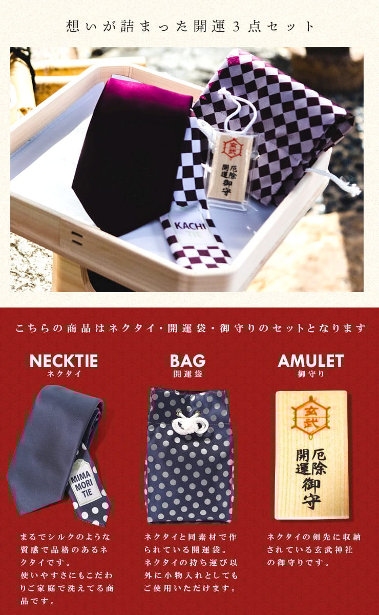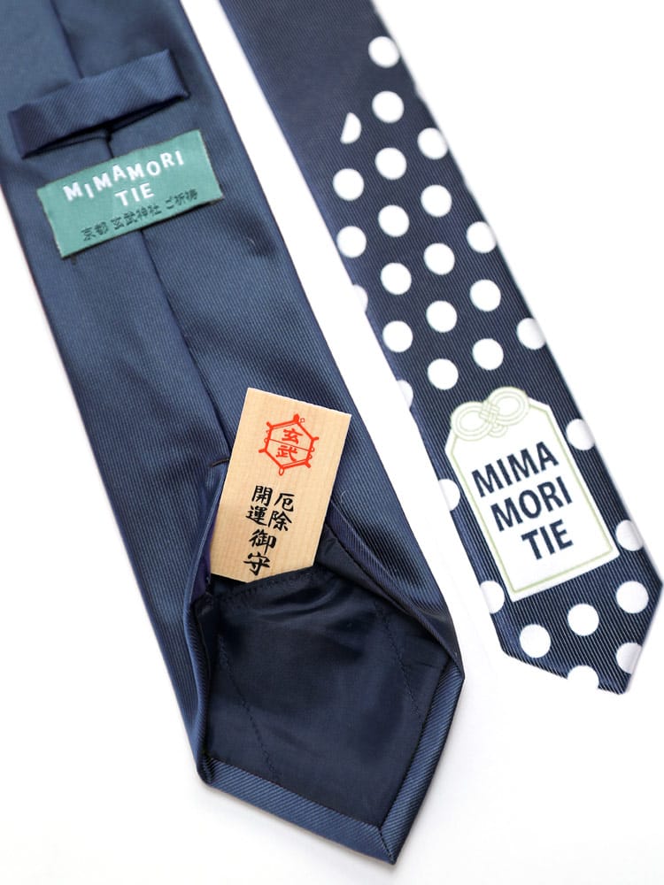 京都の玄武神社とのコラボレーションで実現した、お守り入りのネクタイ「MIMAMORI TIE」。ビジネスマンが常に身に着けるネクタイに祈祷されたお守りを入れ、ご利益をプラスしたネクタイです。合格祈願や就職活動などの頑張り時や結婚式などの式典用としてプレゼントするのに最適なネクタイです。「KACHI TIE(勝ちたい)」「MIMAMORI TIE(見守りたい)」「MEDE TIE(めでたい)」の3種類からお選びいただけます。尚、ネクタイの長さはレギュラーから大きいサイズまで対応できる150㎝を採用しています。
