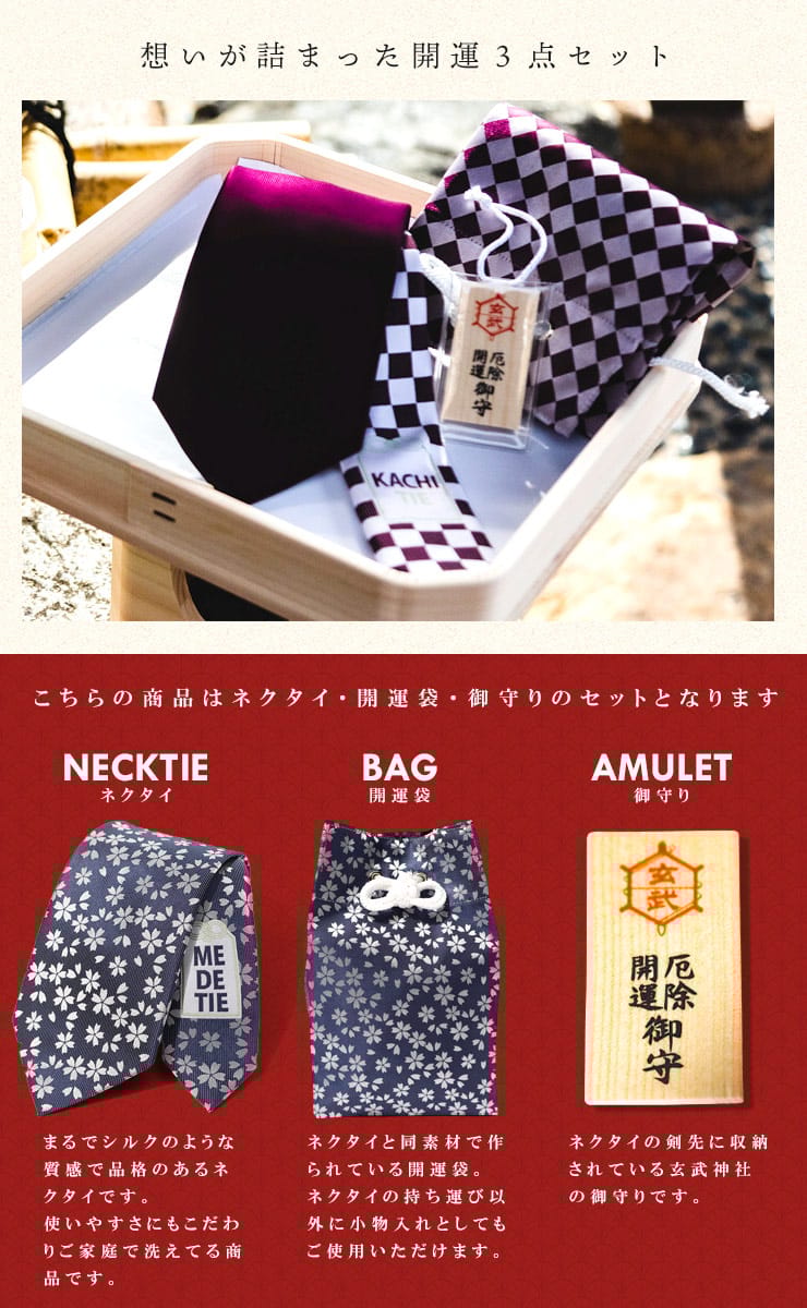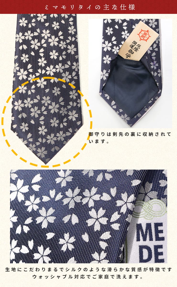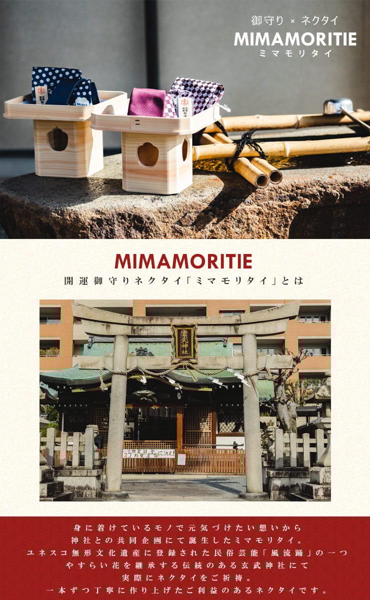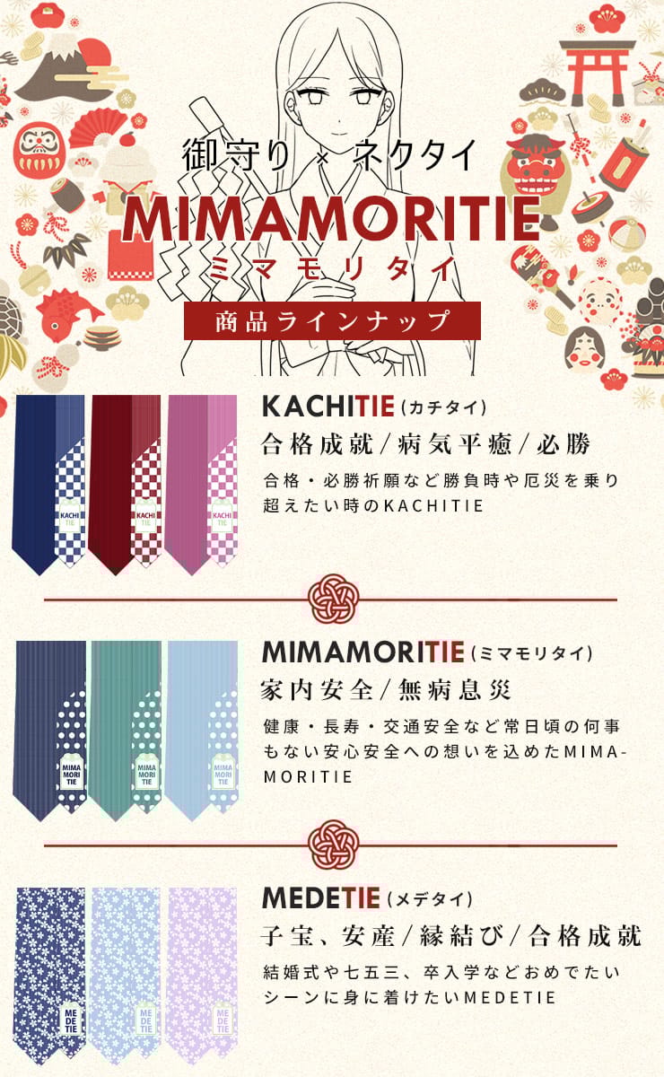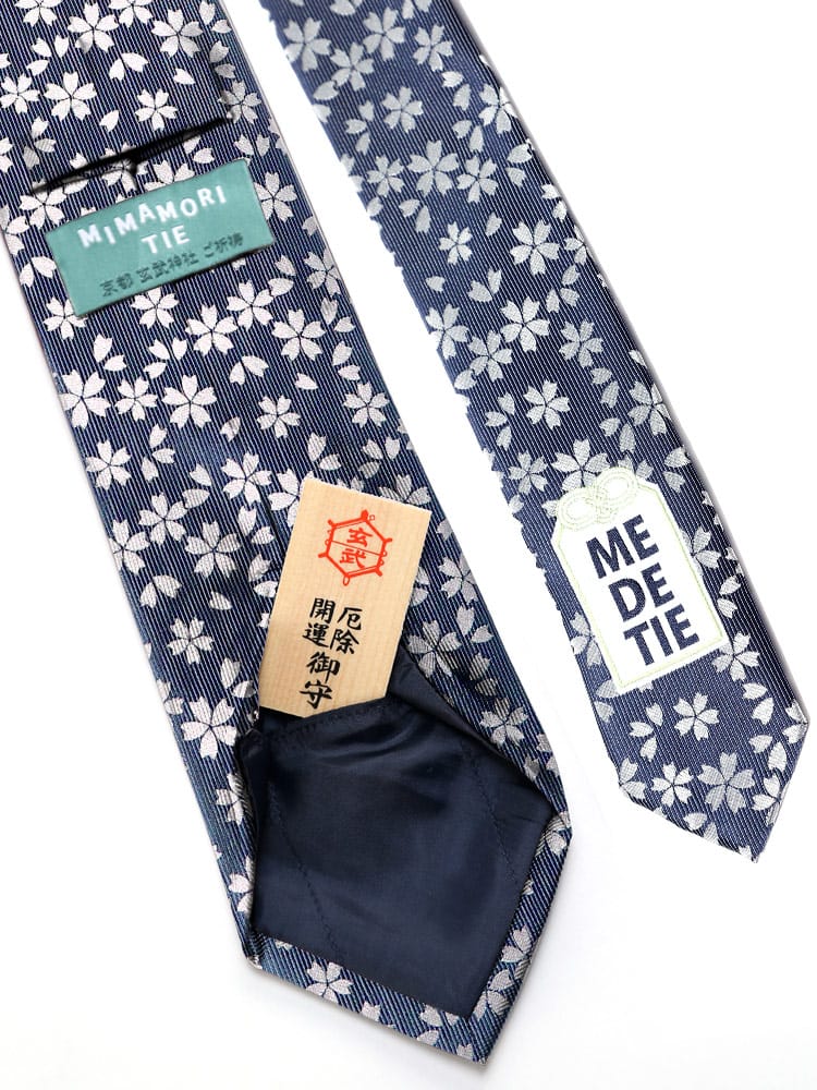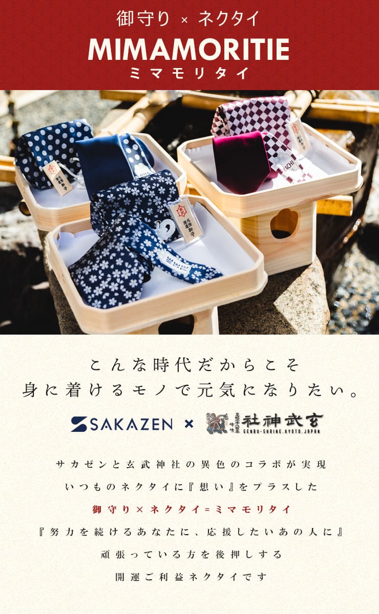 京都の玄武神社とのコラボレーションで実現した、お守り入りのネクタイ「MIMAMORI TIE」。ビジネスマンが常に身に着けるネクタイに祈祷されたお守りを入れ、ご利益をプラスしたネクタイです。合格祈願や就職活動などの頑張り時や結婚式などの式典用としてプレゼントするのに最適なネクタイです。「KACHI TIE(勝ちたい)」「MIMAMORI TIE(見守りたい)」「MEDE TIE(めでたい)」の3種類からお選びいただけます。尚、ネクタイの長さはレギュラーから大きいサイズまで対応できる150㎝を採用しています。