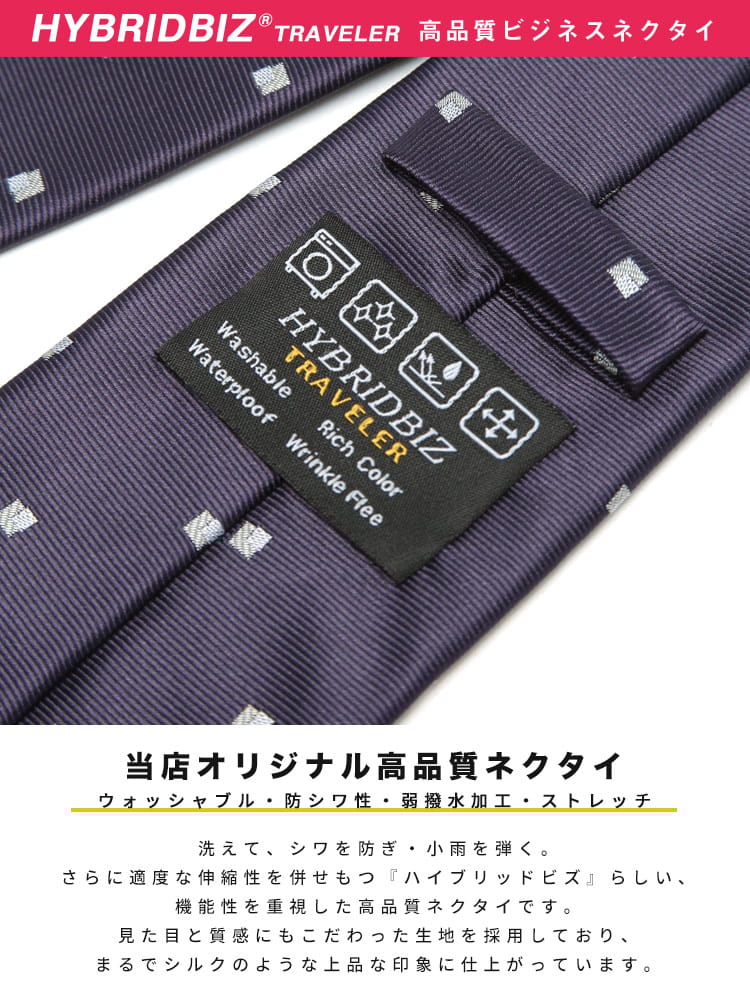 HYBRIDBIZの「ECOPETノンアイロンネクタイ」は、ポリエステル素材を使用し、防シワ性に優れた一品です。ノンアイロン仕様で、手軽に美しい形を保てるのが魅力。さらに、洗濯可能で弱撥水機能も備えているため、日常使いに最適です。エコ素材のECOPETを使用し、環境にも配慮したネクタイで、忙しいビジネスシーンでも手軽に使える便利なアイテムです。