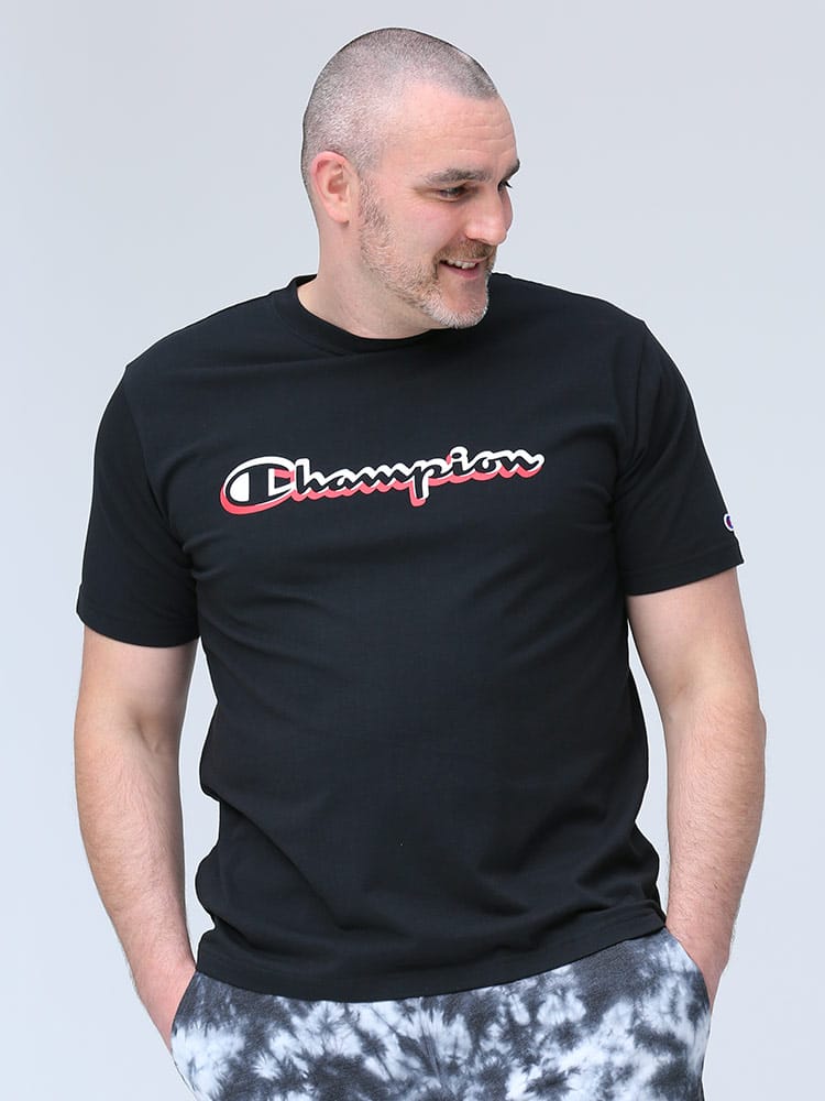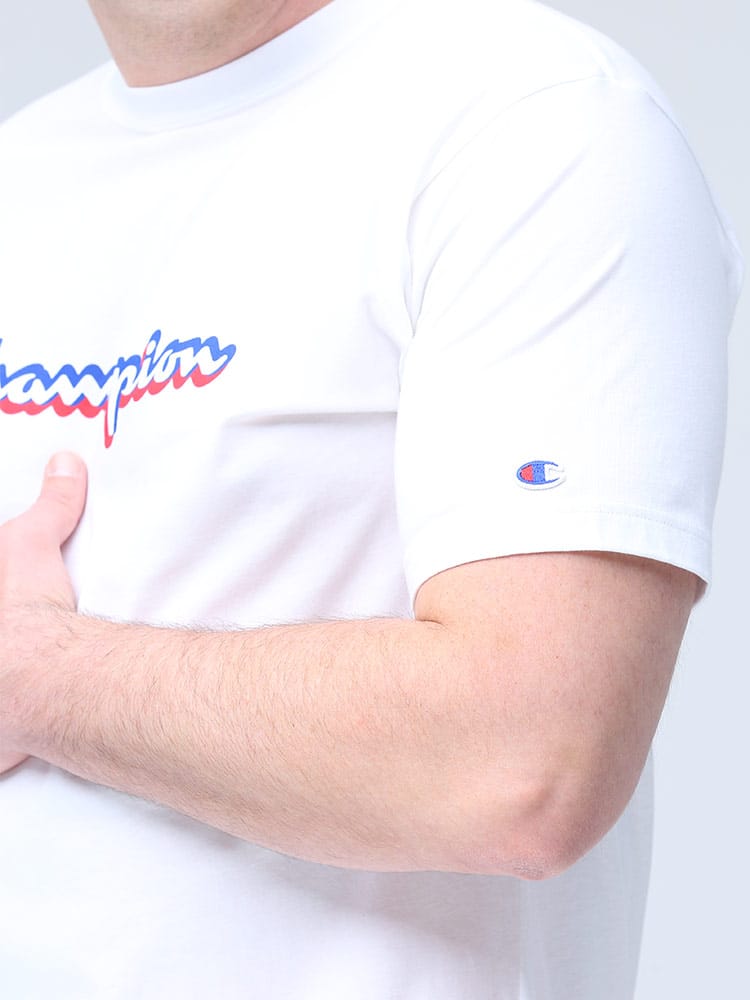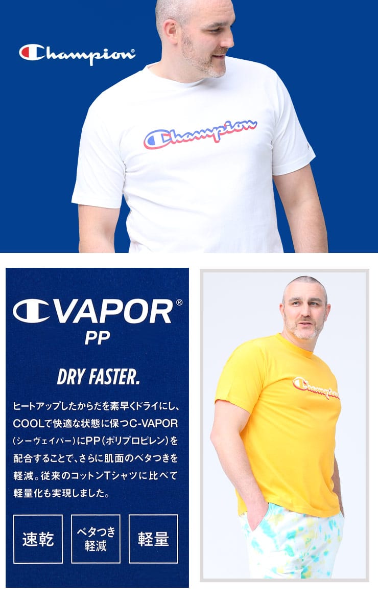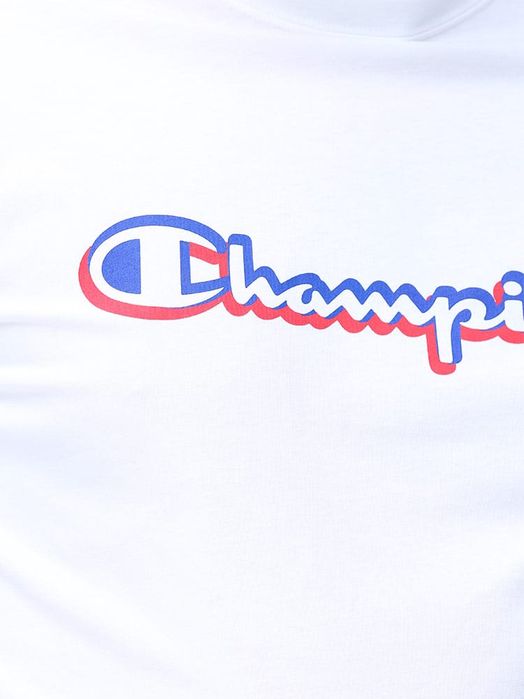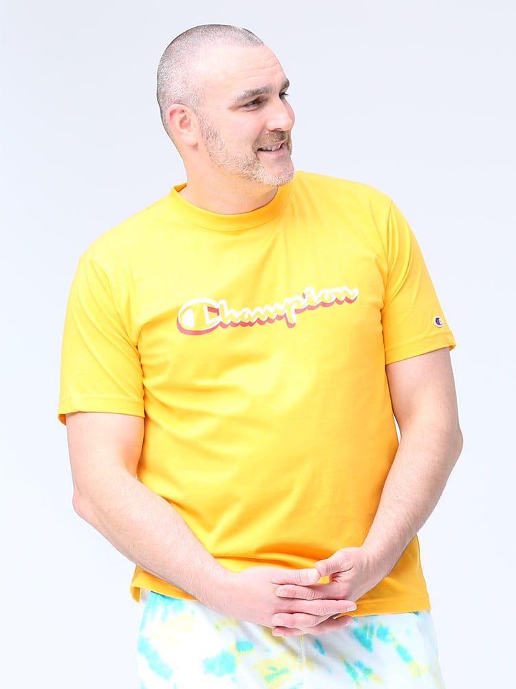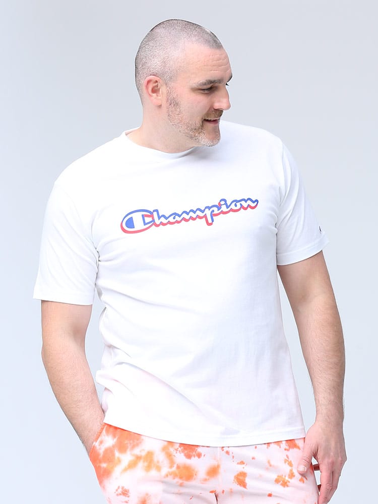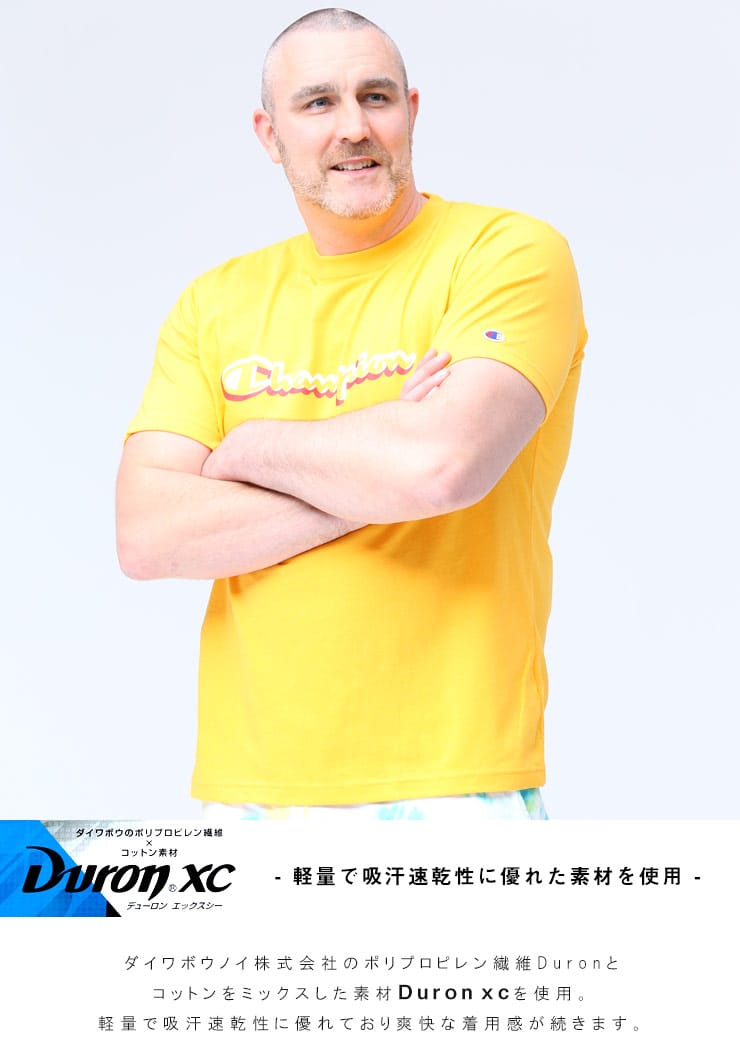 フロントのロゴプリントがお洒落なChampionのクルーネック 半袖 Tシャツです。左袖にロゴ。生地に大和紡績株式会社のポリプロピレン繊維”Duron”とコットンをミックスした素材を使用しています。軽量で吸汗速乾性に優れているのでタウンユースではもちろんアクティブウェアにも最適な一枚です。
