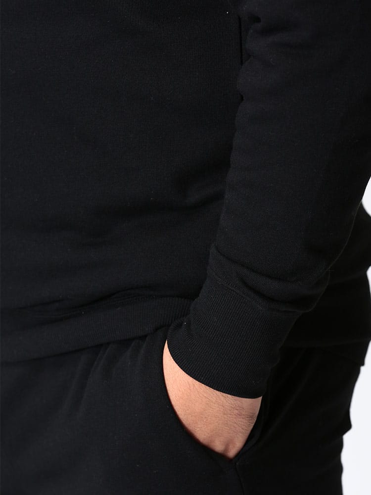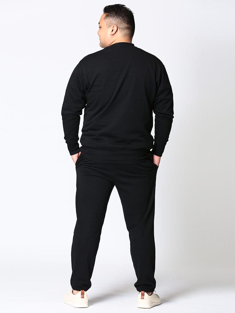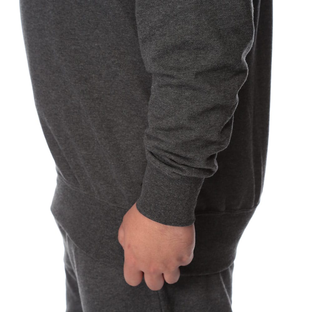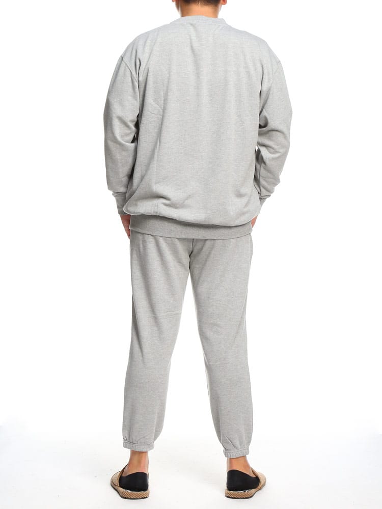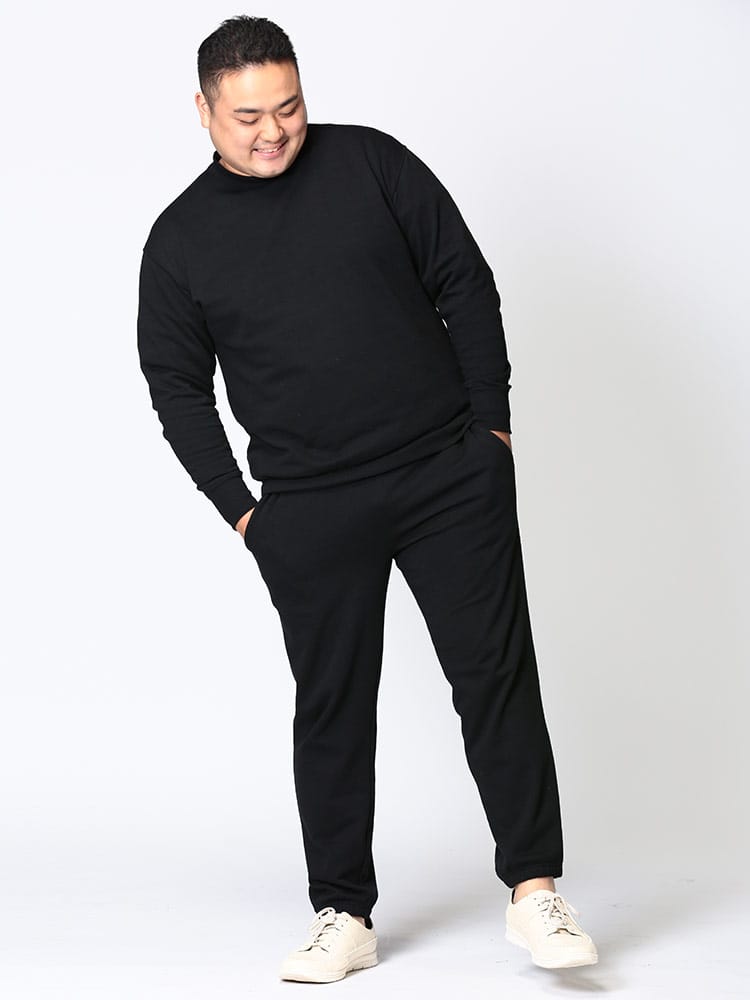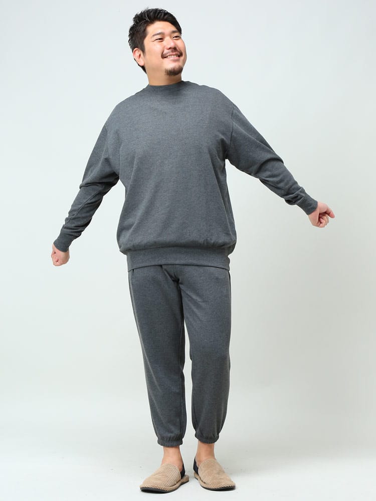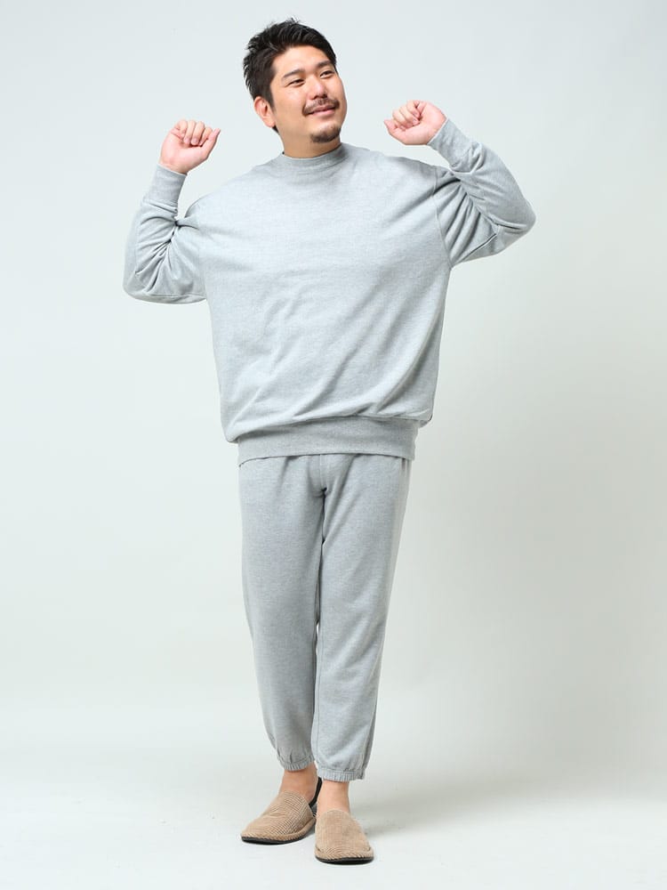 ベーシックなスウェット トレーナーとロングパンツのセットアップです。無地のシンプルなデザインで大人のリラックスウェアとしておすすめです。トップスの首元はクルーネック。トップスの袖、裾はリブデザイン。パンツのウエストはゴムとドローコード付きでサイズ調整出来ます。パンツ裾はリブデザイン。裏毛。収納袋付き。