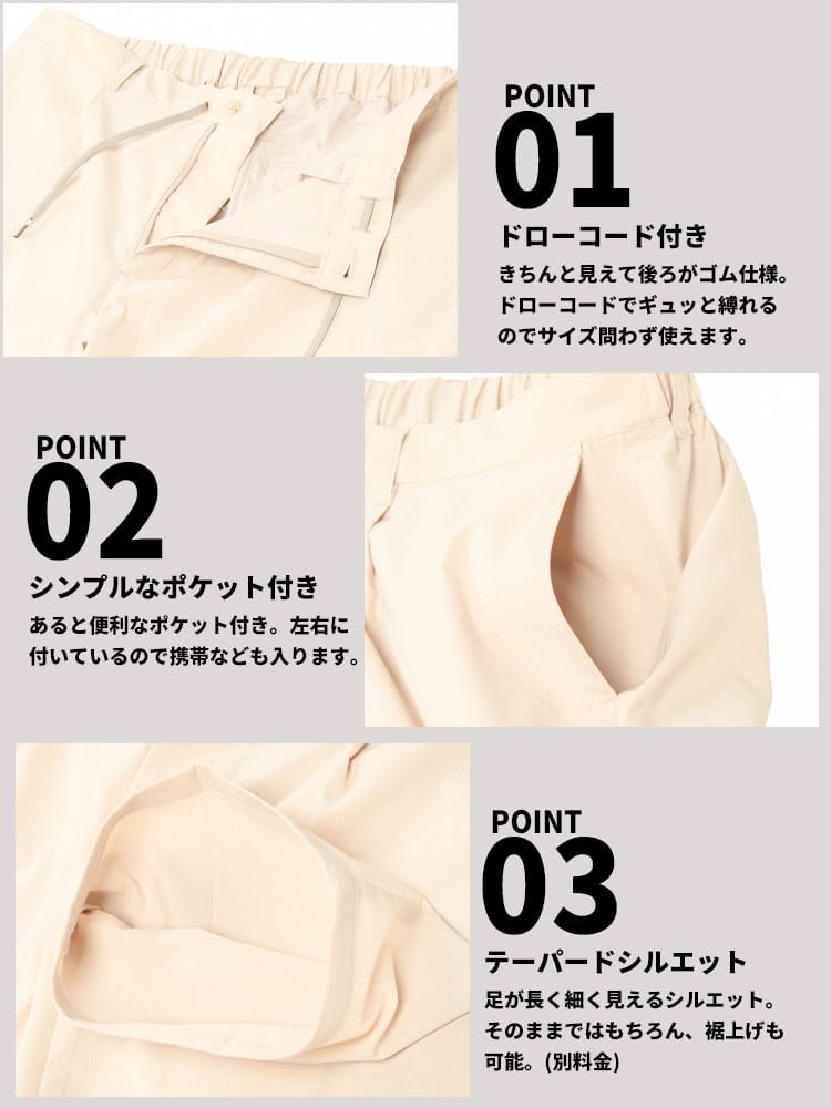 仕様 :外側ポケット数×4つ / ウエストゴム / ウエストコード / ジップフライ