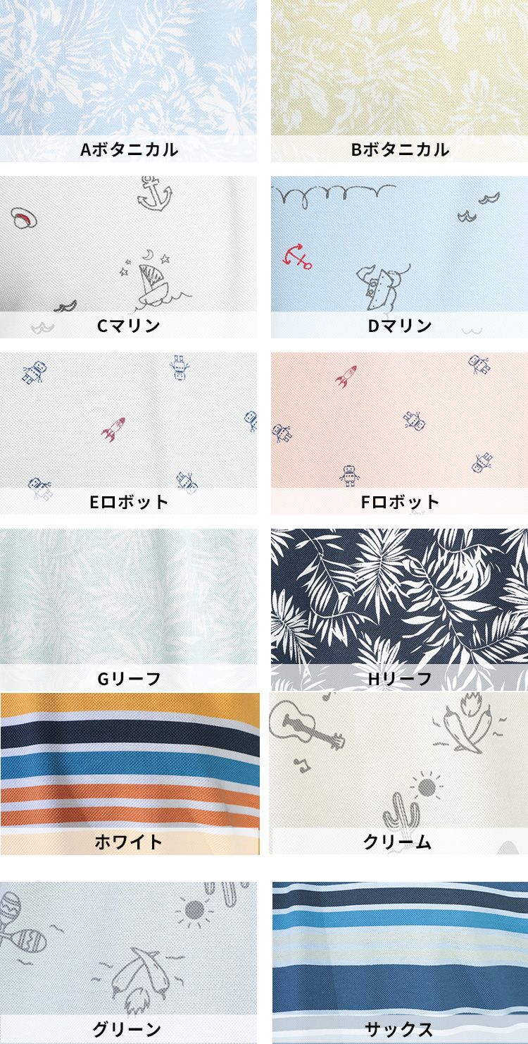 カラー:Aボタニカル、Bボタニカル、Cマリン、Dマリン、Eロボット、Fロボット、Gリーフ、Hリーフ、ホワイト、クリーム、グリーン、サックス
