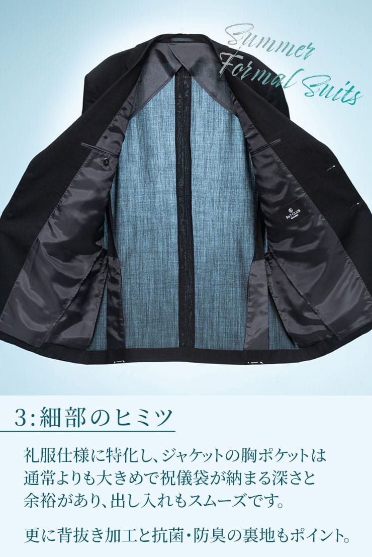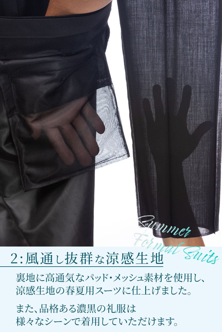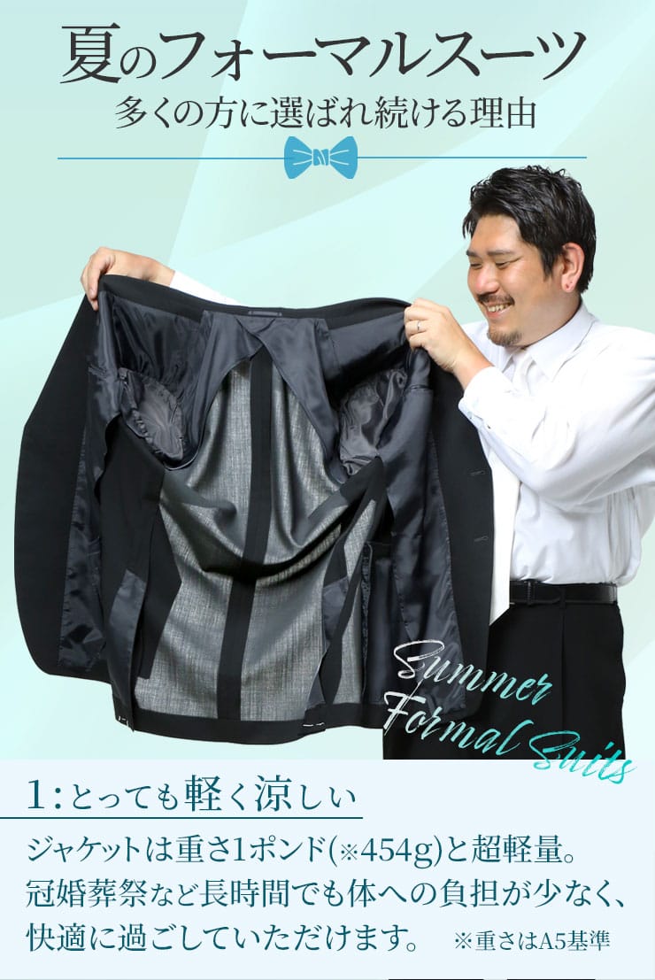 サカゼンオリジナルのシングル2ツ釦サマーフォーマルスーツ。超軽量+涼しいスーツで夏にも快適。抗菌防臭効果があり衛生的。ウエスト両サイドには樹脂製のスライドアジャスターがあり約15センチウエスト周りが調整可能です。