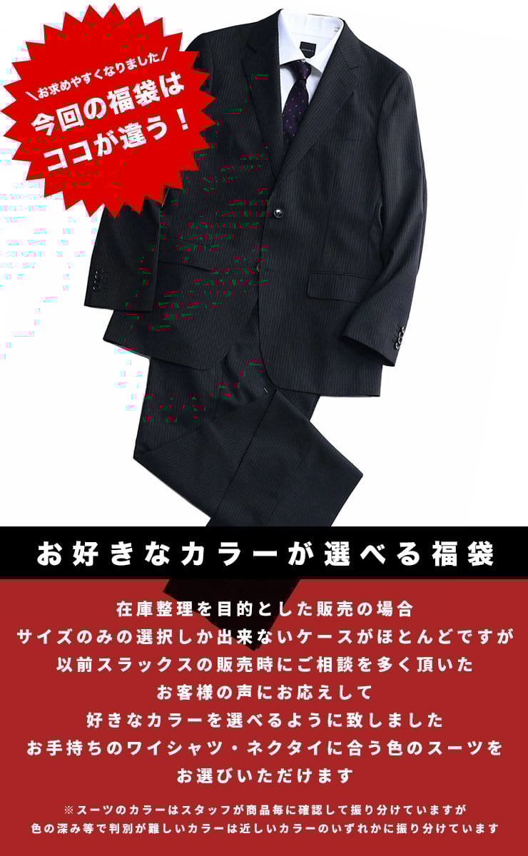 色・サイズが自由に選べるビジネススーツの福袋です。