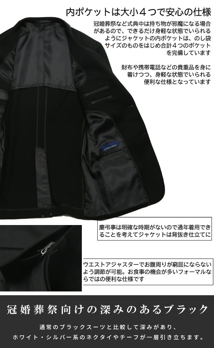 仕様 :ジャケット外側ポケット数×3つ / 内側ポケット数×4つ / シングル2つボタン/ 背抜き / セッパタイプ / 額縁あり / センターベント / スラックス外側ポケット数×4つ / ジップフライ / ワンタック / ウエスト調節アジャスター / 抗菌防臭 / 撥水・撥油加工 / 埃がつきにくい