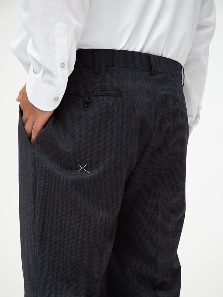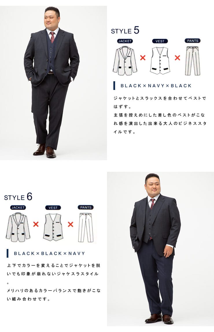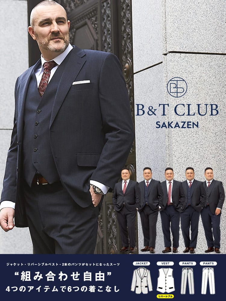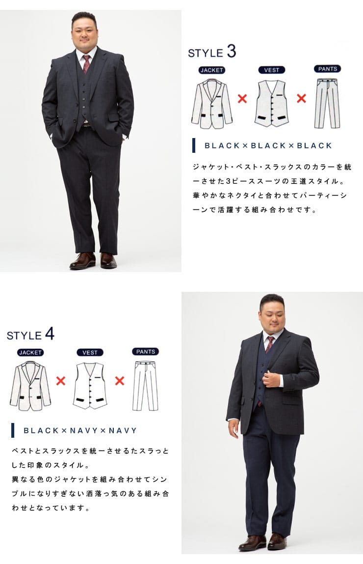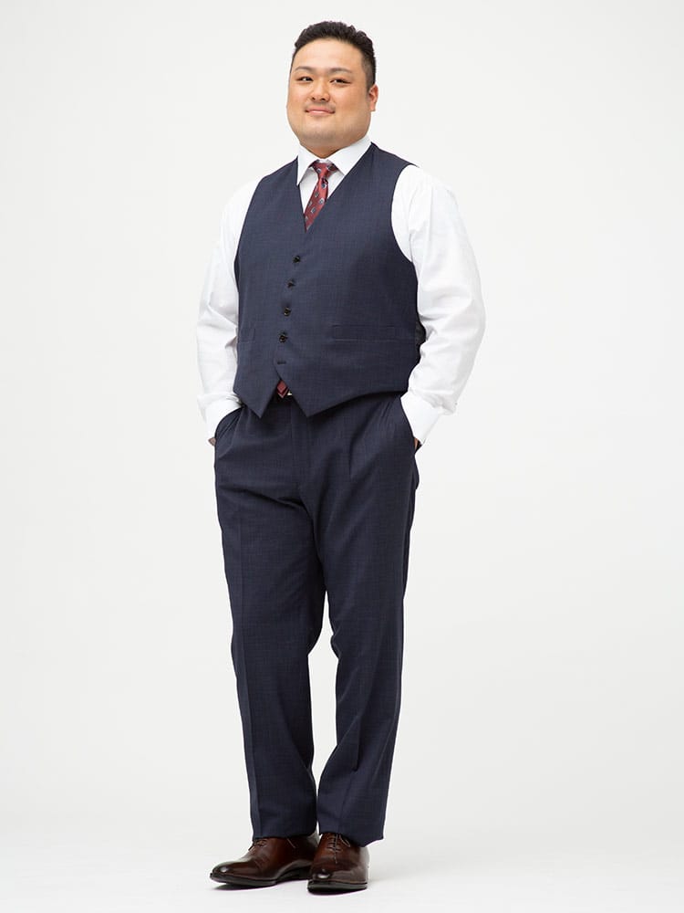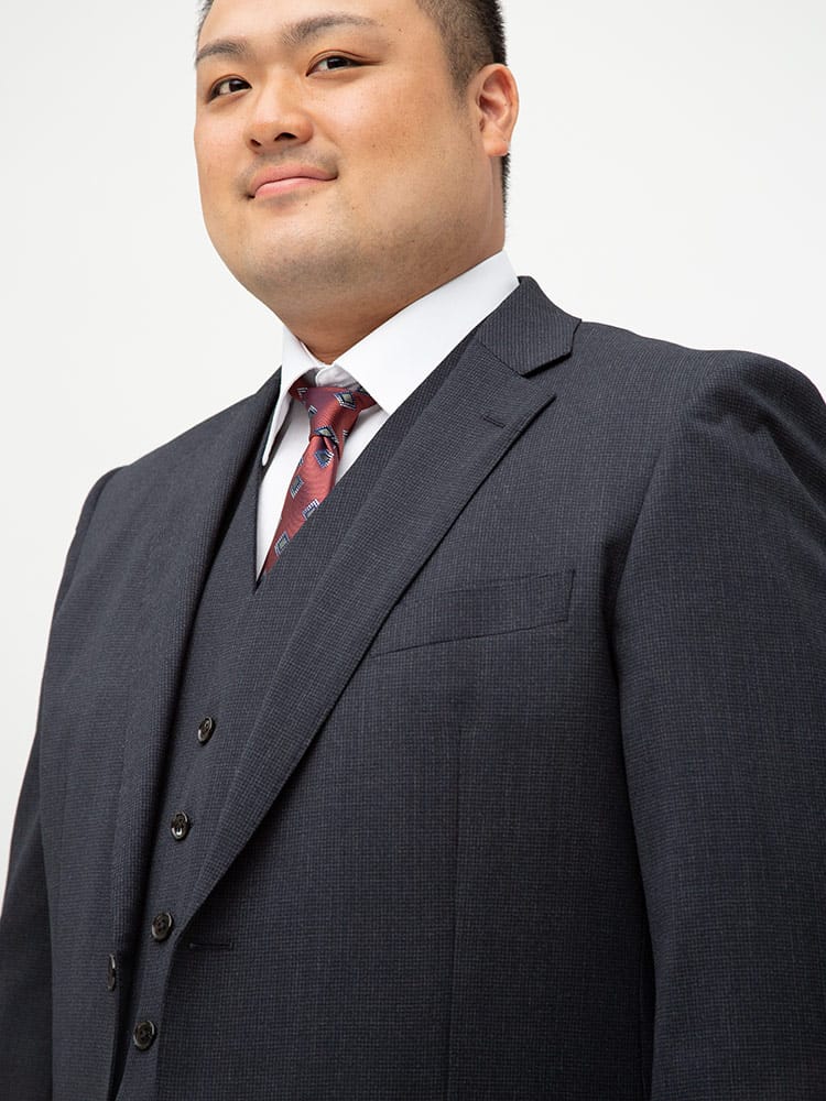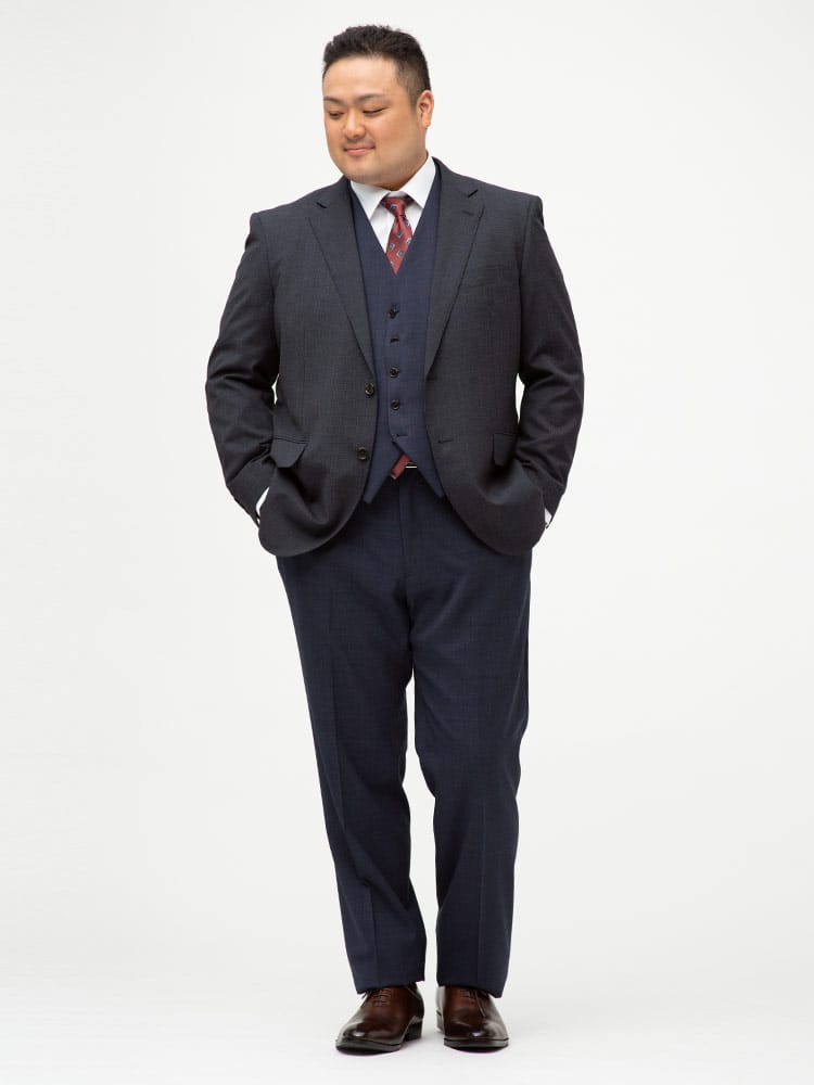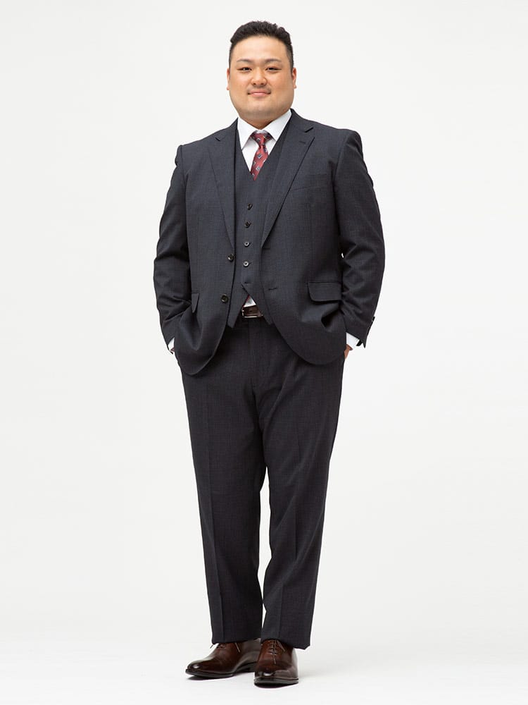 仕様 :スーツ外側ポケット数×3つ / 内側ポケット数×4つ / シングル2つボタン / 背抜き / セッパタイプ / 額縁あり / センターベント / ベスト外側ポケット数×2つ / 内側ポケット数×2つ / パンツポケット数×4つ / ジップフライ / ノータック / ツーパンツ / リバーシブルベスト