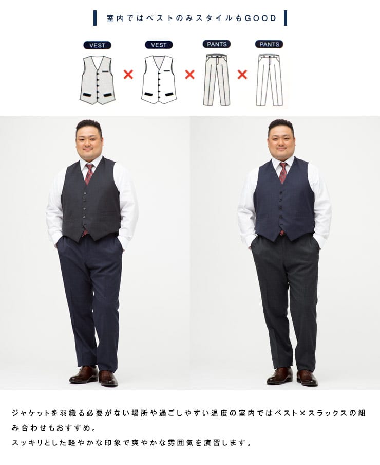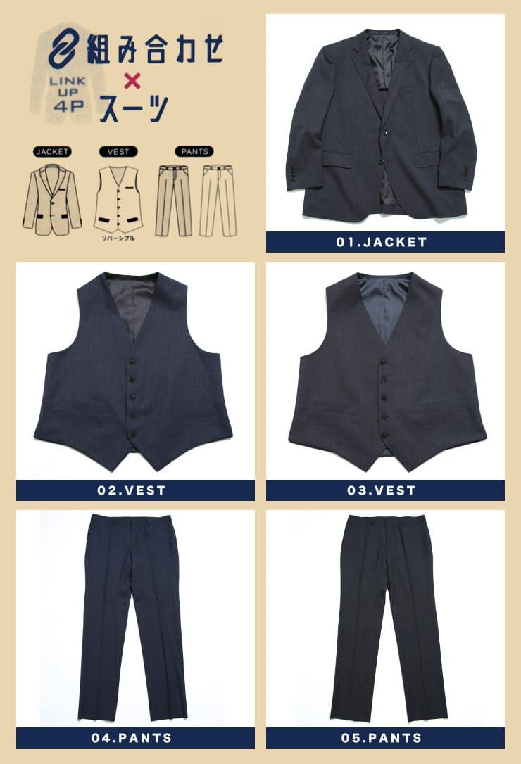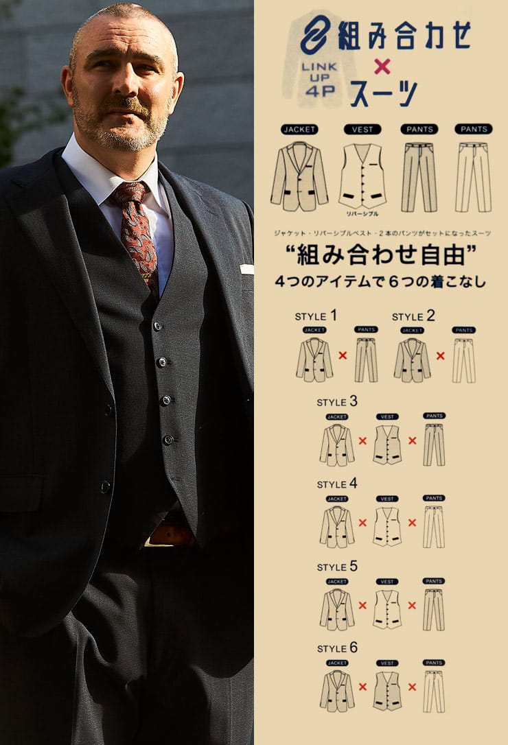 4つのアイテムで6つの着こなしが出来る「組み合わせ×スーツ」の ベスト付き シングル ツーパンツ スーツです。ジャケットとベスト、2パンツのセットです。ベストはリバーシブルデザインで2通りのデザインをお楽しみいただけます。毎日着るビジネスマンには嬉しいパンツは2パンツです。ビジネスからフォーマルまで幅広いシーンに活躍するアイテムです。