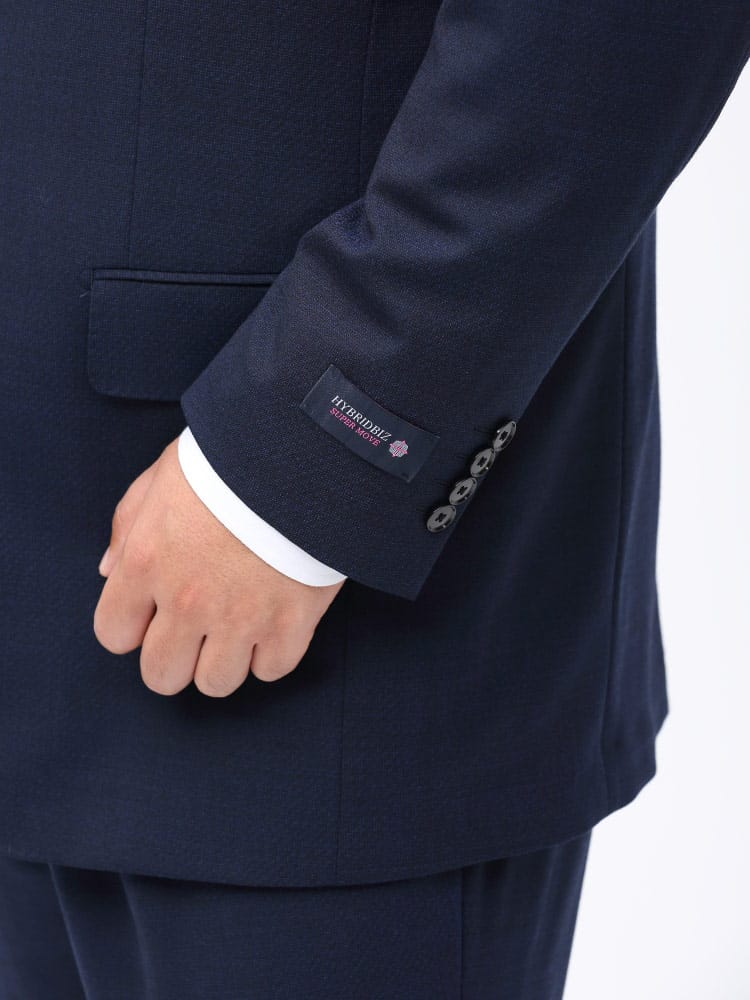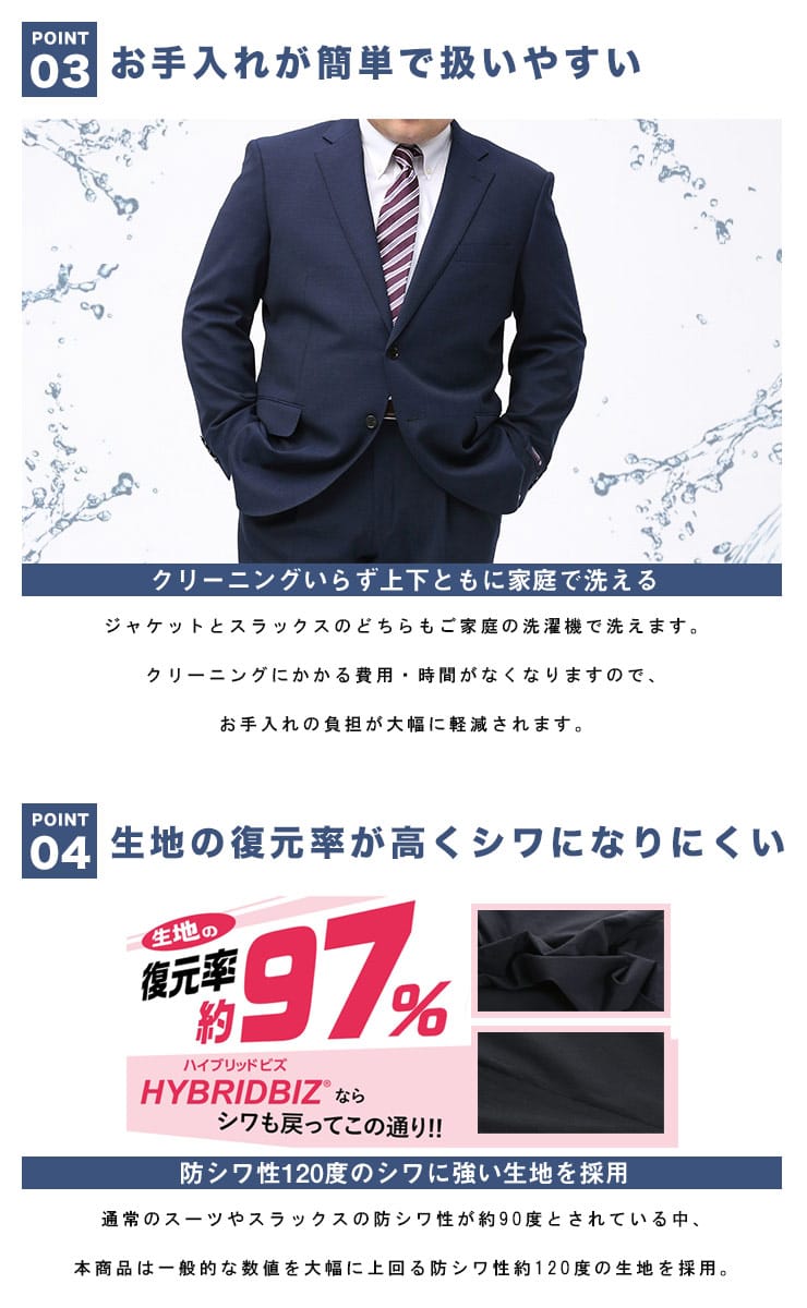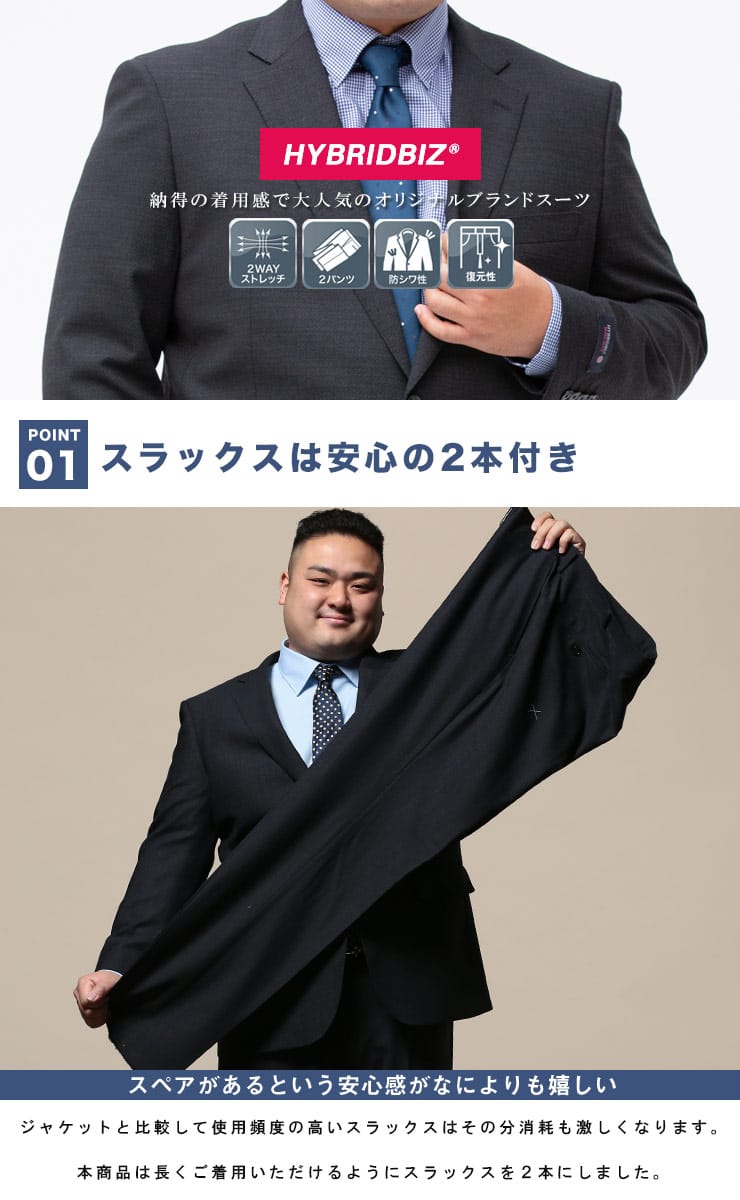 快適な着心地が魅力的なHYBRIDBIZのシングル 2ツ釦 ツーパンツ スーツです。2WAYストレッチ素材を使用しているのでフィット感抜群。ウエストはアジャスターでサイズ調整出来ます。防シワ性でシワを気にせずご着用出来ます。ご家庭で簡単にお手入れが出来る上下ウォッシャブル機能付き。パンツは毎日着るビジネスマンには嬉しい2本セット。ウール混の上品な生地感も魅力です。