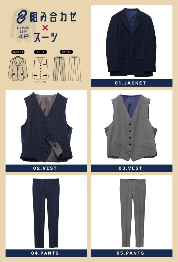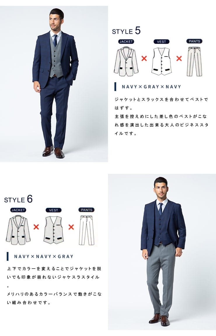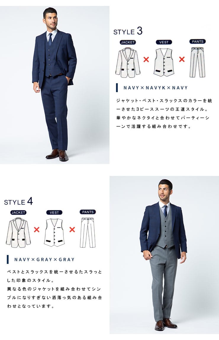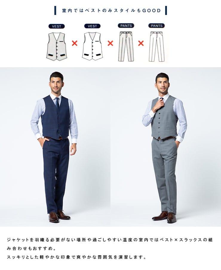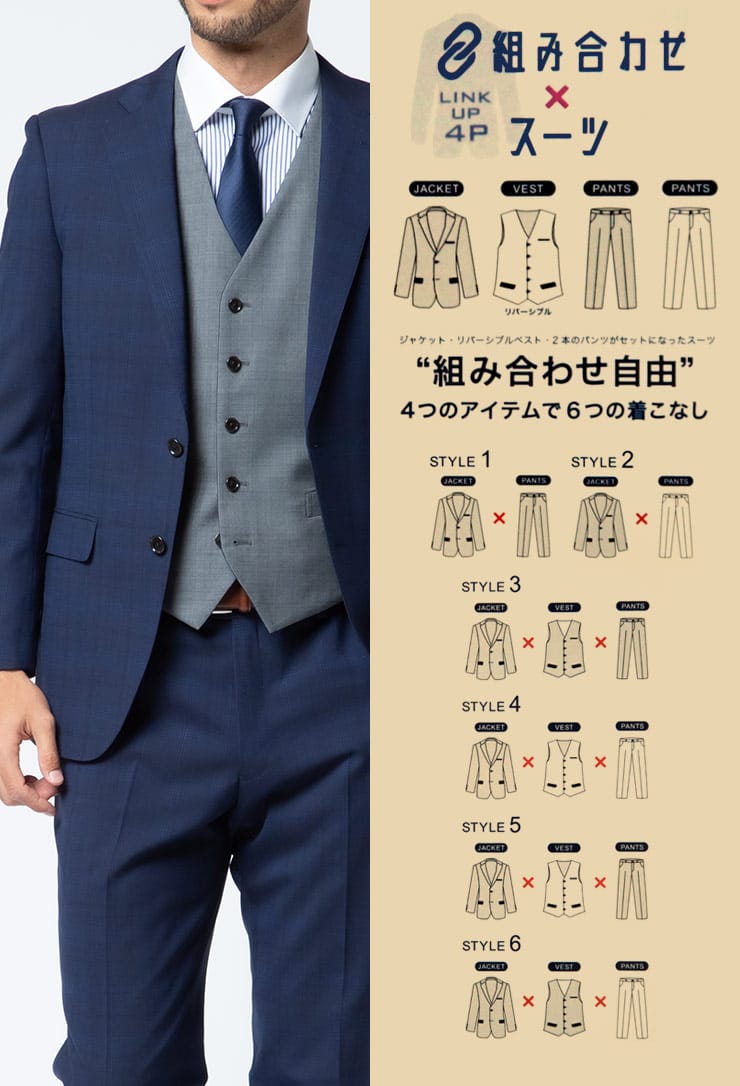 4つのアイテムで6つの着こなしが出来る「組み合わせ×スーツ」の ベスト付き シングル ツーパンツ スーツです。セット内容はシングル2つボタンジャケット、リバーシブルベスト、カラー違いのノータックスラックス×2のセットです。上下同色でスーツスタイルはもちろん、スラックスカラーを変えてジャケスラスタイルなど、1つあれば6通りの着こなしができちゃうんです!毎日気分に合わせてスタイリングを楽しめる、ビジネスマンには嬉しいアイテムになります。ビジネスからパーティーシーンなど、幅広いシチュエーションで活躍するオススメなアイテムです。