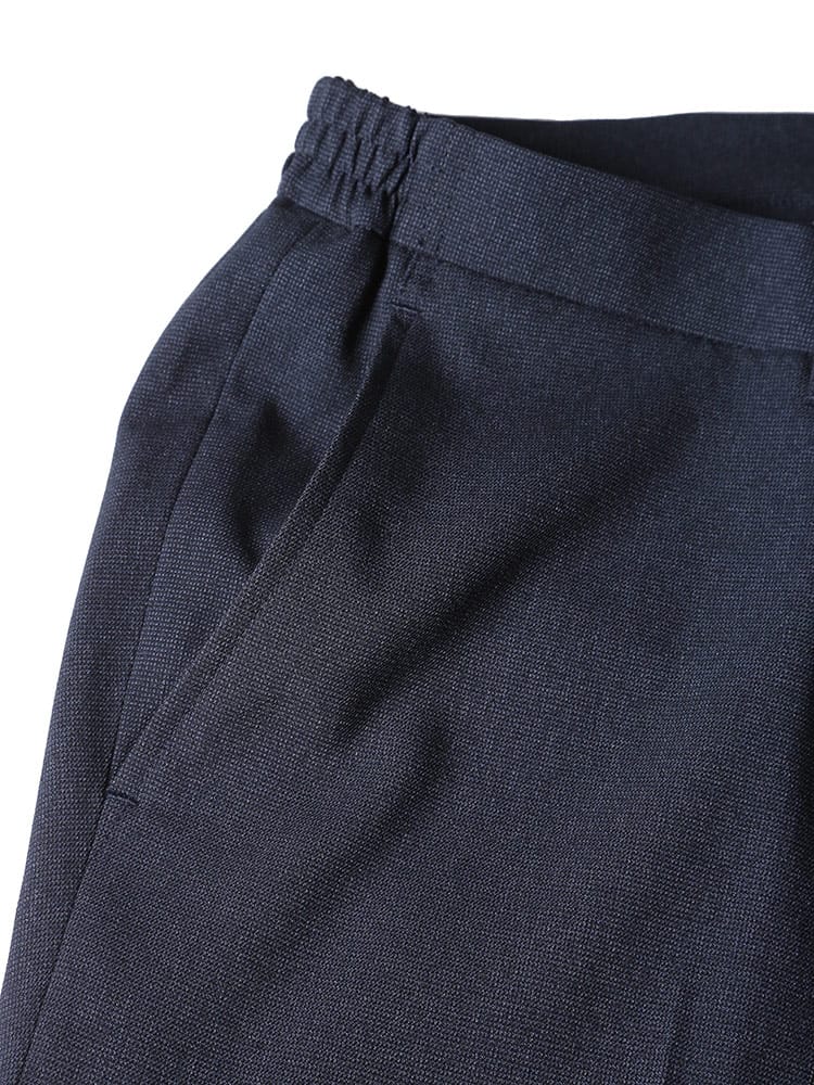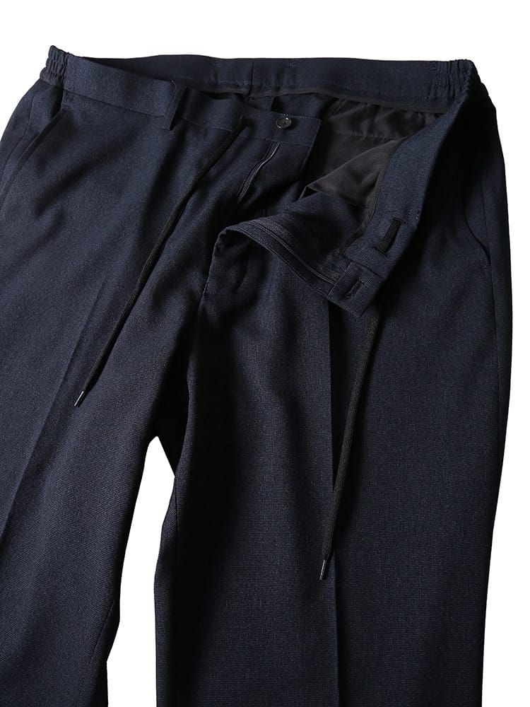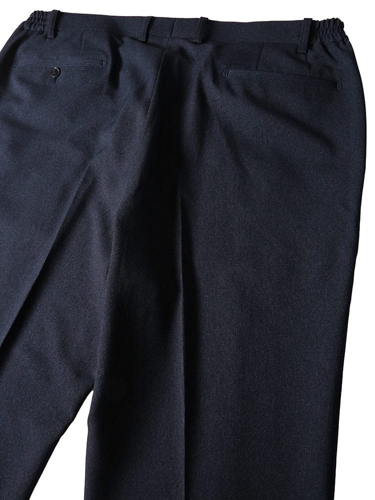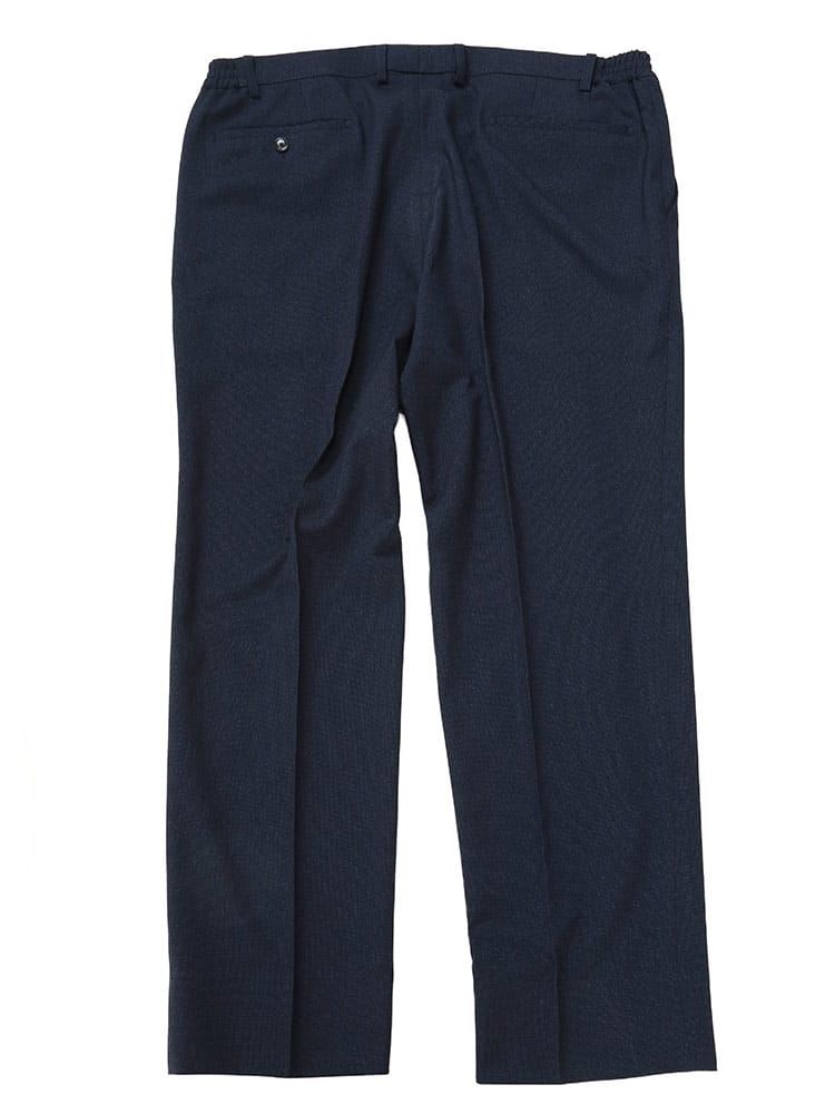 従来の商品より2倍伸びるすごいらくストレッチのメランジ ノータック パンツです。メランジ生地を使用し、品の中にカジュアルさを演出。ノータックデザインでゆとりのあるデザイン。ウエストはサイド部分がギャザーになっているので伸縮します。ベーシックなデザインで大人のカジュアルスタイルやジャケパンスタイルにおすすめです。ウエストのドローコードは外側で結ぶ他にも、パンツの内側に引くことで通常のベルトを通してスタイリングすることが可能です。