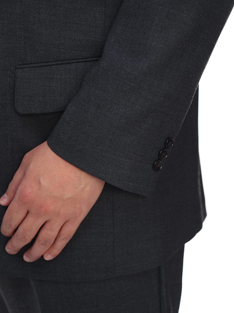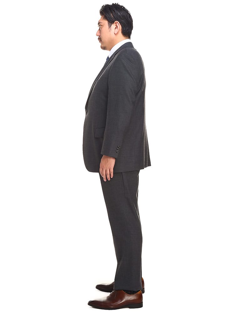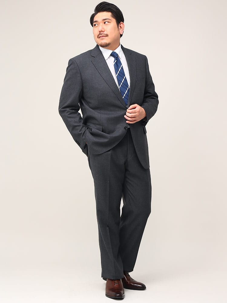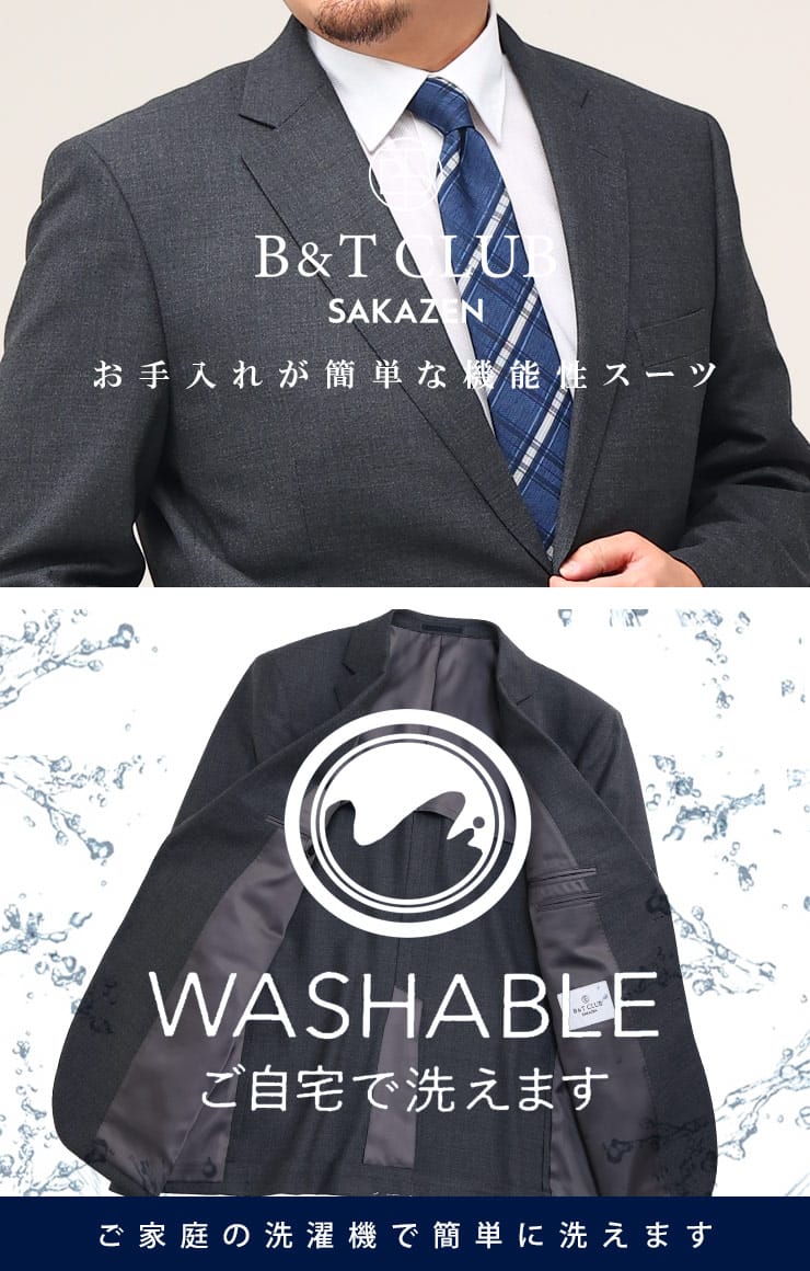 オールシーズン着ていただける万能シングルスーツ。ゆったりとしたシルエットで体の大きい方にも来ていただける仕様となっています。上下ともにご家庭で水洗いできる、大きいサイズのウォッシャブル仕様シングルスーツです。より動きの影響を受け消耗しやすいスラックスは安心の2パンツとなっています。ウエストにはアジャスター片側±3cm(両側合計±6cm)調整可能でゆったりとした着用感で、食事前後などでの微妙なウエストの変化にも対応してくれる嬉しいポイント。生地には程よいストレッチが施されているので、よりアクティブに着ることができるスーツとなっています。