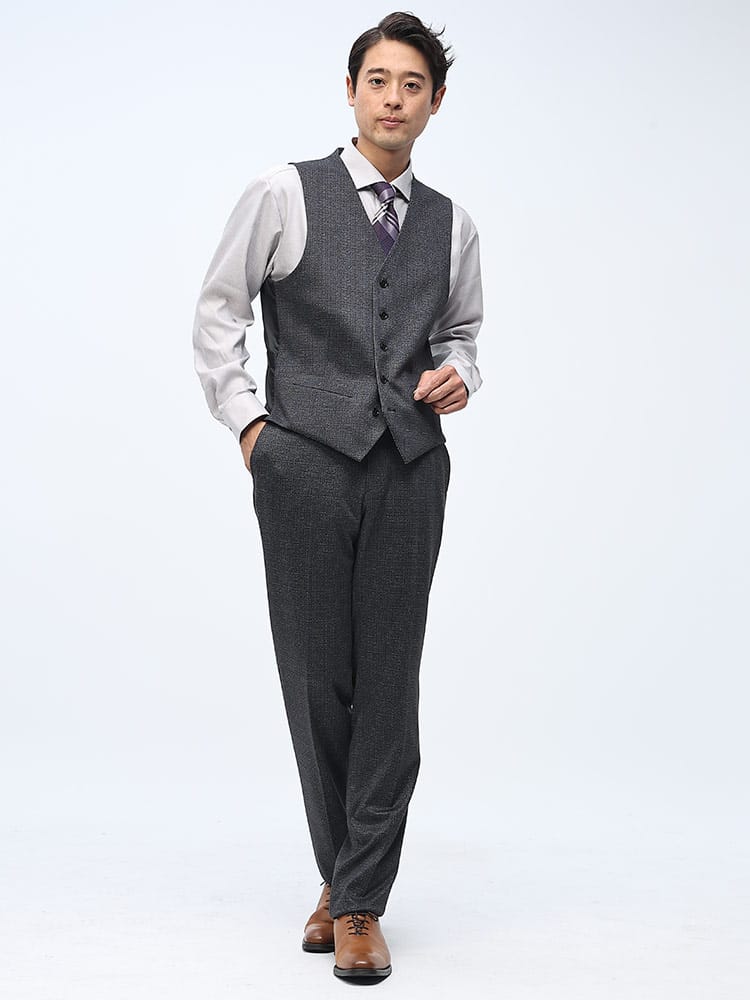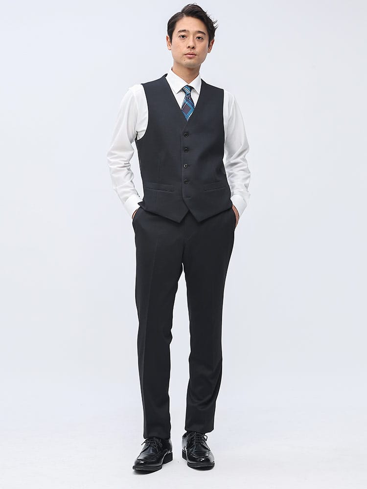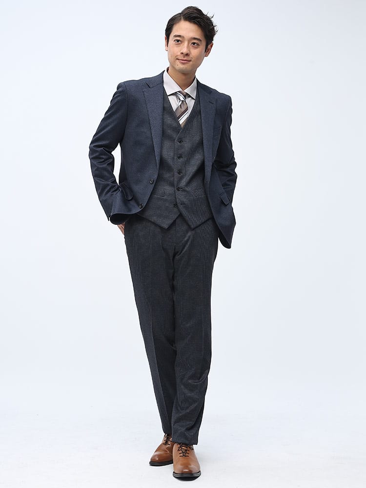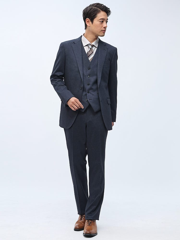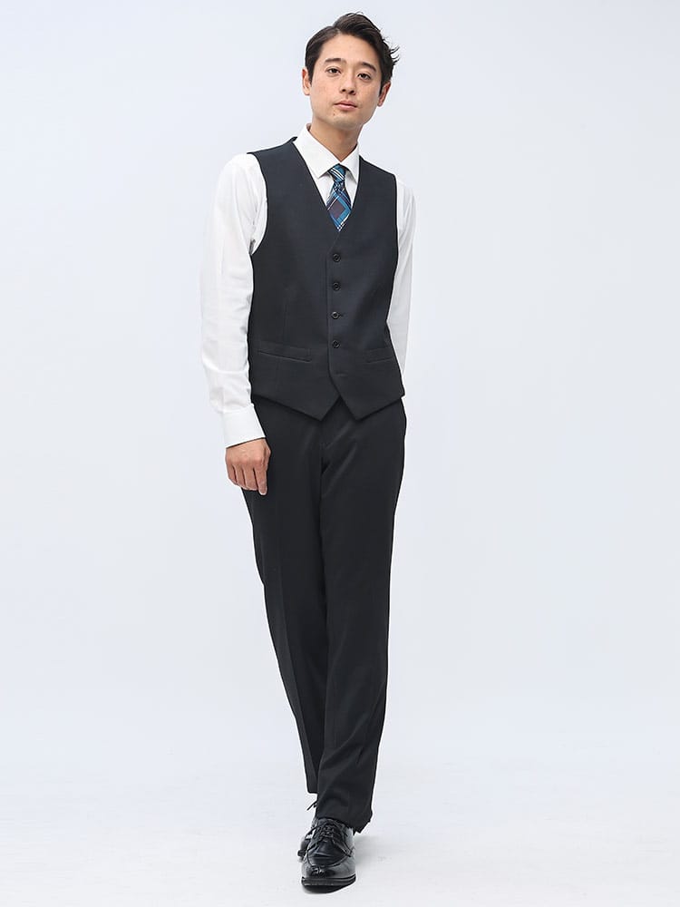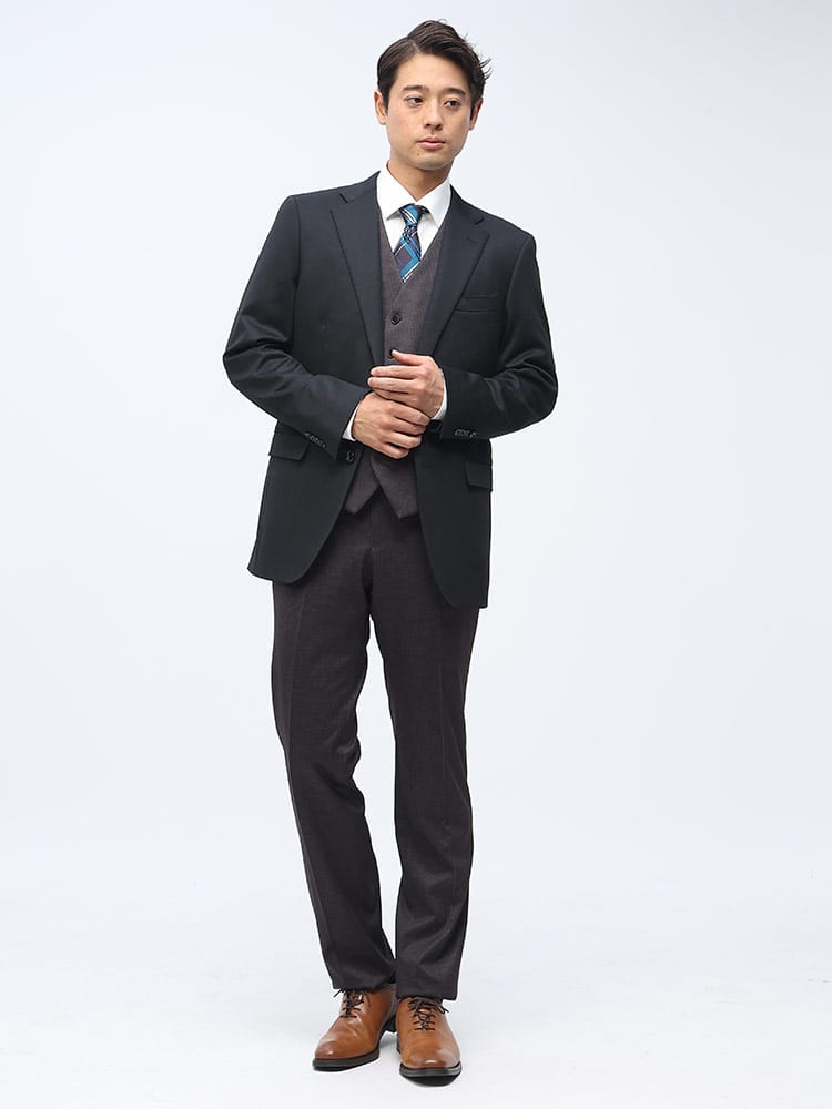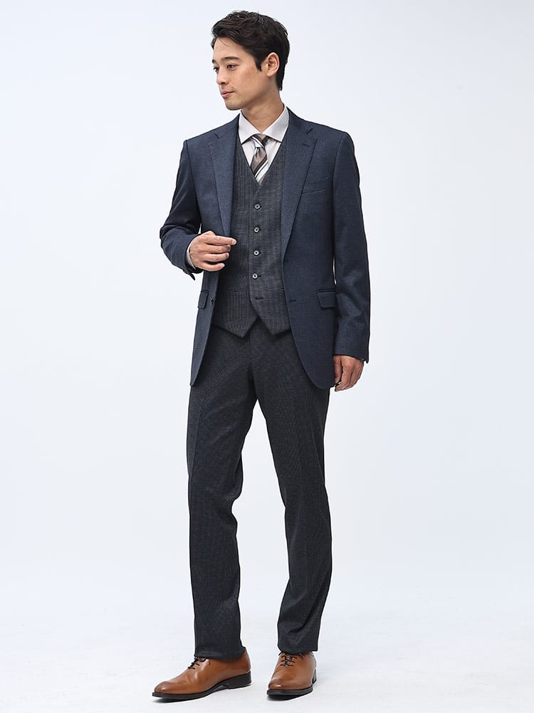 素材 :【ダークグレー】[表地(A)]ポリエステル84% レーヨン11% ポリウレタン5% [表地(B)]ポリエステル82% レーヨン11% ポリウレタン7% [裏地]ポリエステル100% [ベスト裏地]ポリエステル100%【ブラック】[表地(A)]ポリエステル75% レーヨン20% ポリウレタン5% [表地(B)]ポリエステル82% レーヨン11% ポリウレタン7% [裏地]ポリエステル100% [ベスト裏地]ポリエステル100%【ネイビー】[表地(A)]ポリエステル84% レーヨン11% ポリウレタン5% [表地(B)]ポリエステル75% レーヨン20% ポリウレタン5% [裏地]ポリエステル100% [ベスト裏地]ポリエステル100%