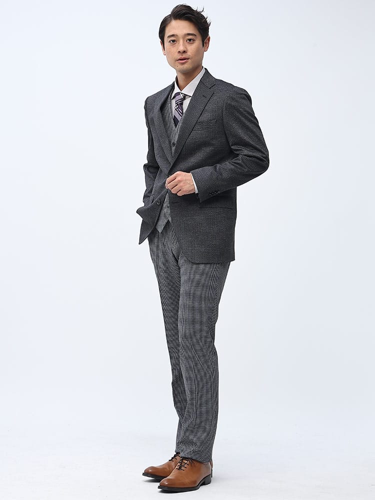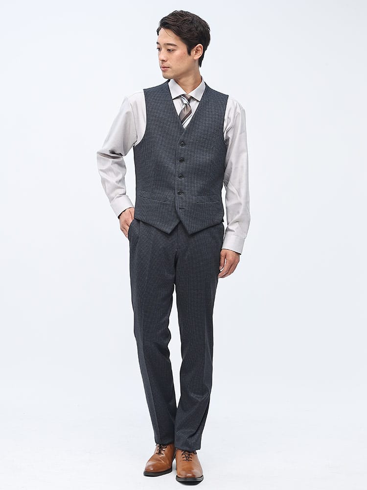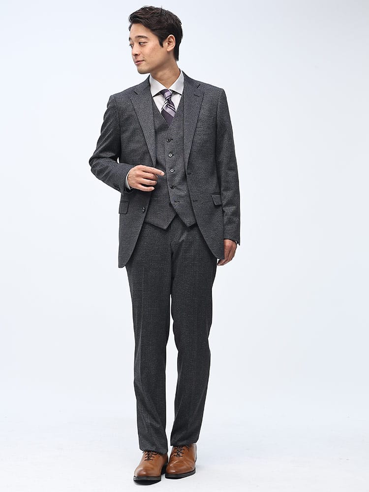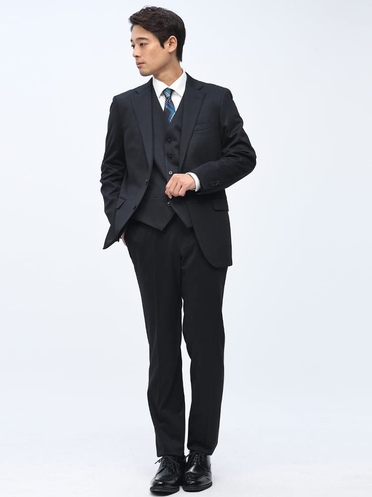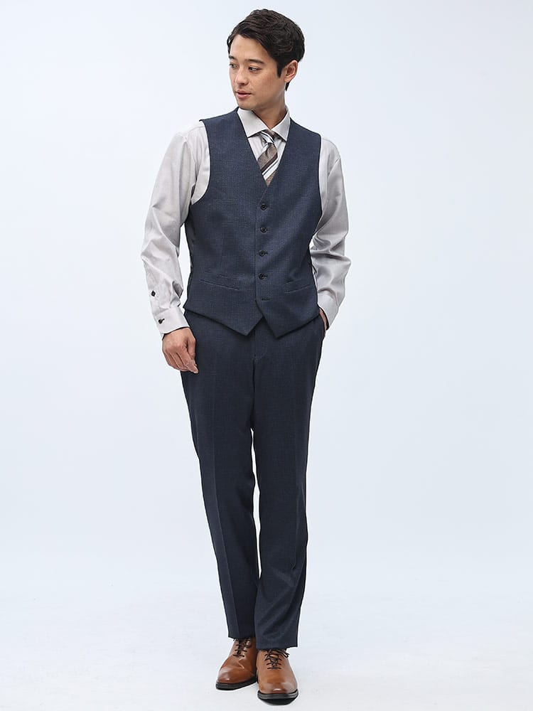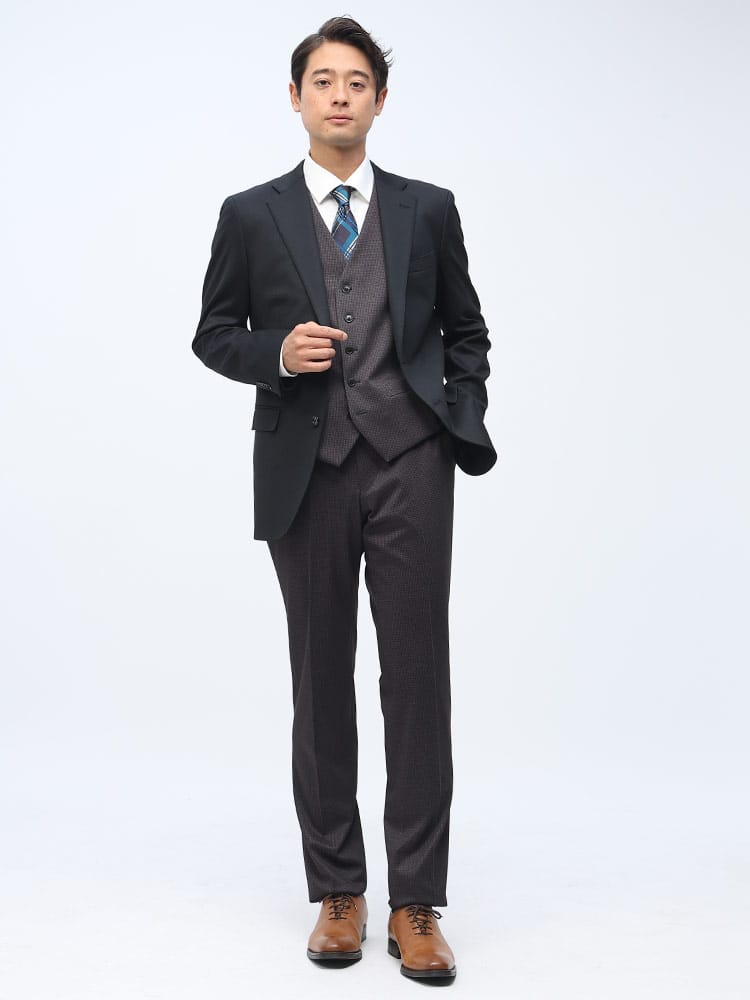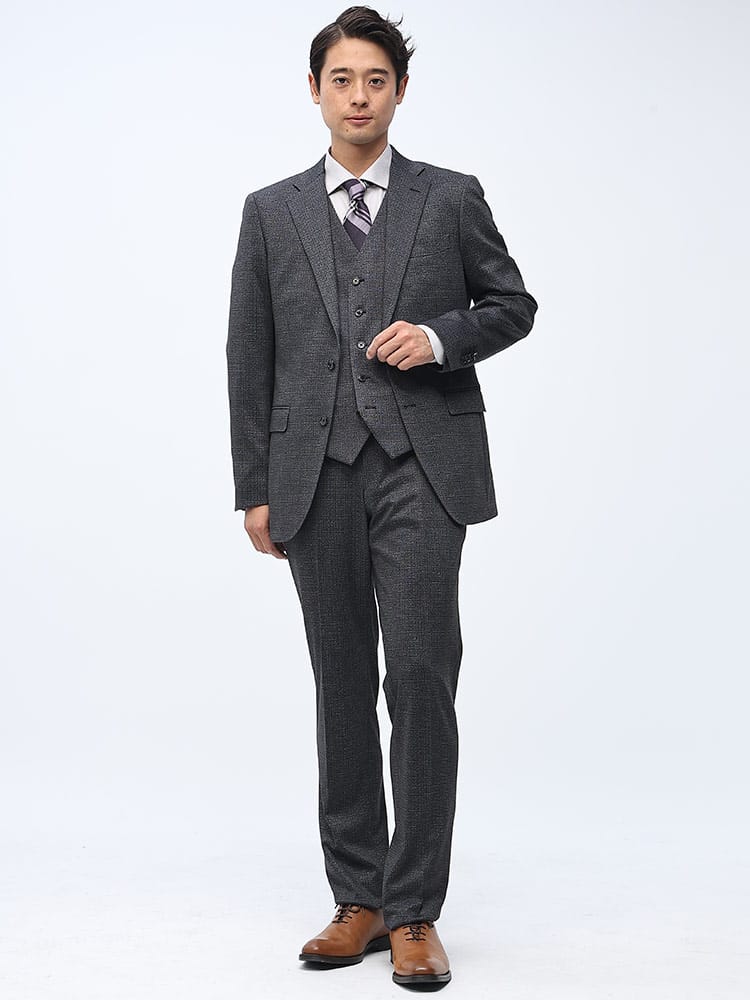 素材 :【ダークグレー】[表地(A)]ポリエステル84% レーヨン11% ポリウレタン5% [表地(B)]ポリエステル82% レーヨン11% ポリウレタン7% [裏地]ポリエステル100% [ベスト裏地]ポリエステル100%【ブラック】[表地(A)]ポリエステル75% レーヨン20% ポリウレタン5% [表地(B)]ポリエステル82% レーヨン11% ポリウレタン7% [裏地]ポリエステル100% [ベスト裏地]ポリエステル100%【ネイビー】[表地(A)]ポリエステル84% レーヨン11% ポリウレタン5% [表地(B)]ポリエステル75% レーヨン20% ポリウレタン5% [裏地]ポリエステル100% [ベスト裏地]ポリエステル100%