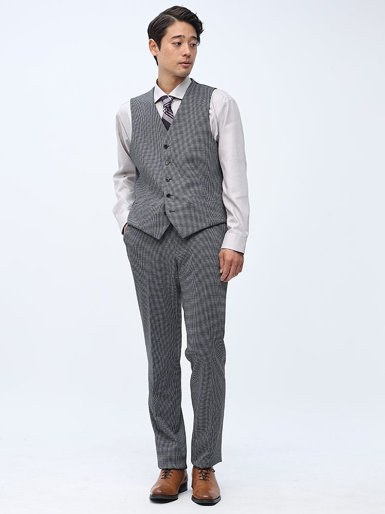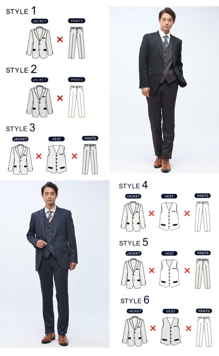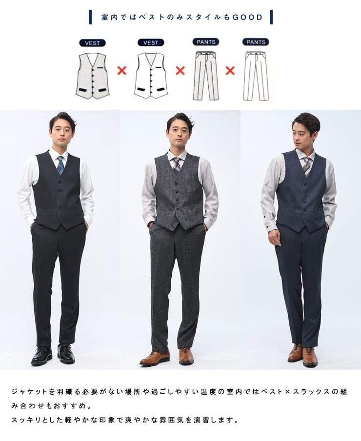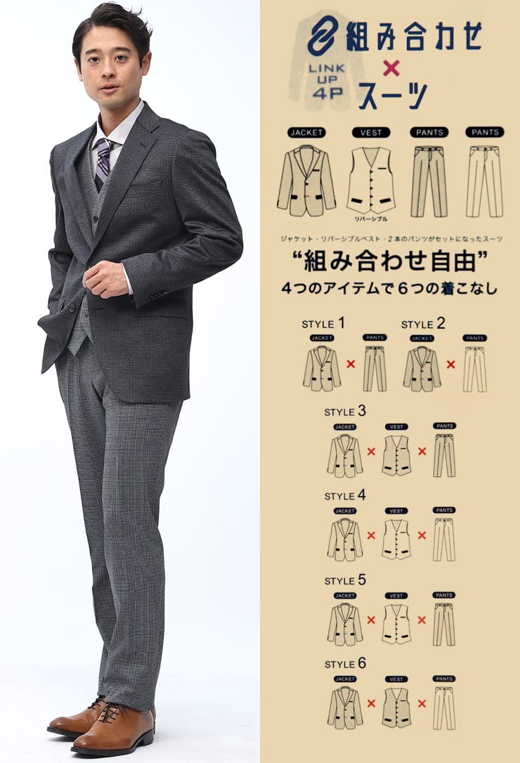 4つのアイテムで6つの着こなしが出来る「組み合わせ×スーツ」の ベスト付き シングル ツーパンツ スーツです。ジャケットとベスト、2パンツのセットです。ベストはリバーシブルデザインで2通りのデザインをお楽しみいただけます。毎日着るビジネスマンには嬉しいパンツは2パンツです。ビジネスからフォーマルまで幅広いシーンに活躍するアイテムです。