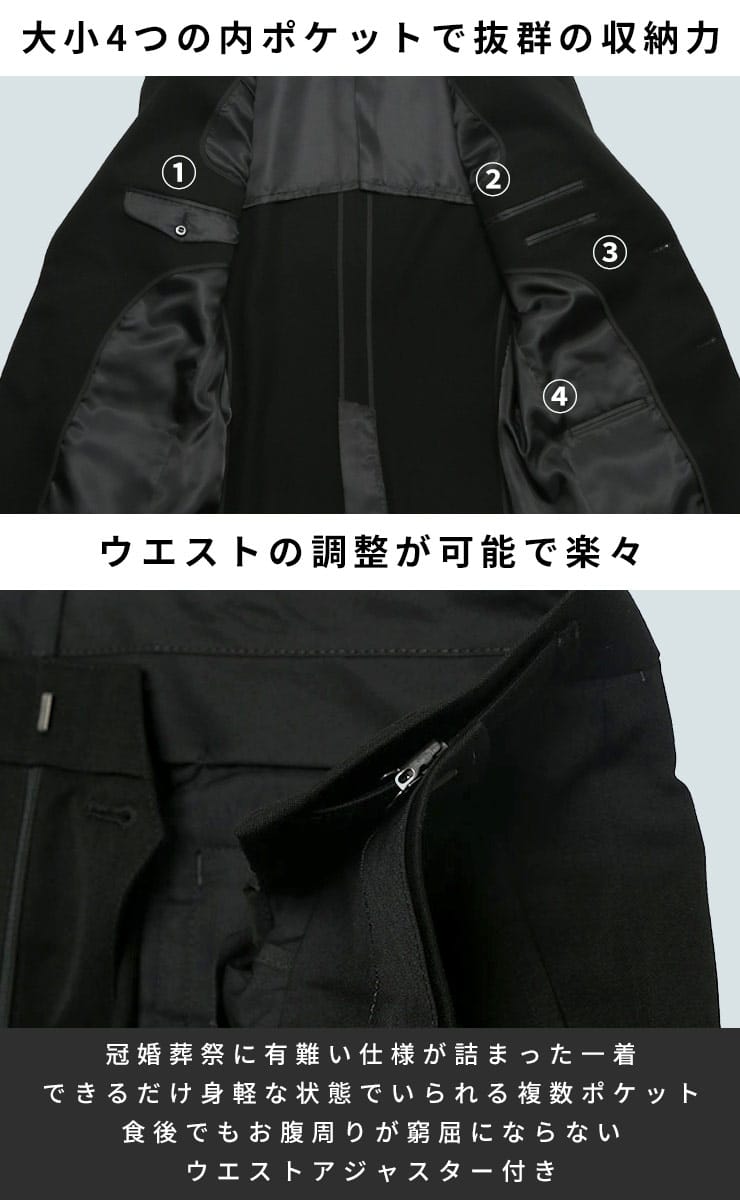 仕様 :ジャケット外側ポケット数×3つ / 内側ポケット数×4つ / シングル2つボタン/ 背抜き / セッパタイプ / 額縁あり / センターベント / スラックス外側ポケット数×4つ / ジップフライ / ワンタック / ウエスト調節アジャスター / 抗菌防臭 / 撥水・撥油加工 / 埃がつきにくい
