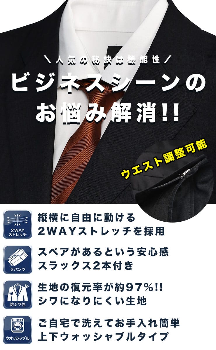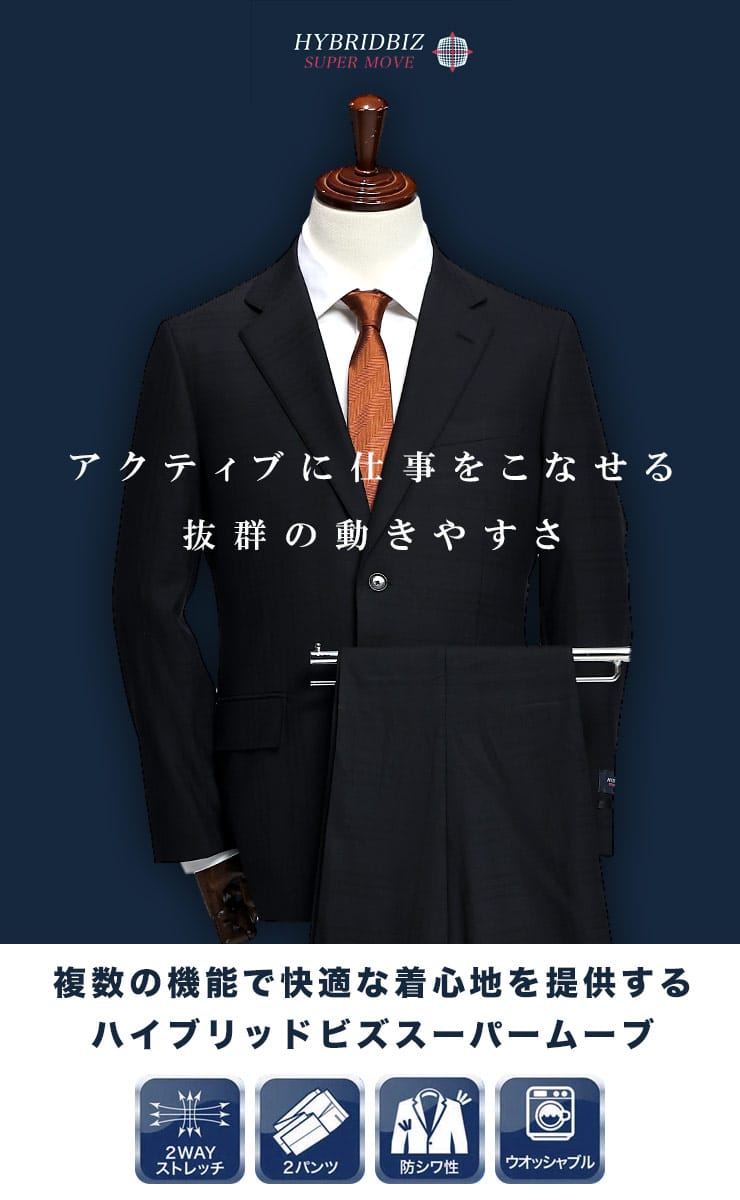 SUPERMOVE シングル 2ツ釦 ウエストアジャスター ツーパンツ スーツは、動きやすさと快適さを追求したスーツです。ウエストアジャスター機能でフィット感を調整可能。上下ウォッシャブルでお手入れも簡単です。ツーパンツ仕様で、ビジネスシーンにおける耐久性と実用性を両立しています。
