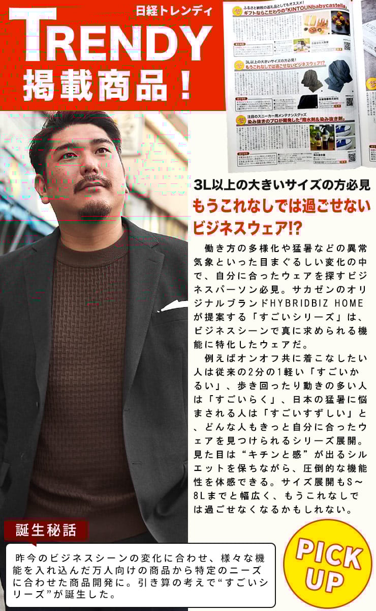 従来の商品より2倍伸びる「すごいらくシリーズ」のHYBRIDBIZハイブリッドビズのシングル 2ツ釦 ジャケット。快適さとスタイルを両立したメンズビジネスアウターです。テーラードジャケットとしての洗練されたデザインに加え、着用時の動きやすさを考慮し、ストレッチ素材を使用しています。外側ポケットが3つあり、携帯電話や小物などの収納に便利です。さらに内側ポケットが2つ装備されており、大切な書類や貴重品をしっかり保管できます。シングル2つボタンは、エレガントな印象を与えながらも、自然な動きをサポートします。半裏仕様なので、通気性も良く、長時間の着用でも快適です。サイドベンツとセッパタイプのデザインは、よりスマートなシルエットを演出します。また、額縁なしのスタイリングで、モダンかつミニマルな印象を与えます。HYBRIDBIZハイブリッドビズのストレッチ2ツ釦ジャケットは、ビジネスシーンにふさわしい品格を備えながら、快適な着心地を提供します。どんなシーンにも対応できる万能なアウターです。