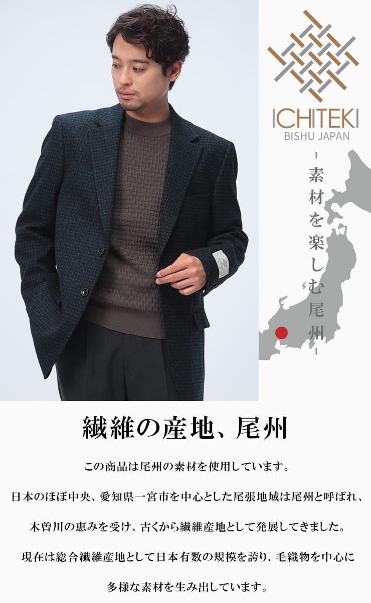 古来からの伝統を引き継ぎ、現代のシルエットの仕立て上げた[BISHU JAPAN ICHITEKI]を掲げた繊維の産地尾州の素材を使用したジャケット。ジャパンファブリックのシングル2つボタンジャケットは、上質な尾州繊維を使用したメンズビジネスアウターです。ウールとカシミアを混在させた生地を採用し、着心地、肌触りも一級品の洗練されたテーラードデザインが特長で、モダンでスタイリッシュな印象を演出します。このジャケットは、忙しいビジネスマンにぴったりな機能性と快適性を兼ね備えています。尾州繊維は優れた耐久性と通気性を持ち、長時間の着用でも快適な着心地を提供します。さまざまなシーンで活躍し、ビジネスシーンからフォーマルなイベントまで幅広い場面で活用できる頼れる一着です。2つボタンのデザインは、シンプルでクラシックな印象を与え、ビジネススーツのようなフォーマルな雰囲気を演出します。同時に、カジュアルな装いにも合わせやすく、着こなしの幅を広げます。