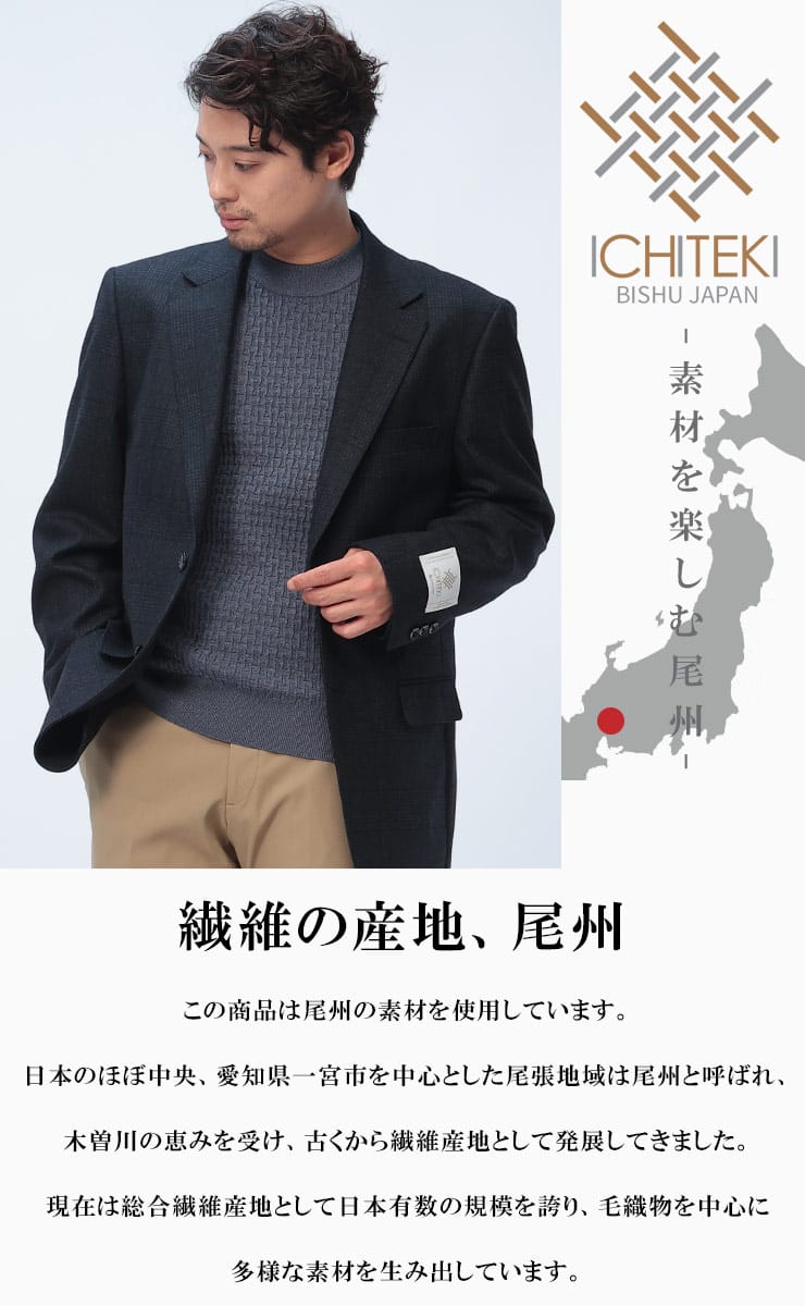 古来からの伝統を引き継ぎ、現代のシルエットの仕立て上げた[BISHU JAPAN ICHITEKI]を掲げた繊維の産地尾州の素材を使用したジャケット。ジャパンファブリックのシングル2つボタンジャケットは、上質な尾州繊維を使用したメンズビジネスアウターです。ウールとカシミアを混在させた生地を採用し、着心地、肌触りも一級品の洗練されたテーラードデザインが特長で、モダンでスタイリッシュな印象を演出します。このジャケットは、忙しいビジネスマンにぴったりな機能性と快適性を兼ね備えています。尾州繊維は優れた耐久性と通気性を持ち、長時間の着用でも快適な着心地を提供します。さまざまなシーンで活躍し、ビジネスシーンからフォーマルなイベントまで幅広い場面で活用できる頼れる一着です。2つボタンのデザインは、シンプルでクラシックな印象を与え、ビジネススーツのようなフォーマルな雰囲気を演出します。同時に、カジュアルな装いにも合わせやすく、着こなしの幅を広げます。