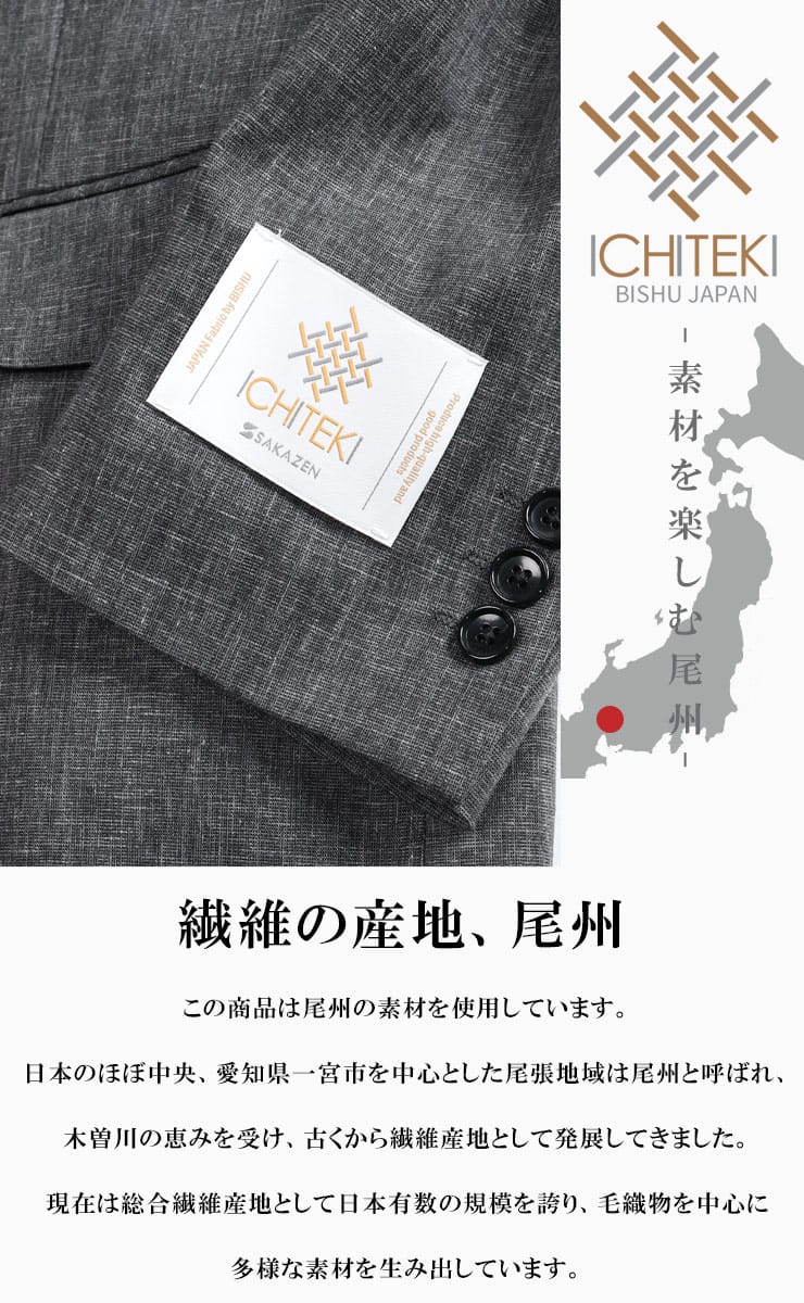 古来からの伝統を引き継ぎ、現代のシルエットの仕立て上げた[BISHU JAPAN ICHITEKI]を掲げた繊維の産地尾州の素材を使用したジャケット。ジャパンファブリックのシングル2つボタンジャケットは、上質な尾州繊維を使用したメンズビジネスアウターです。洗練されたテーラードデザインが特長で、モダンでスタイリッシュな印象を演出します。このジャケットは、忙しいビジネスマンにぴったりな機能性と快適性を兼ね備えています。尾州繊維は優れた耐久性と通気性を持ち、長時間の着用でも快適な着心地を提供します。さまざまなシーンで活躍し、ビジネスシーンからフォーマルなイベントまで幅広い場面で活用できる頼れる一着です。2つボタンのデザインは、シンプルでクラシックな印象を与え、ビジネススーツのようなフォーマルな雰囲気を演出します。同時に、カジュアルな装いにも合わせやすく、着こなしの幅を広げます。