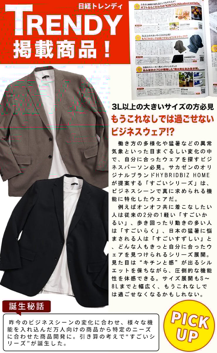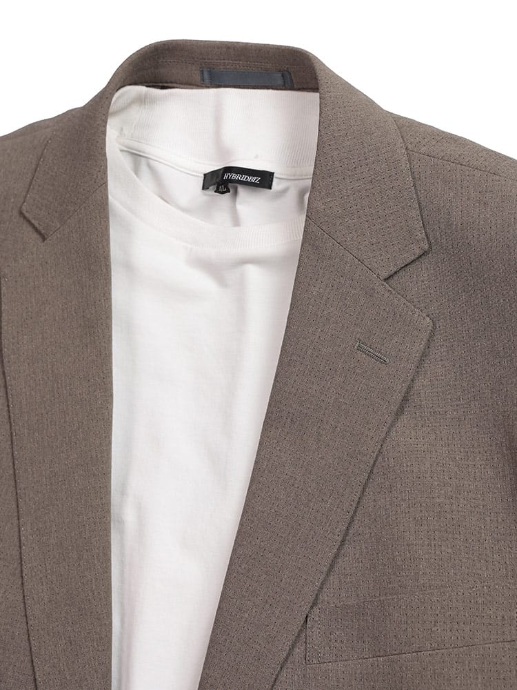 まるで空気!HYBRIDBIZの「すごいかるい」メッシュジャケットで、真夏も涼しく快適に。まるで空気のように軽い着心地と、抜群の通気性を誇るメッシュ素材で、暑い季節も快適に過ごせるジャケットです。軽量でありながら、きちんと感のあるシルエットはキープ。ストレッチ性も高く、動きやすさも抜群です。シングル2つボタンのデザインは、ビジネスシーンに最適なスマートな印象を与えます。外側と内側に複数のポケットを備え、機能性も充実。半裏仕様で通気性も良く、真夏でも涼しく快適に着用できます。KE5からKE8までの大きいサイズ展開で、幅広い体型の方に対応します。