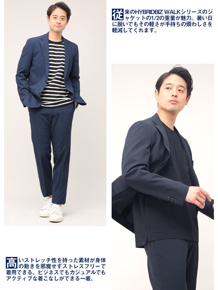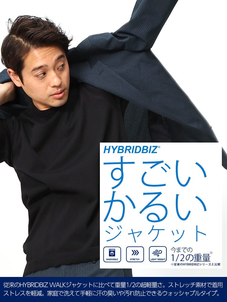 ビジネスシーンに新たな風を吹き込む、HYBRIDBIZのすごいかるいストレッチシングル2つ釦ジャケット。まるで着ていることを忘れるほどの軽さと、優れたストレッチ性で、一日中快適に過ごせます。スタイリッシュなデザインながらも、きちんと感をキープ。ビジネスシーンはもちろん、カジュアルな装いにもマッチする、汎用性の高さが魅力です。素材へのこだわりとして、軽量でシワになりにくいポリエステル素材を採用。半裏仕様で通気性も抜群。汗ばむ季節でも爽やかに過ごせます。幅広いサイズ展開で自分にぴったりのサイズが見つかります。お手入れ方法はご家庭で洗濯可能なのでお手入れも簡単です。