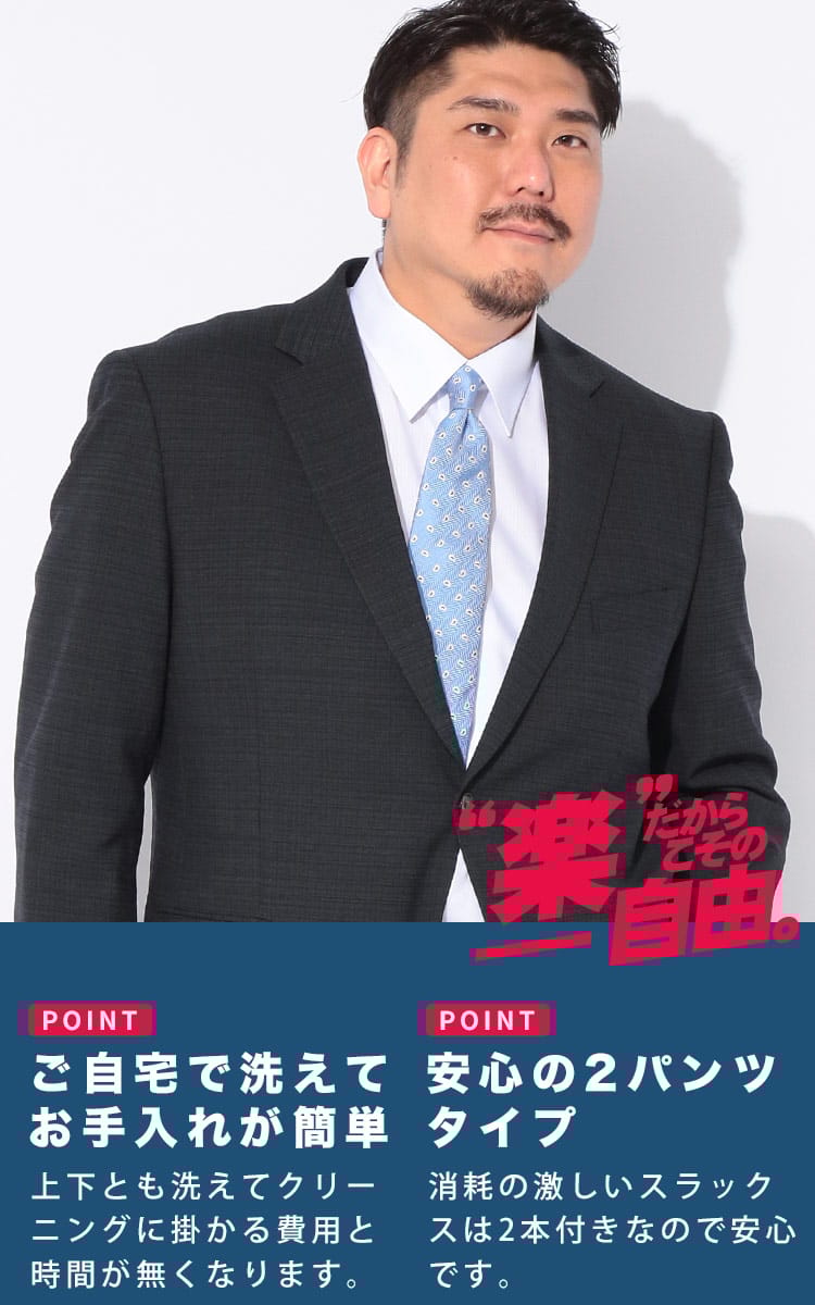 ビジネスマンから絶大な信頼を得るHYBRIDBIZ(ハイブリッドビズ)より、体型を問わずスマートに装える、機能性抜群の大きいサイズ専用2パンツスーツが登場。最大の魅力は、縦横に伸びる2WAYストレッチと、お腹周りを楽にするウエストアジャスター。動きやすさと快適なフィット感を両立しました。ウール混の品格漂う風合いながら、上下ウォッシャブル対応。自宅で手軽に洗えるため、汗や汚れを気にせず毎日清潔に着用できます。さらに、摩耗しやすいパンツが2本付いた2パンツセット&防シワ加工で、ハードな出張や外回りも安心。機能性とフォーマルな美しさを兼ね備えた、働く男の勝負服です。