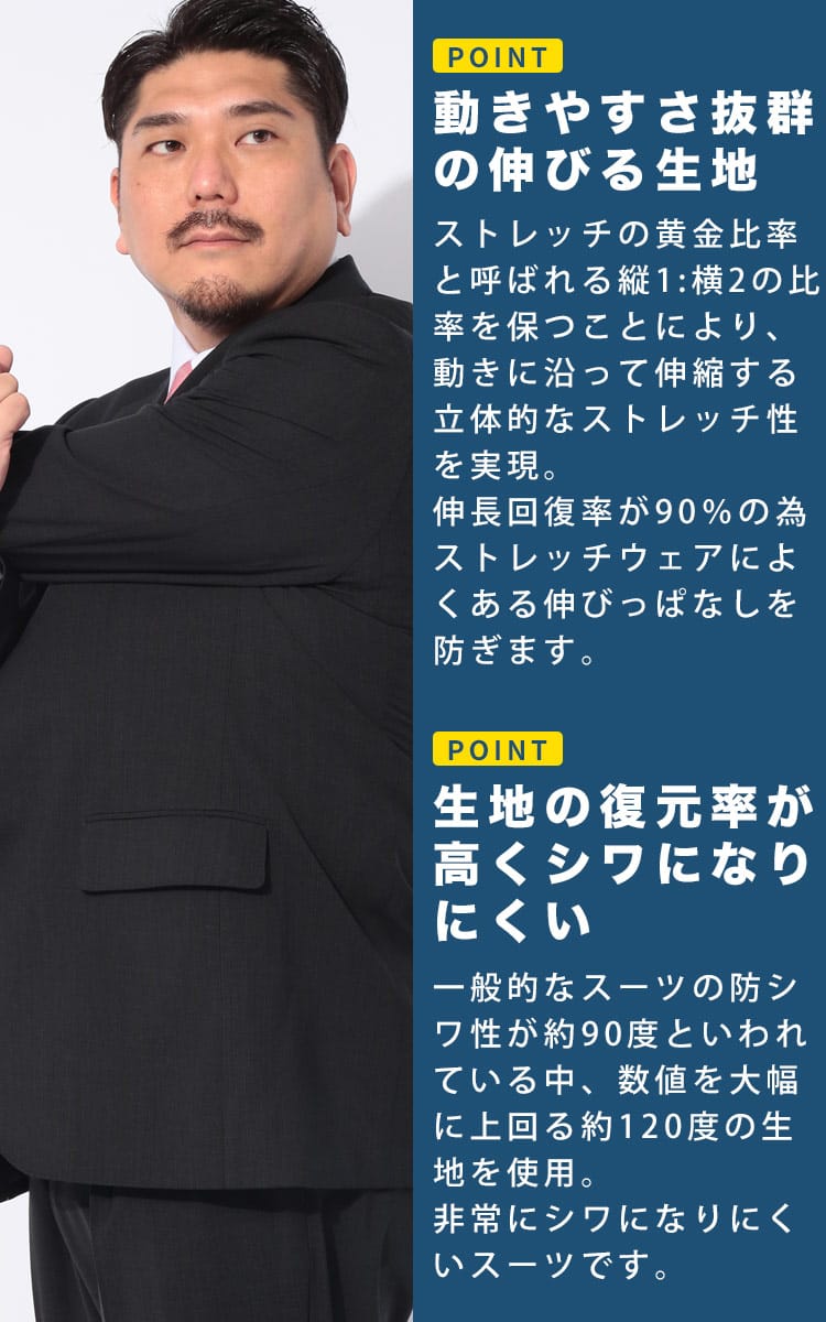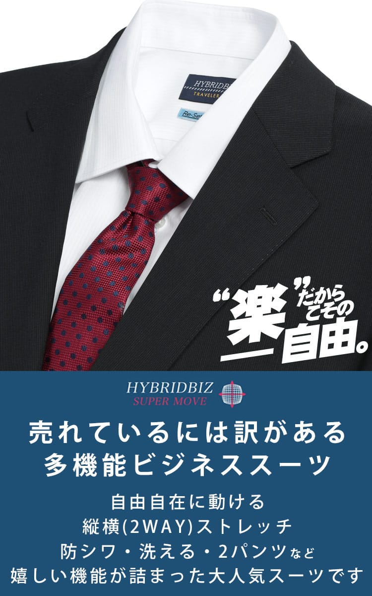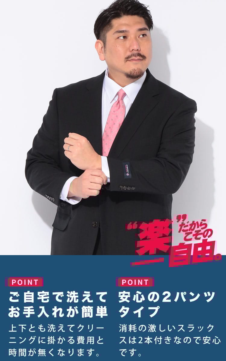 ビジネスマンの強い味方、HYBRIDBIZ(ハイブリッドビズ)から、機能性と品格を両立した大きいサイズ専用の2パンツスーツが登場。最大の特長は、体の動きに柔軟にフィットする2WAYストレッチ。さらにウエストアジャスター搭載で、体型変化や食後の窮屈感もスマートに解消します。ウール混の贅沢な質感を保ちつつ、上下ウォッシャブル&防シワ性を備えているため、自宅で洗えて毎日のお手入れも簡単。常に清潔感のあるVゾーンをキープします。予備パンツ付きの2パンツ仕様で、ハードなビジネスシーンでも安心の耐久性。機能美と快適さを追求した、働く大人のための究極のセットアップです。