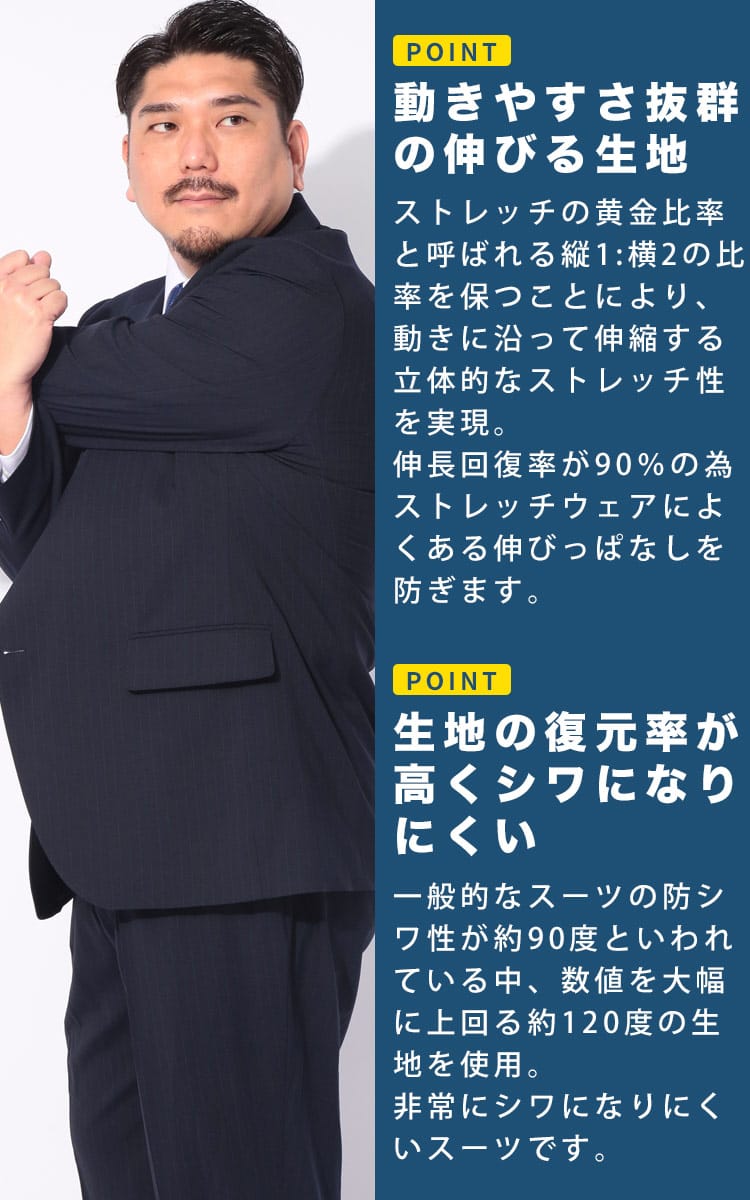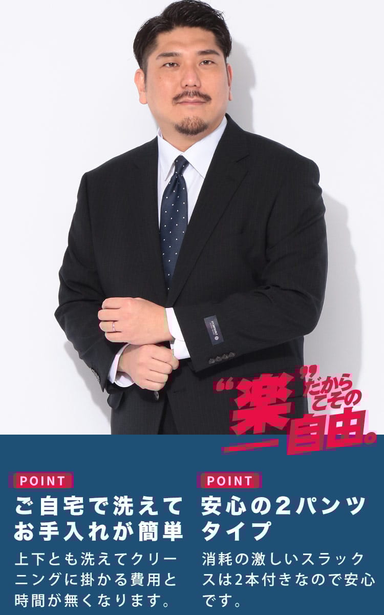 仕様 :ジャケット外側ポケット数×3つ / 内側ポケット数×4つ / パンツ外側ポケット数×4つ / シングル2つボタン / 背抜き / センターベント / セッパタイプ / 額縁あり / ワンタック / 2WAYストレッチ / ウエストストレッチ / 2パンツ / 防シワ性 / 上下ウォッシャブル