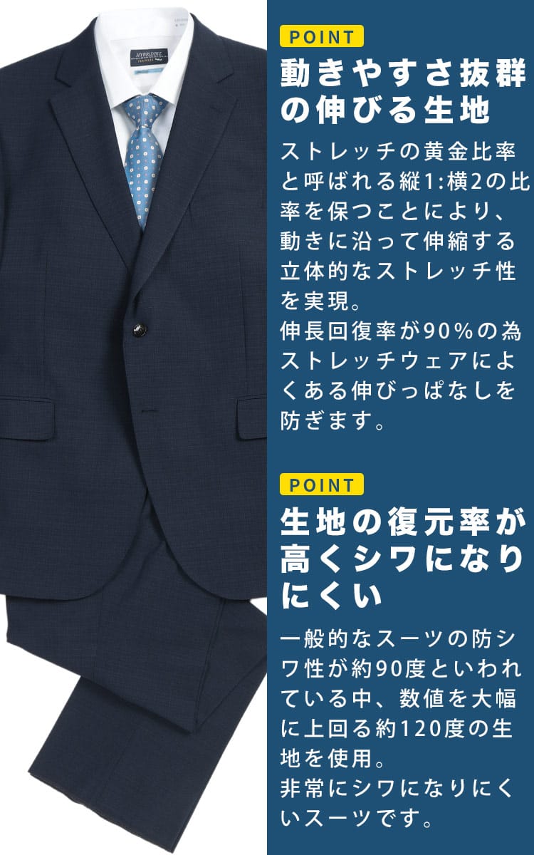 仕様 :ジャケット外側ポケット数×3つ / 内側ポケット数×4つ / パンツ外側ポケット数×4つ / シングル2つボタン / 背抜き / センターベント / セッパタイプ / 額縁あり / ワンタック / 2WAYストレッチ / ウエストストレッチ / 2パンツ / 防シワ性 / 上下ウォッシャブル