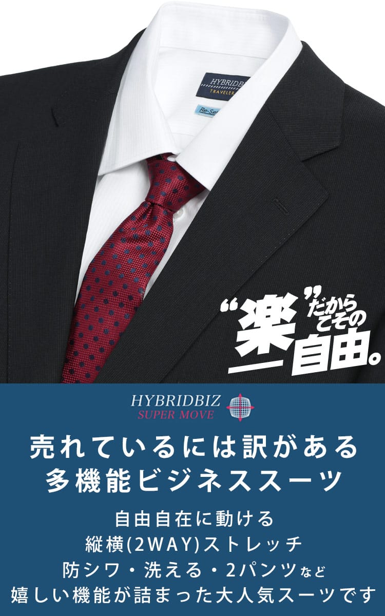 HYBRIDBIZの大きいサイズ向け2パンツスーツは、忙しいビジネスマンの強い味方です。縦横に伸びる2WAYストレッチ素材とウエストアジャスターにより、長時間の着用でも窮屈さを感じさせない最高の着心地を実現しました。スペアパンツ付きで消耗を抑えられるうえ、自宅で洗えるウォッシャブル仕様のため手入れも簡単。ビジネスからフォーマルまで幅広く着回せる、機能性と上品さを兼ね備えた、働く男性に最適な一着です。