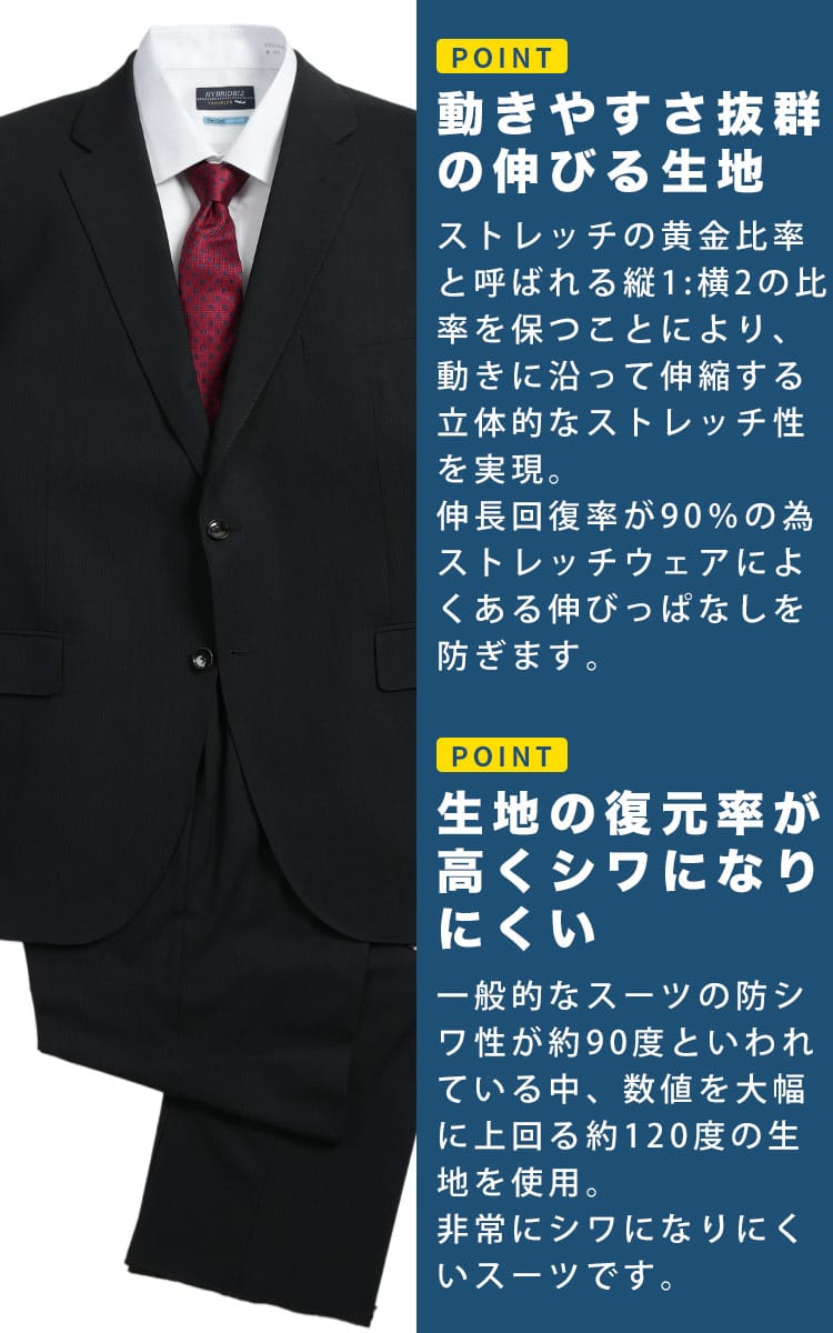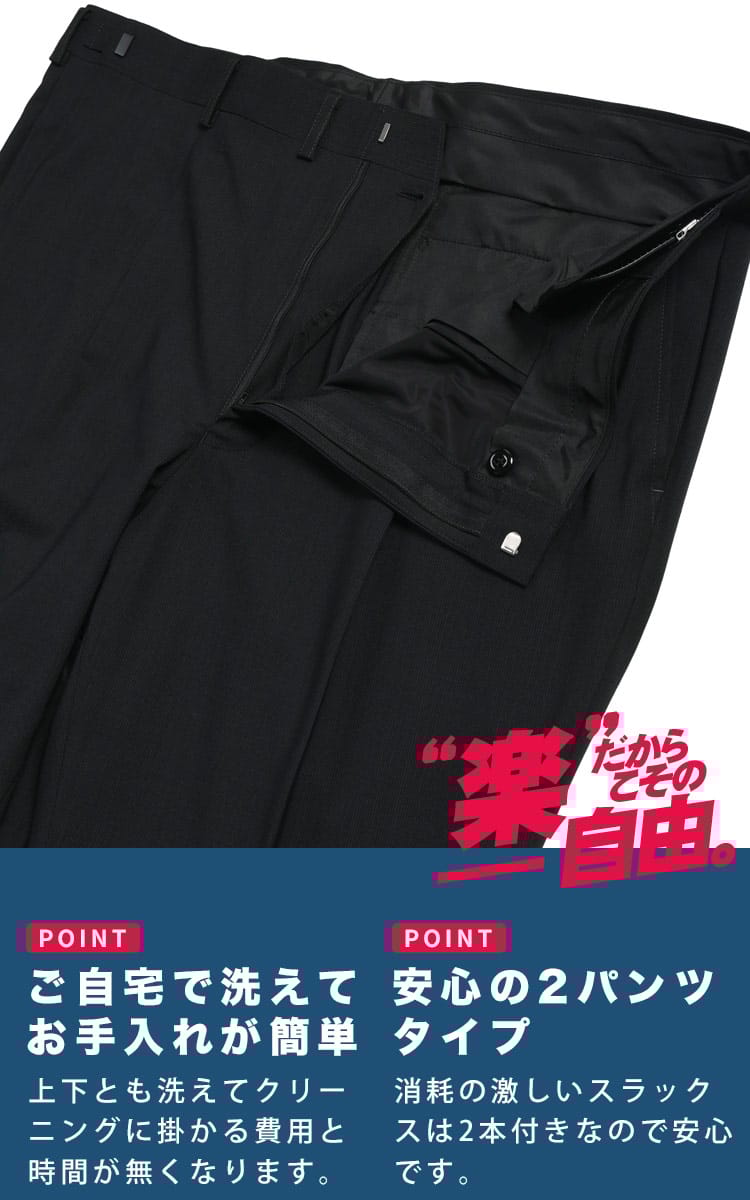 仕様 :ジャケット外側ポケット数×3つ / 内側ポケット数×4つ / パンツ外側ポケット数×4つ / シングル2つボタン / 背抜き / センターベント / セッパタイプ / 額縁あり / ワンタック / 2WAYストレッチ / ウエストストレッチ / 2パンツ / 防シワ性 / 上下ウォッシャブル