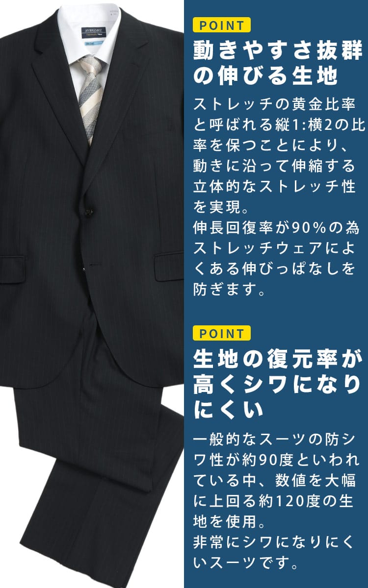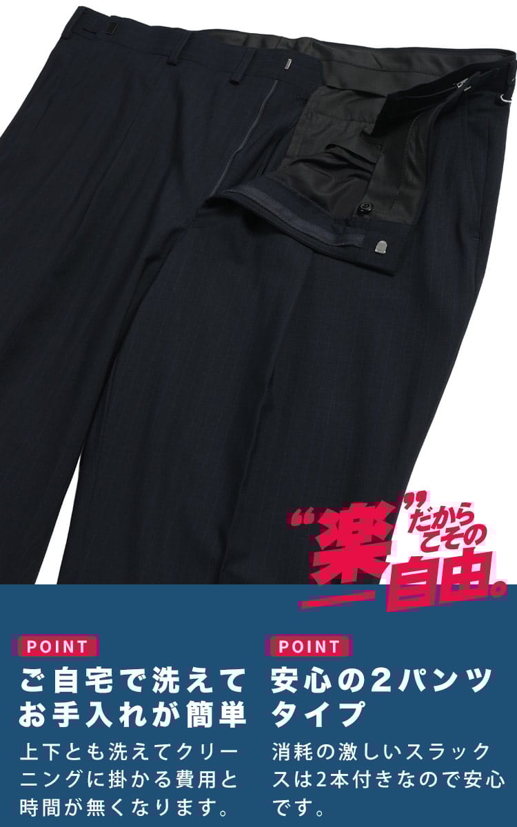 仕様 :ジャケット外側ポケット数×3つ / 内側ポケット数×4つ / パンツ外側ポケット数×4つ / シングル2つボタン / 背抜き / センターベント / セッパタイプ / 額縁あり / ワンタック / 2WAYストレッチ / ウエストストレッチ / 2パンツ / 防シワ性 / 上下ウォッシャブル