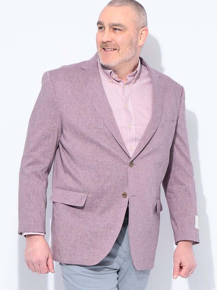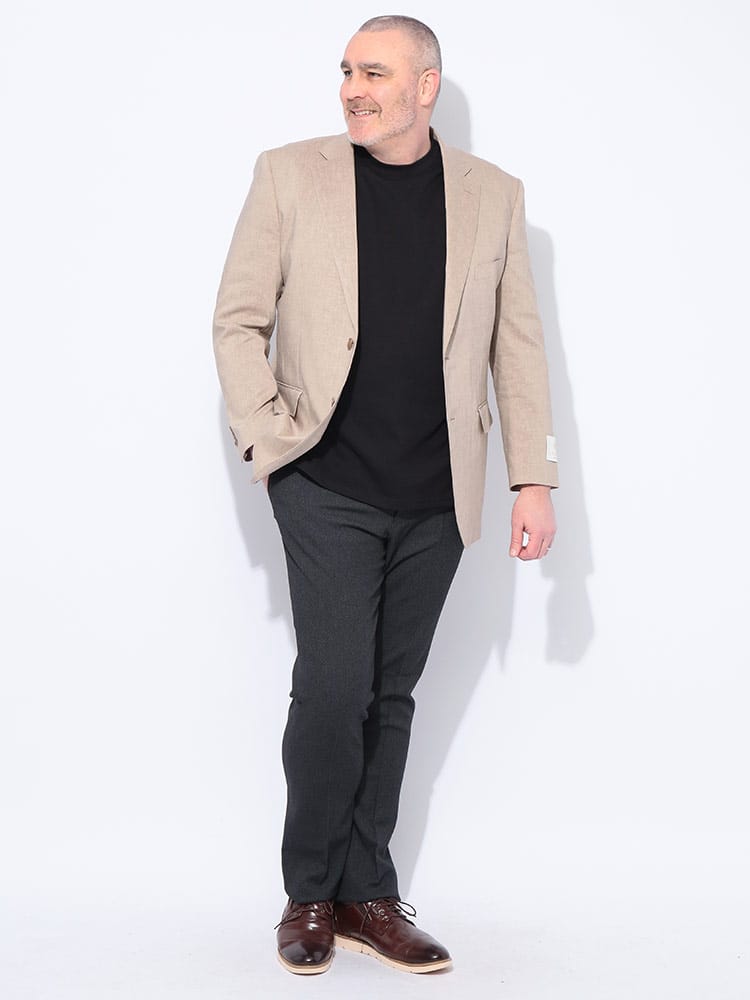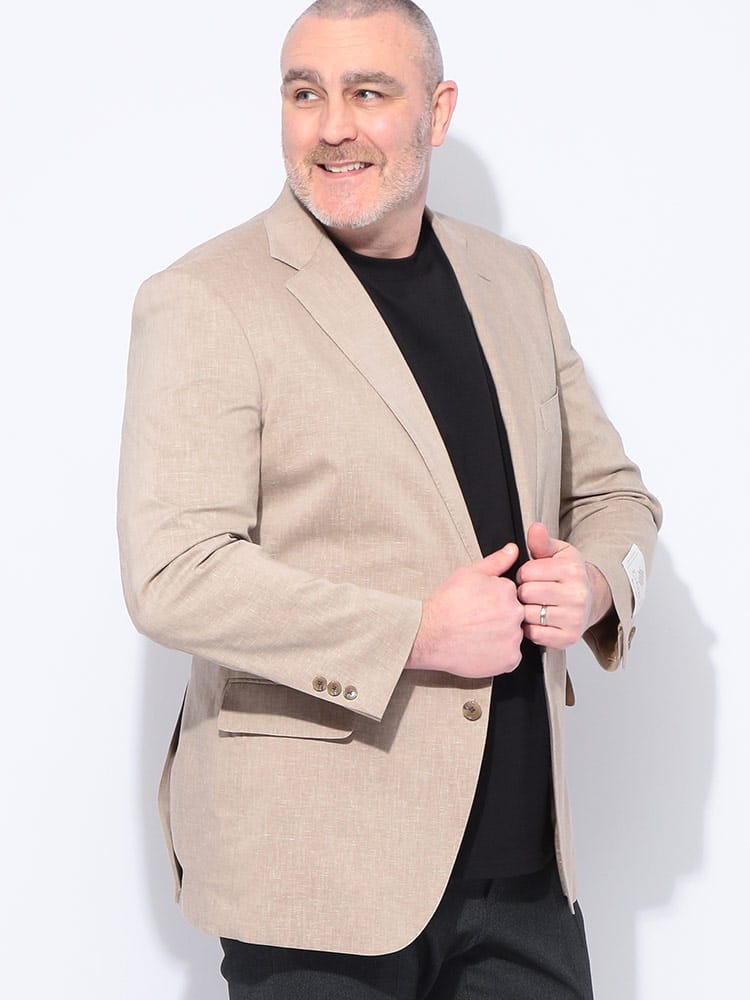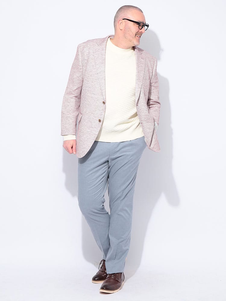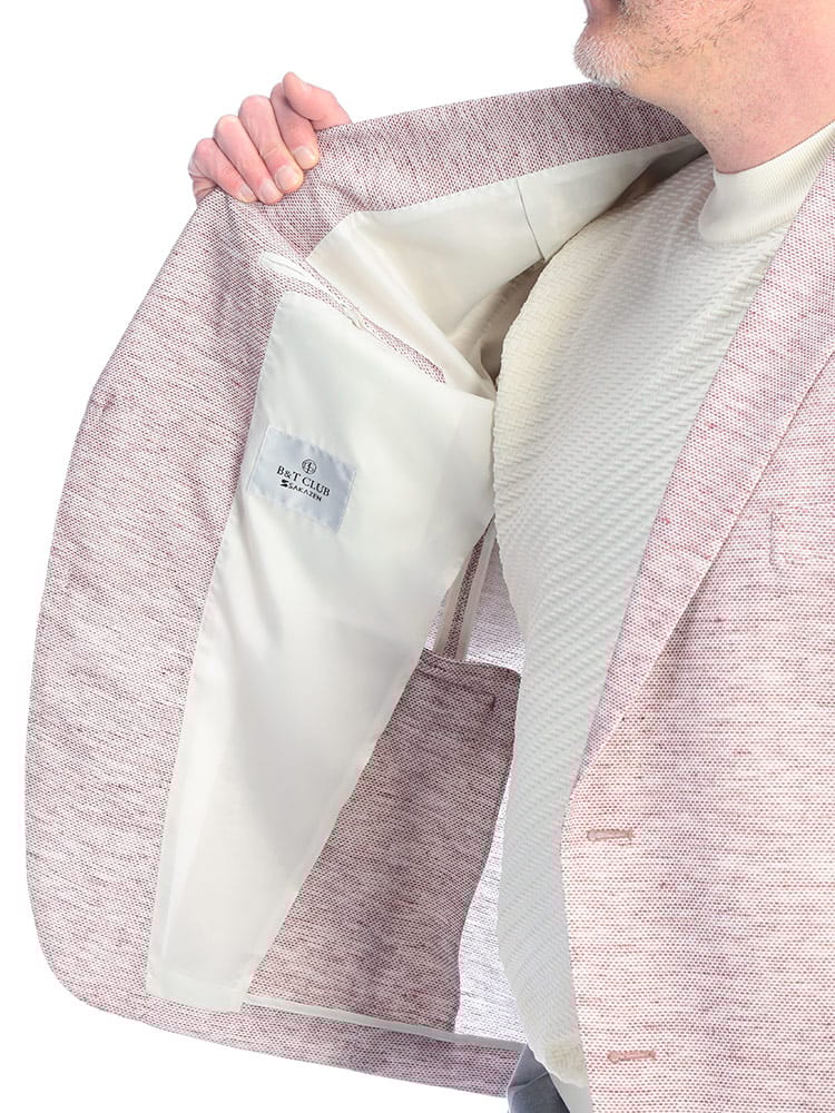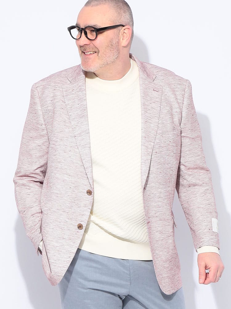 B&T CLUBのテーラードジャケットは、日本が誇るテキスタイルメーカー「イチテキ」の生地を使用した、上質な大人の一着です。麻をブレンドすることで、清涼感あふれる風合いと軽やかな着心地を実現しました。レッドは麻の素材感を活かしたナチュラルな質感、ベージュやライラックには形態回復性に優れた「SOLOTEX」を配合し、シワになりにくく美しいシルエットを保ちます。ネイビーは落ち着いた光沢があり、オンオフ問わず活躍します。大きいサイズ専門ブランドならではの絶妙な設計で、窮屈さを感じさせないスマートな装いを演出。春の装いに華を添える、きれいめカジュアルの決定版です。